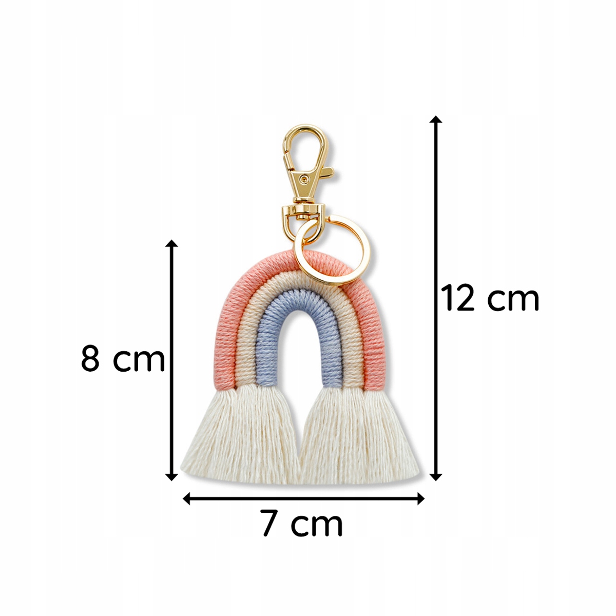 Piękny sznurkowy brelok z frędzelkami w kształcie tęczy w różowym, kremowym i niebieskim kolorze