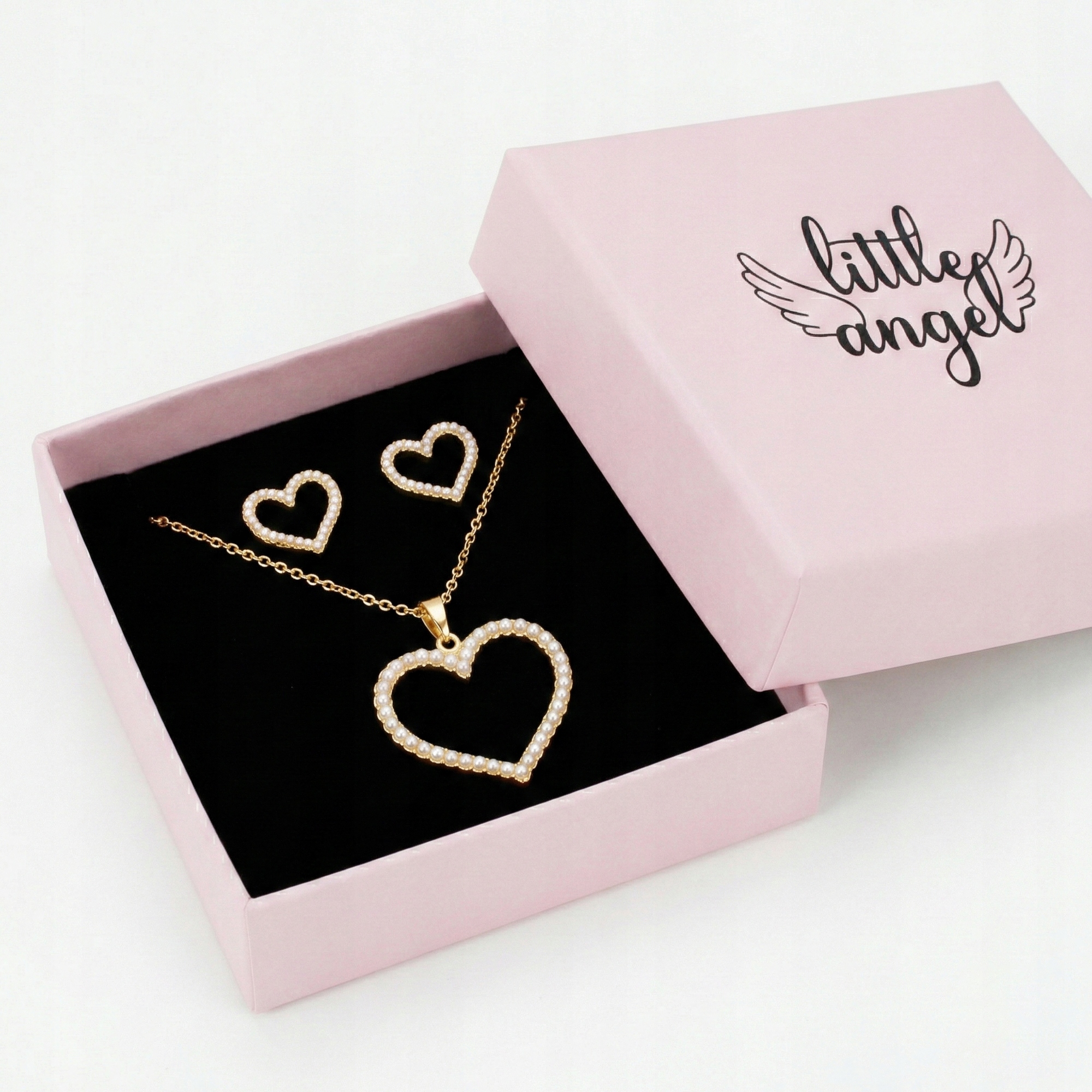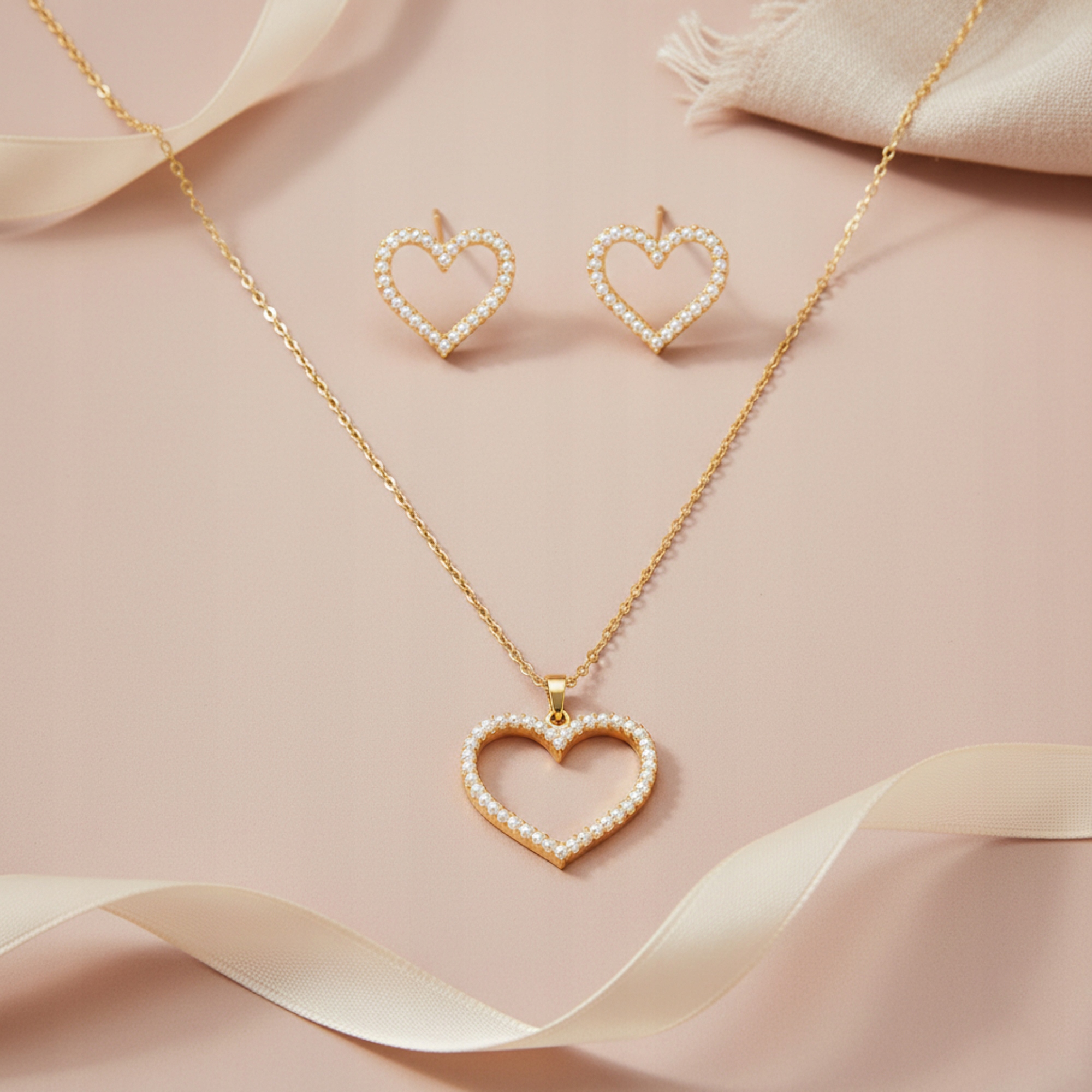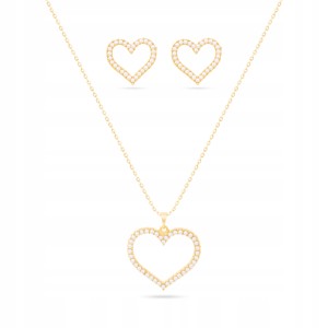 Komplet składa się z naszyjnika z zawieszką w kształcie serca oraz dopasowanych kolczyków, dzięki czemu tworzy spójną i elegancką całość.