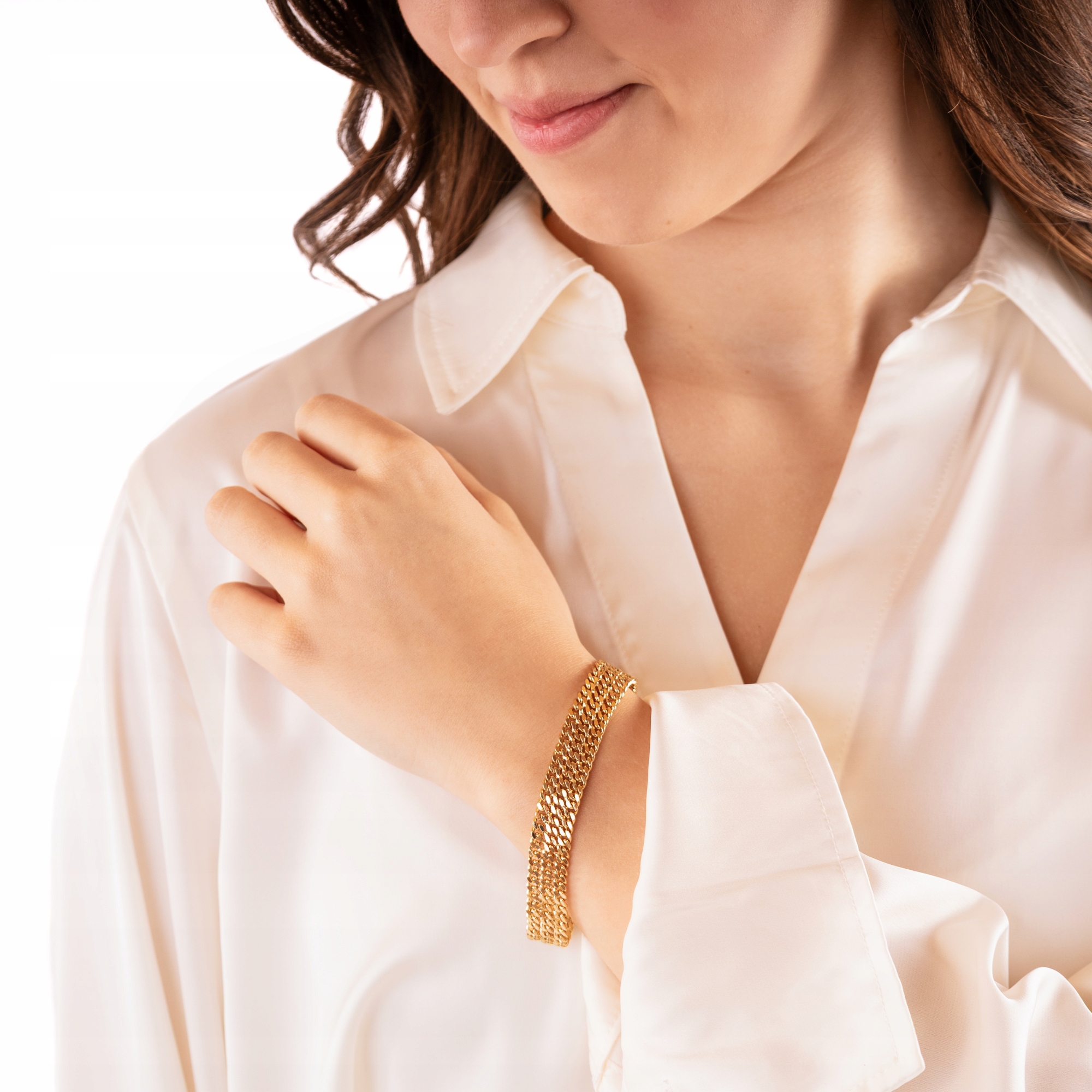 Klasyka, która nigdy nie wychodzi z mody. Bransoletka „Classic Grace” to propozycja dla kobiet ceniących minimalizm z nutą luksusu. Trzy rzędy drobnych ogniw w lśniącym złocie tworzą spójną całość, która doda klasy zarówno codziennym, jak i wieczorowym stylizacjom.