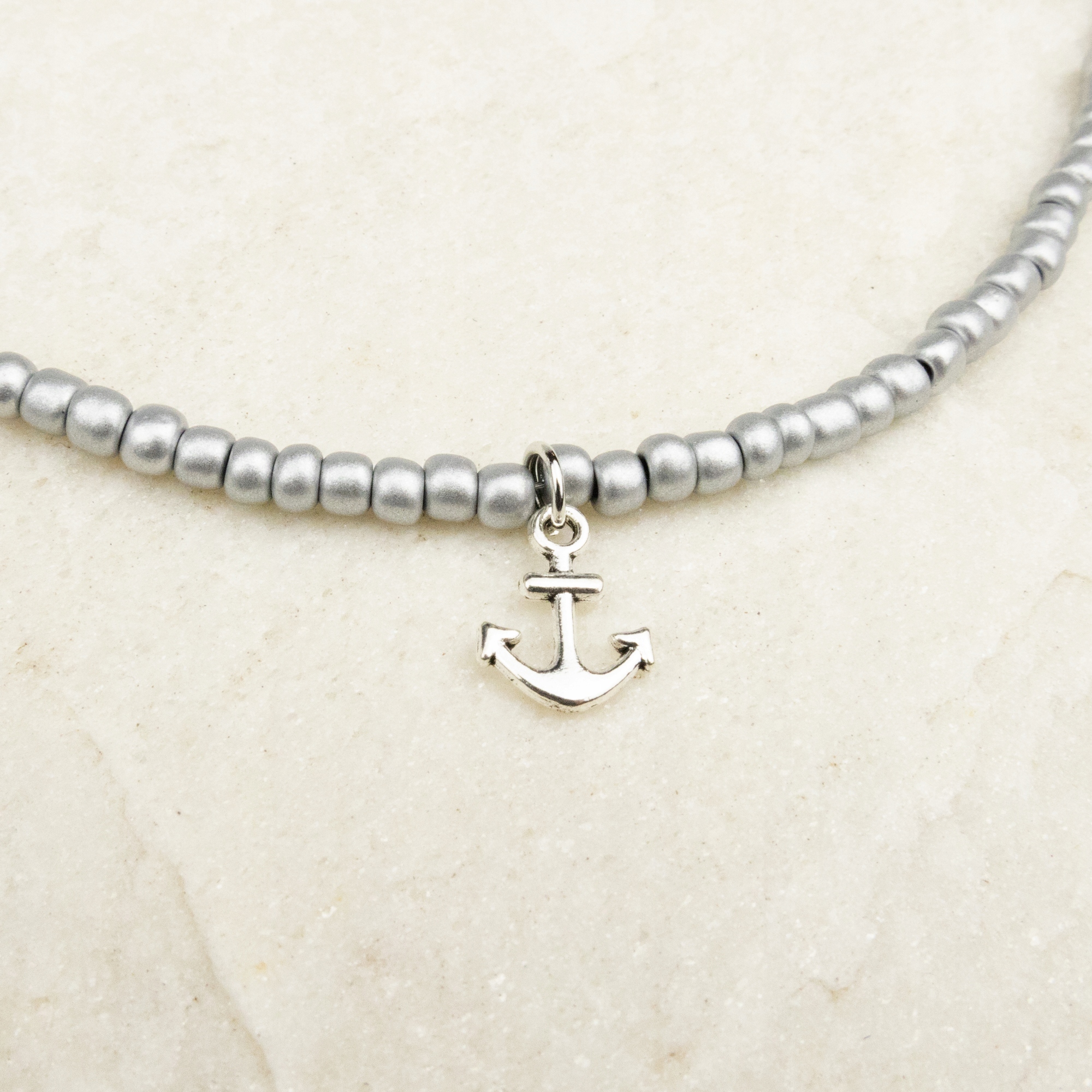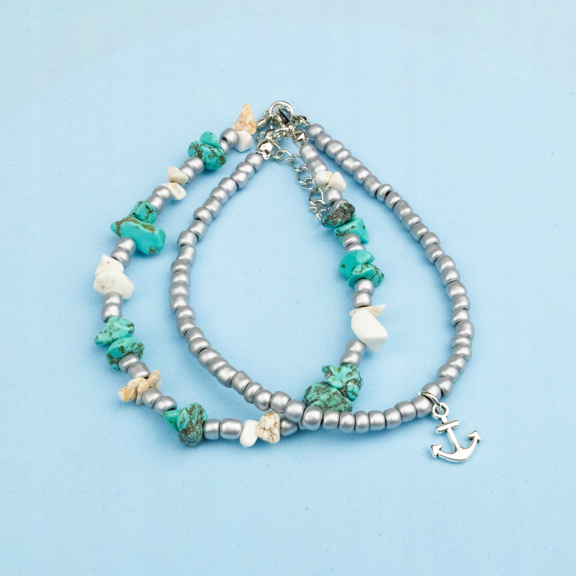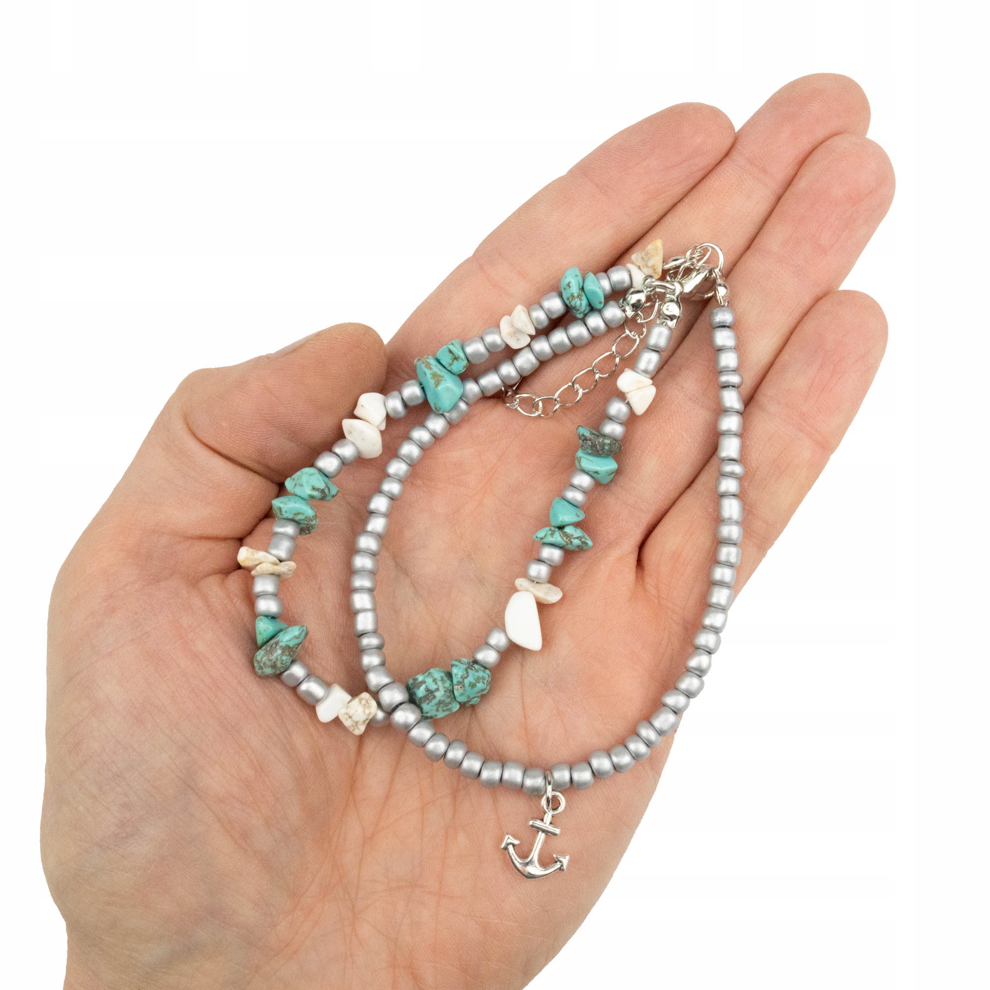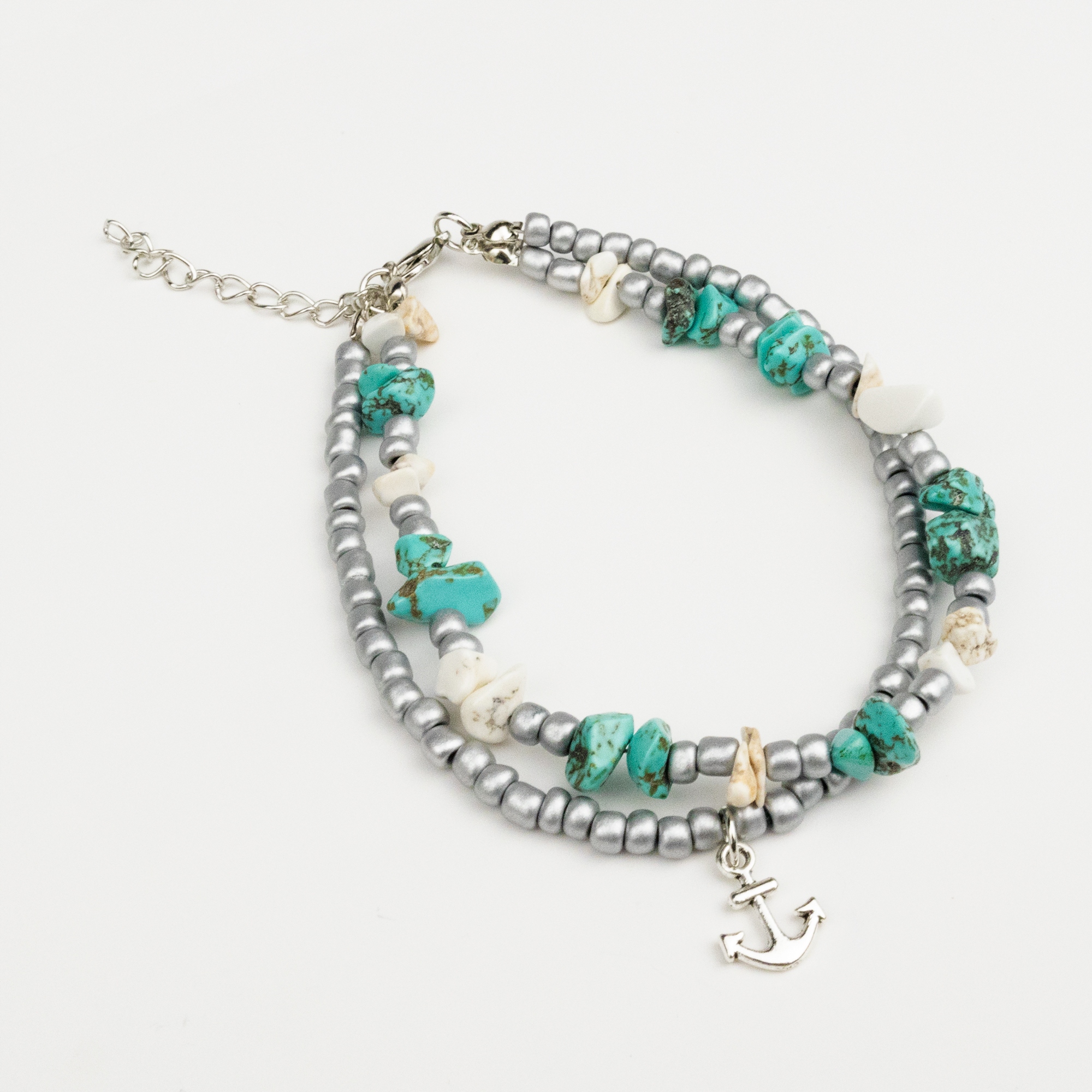 Podwójna bransoletka z koralikami i kamyczkami z zawieszką w kształcie kotwicy