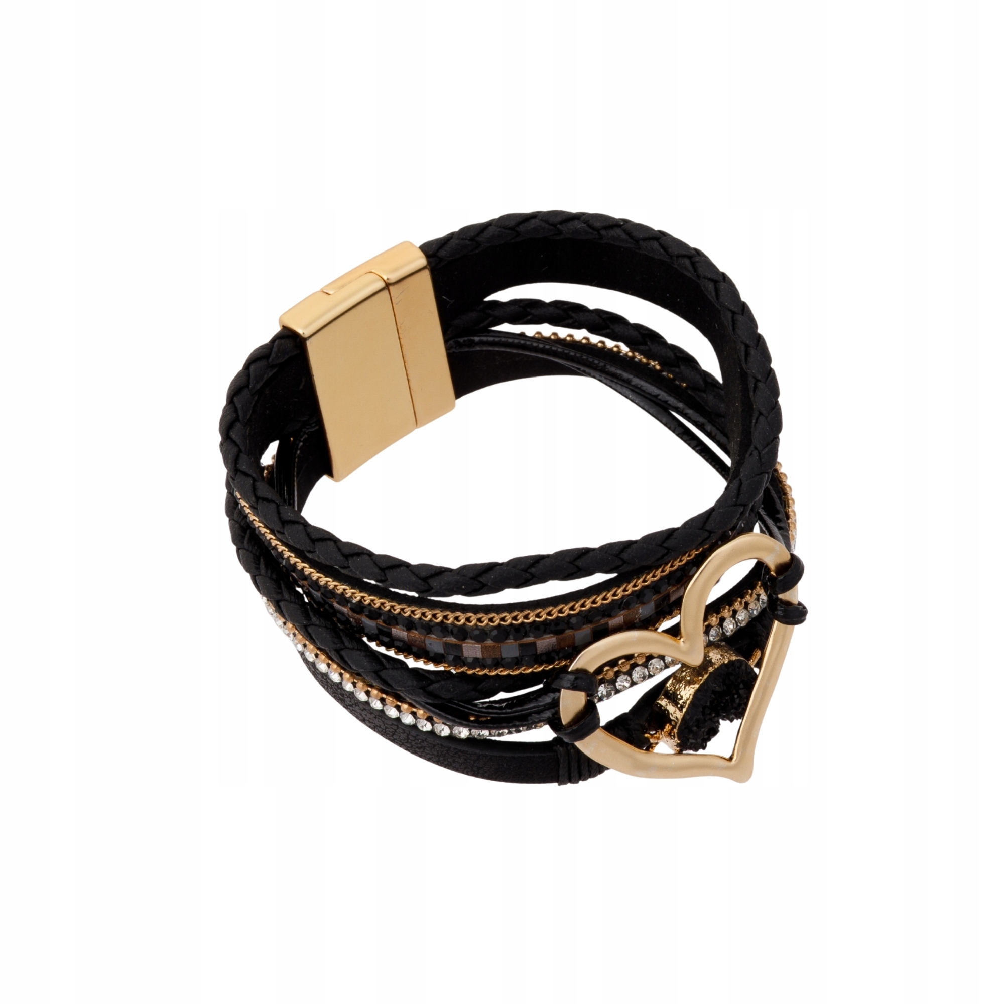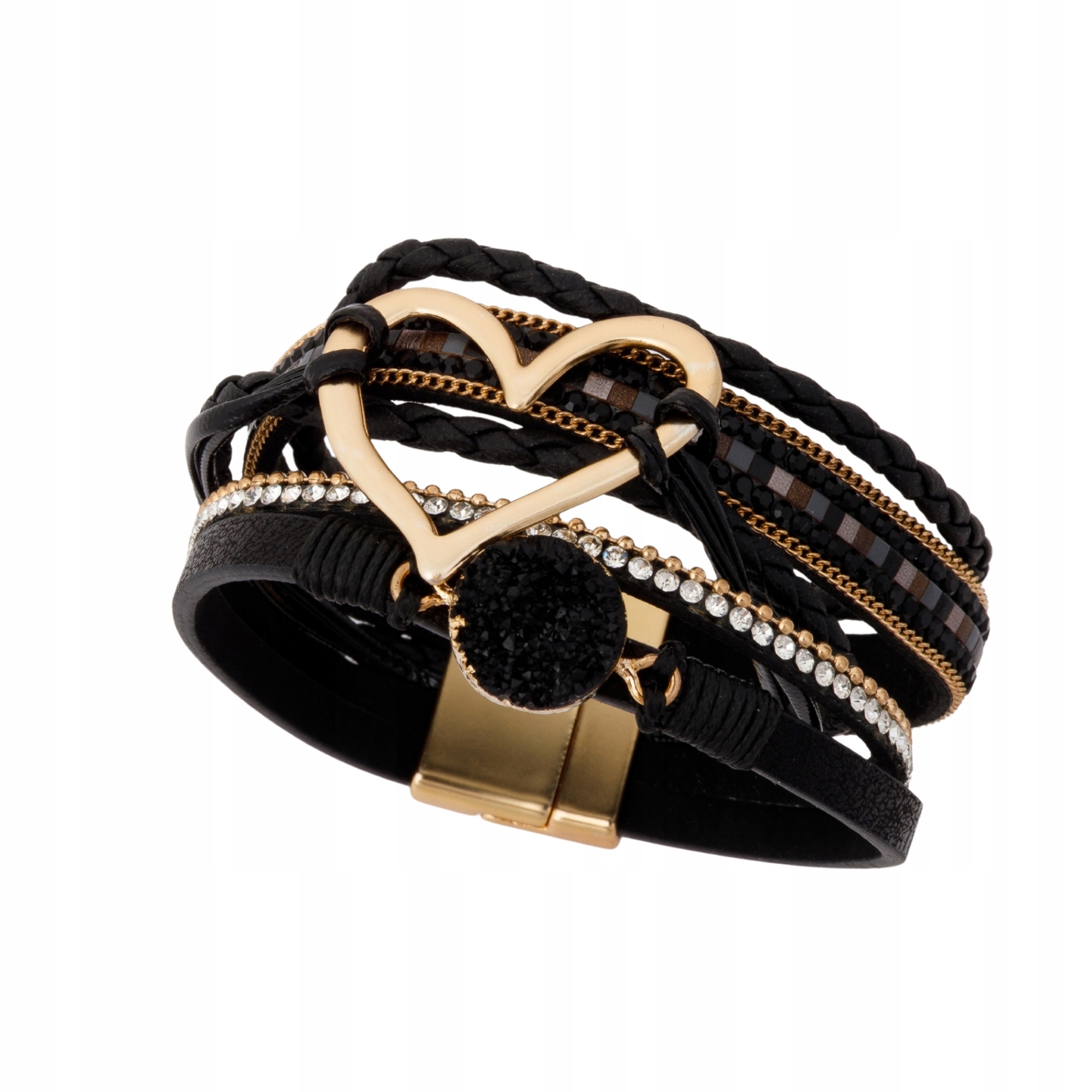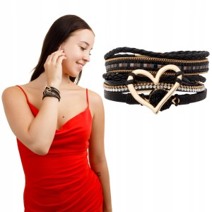 Bransoletka damska wielowarstwowa z sercem kryształkami rzemykami Czarna