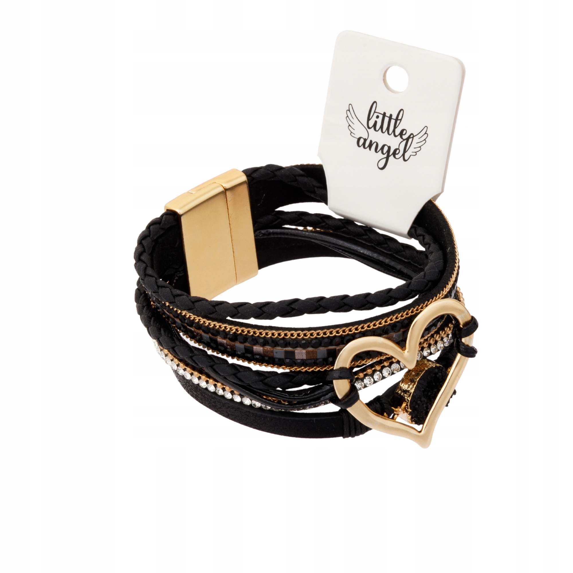 Podkreśl swoją kobiecość i styl! Ta elegancka czarna bransoletka od Little Angel to modny dodatek, który łączy w sobie plecioną skórę ekologiczną, połyskujące kryształki oraz złote serce – symbol miłości i subtelnej elegancji.