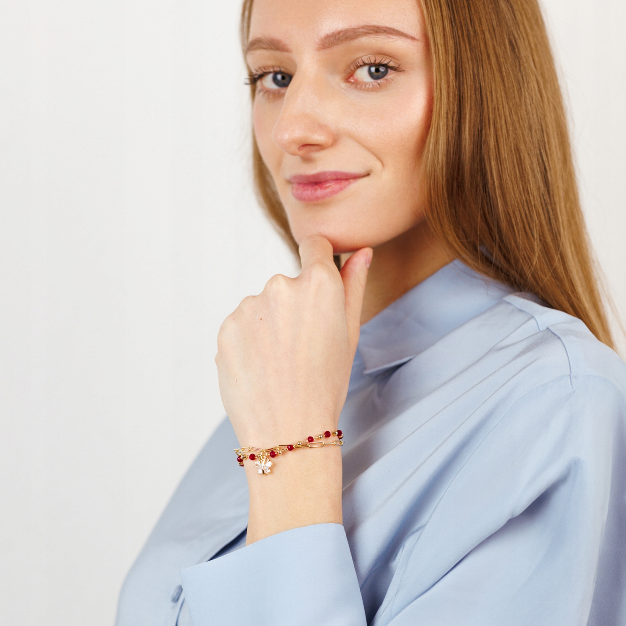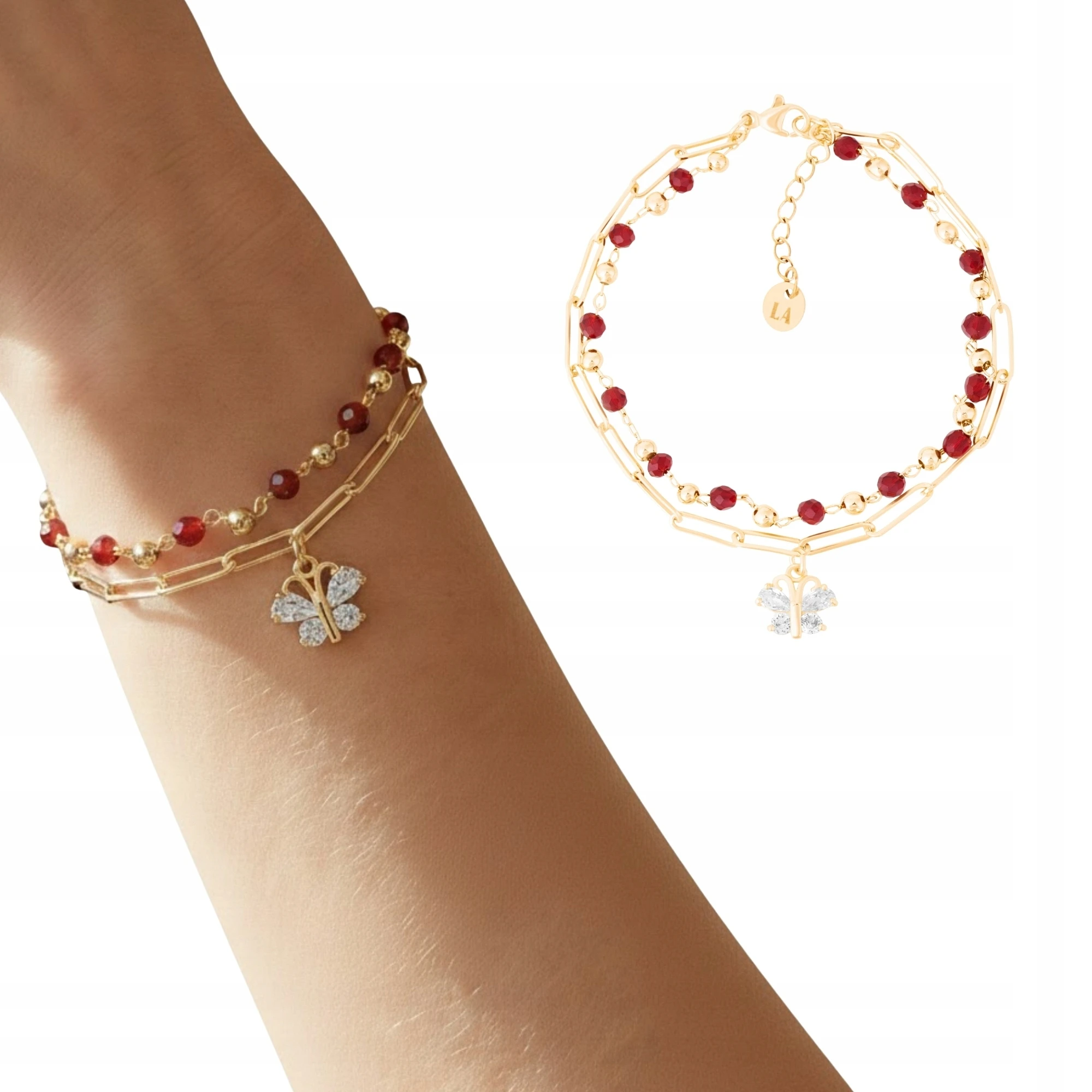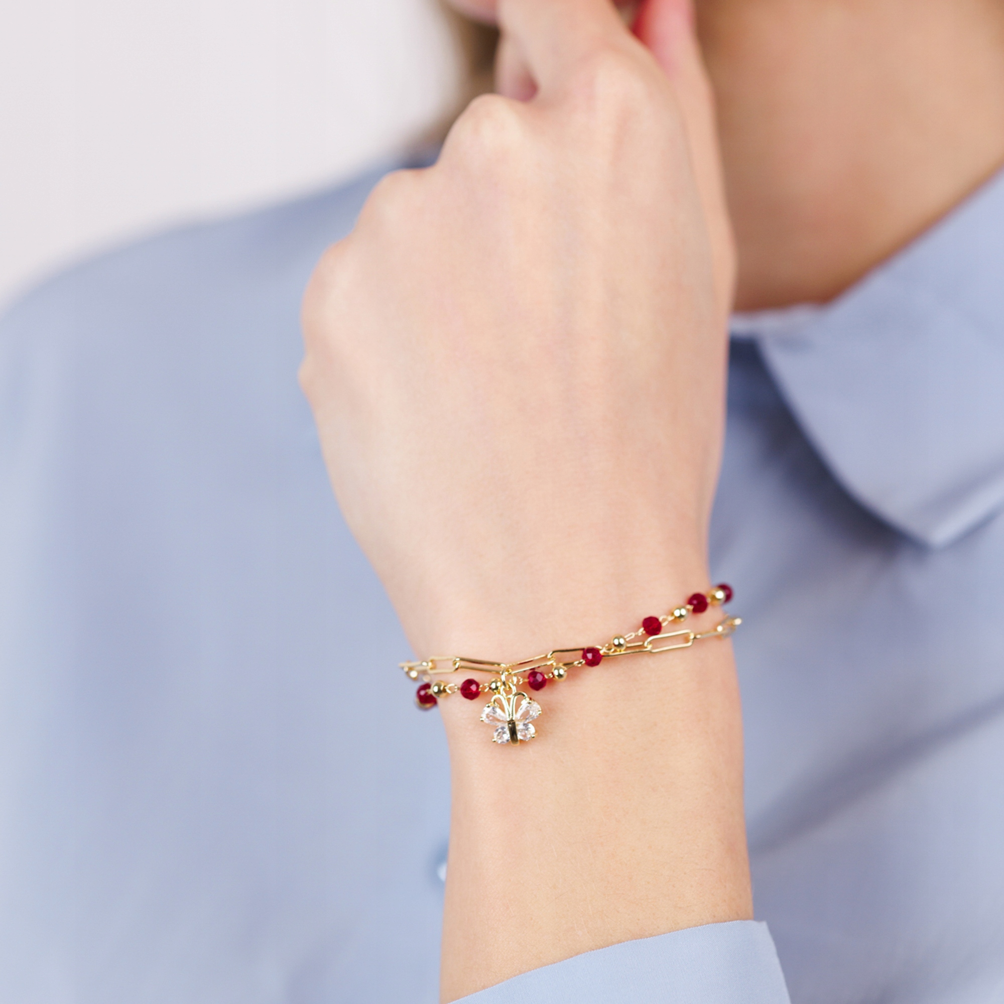 Bransoletka pozłacana z mosiądzu z czerwonymi koralikami i zawieszką motyla