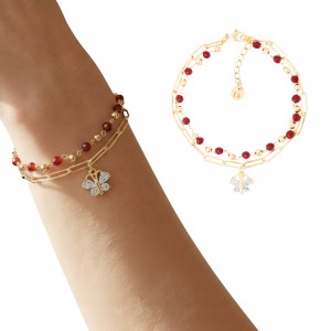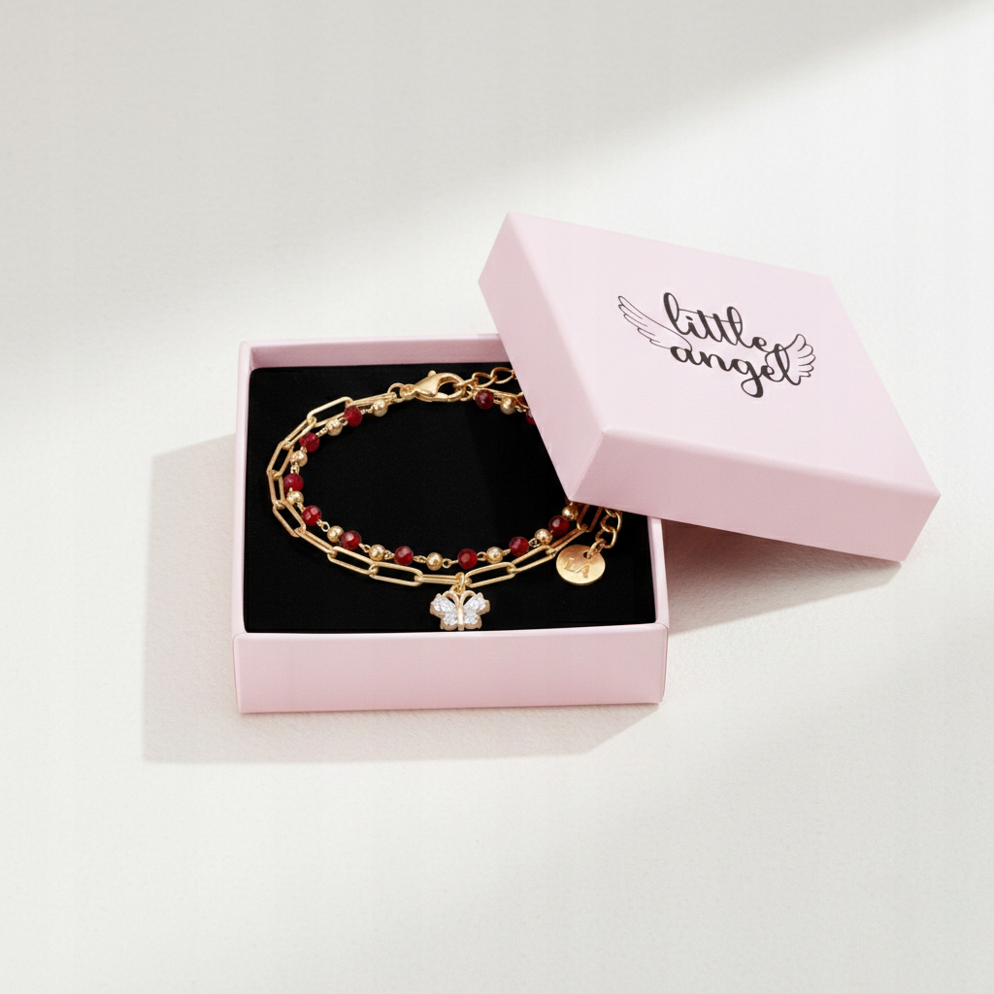Dodaj swojej stylizacji wyjątkowego charakteru dzięki delikatnej, a zarazem efektownej bransoletce w złotym odcieniu. Połączenie klasycznego łańcuszka z drobnymi, czerwonymi koralikami oraz błyszczącej zawieszki w kształcie motyla tworzy biżuterię, która zachwyca lekkością i kobiecym wdziękiem.