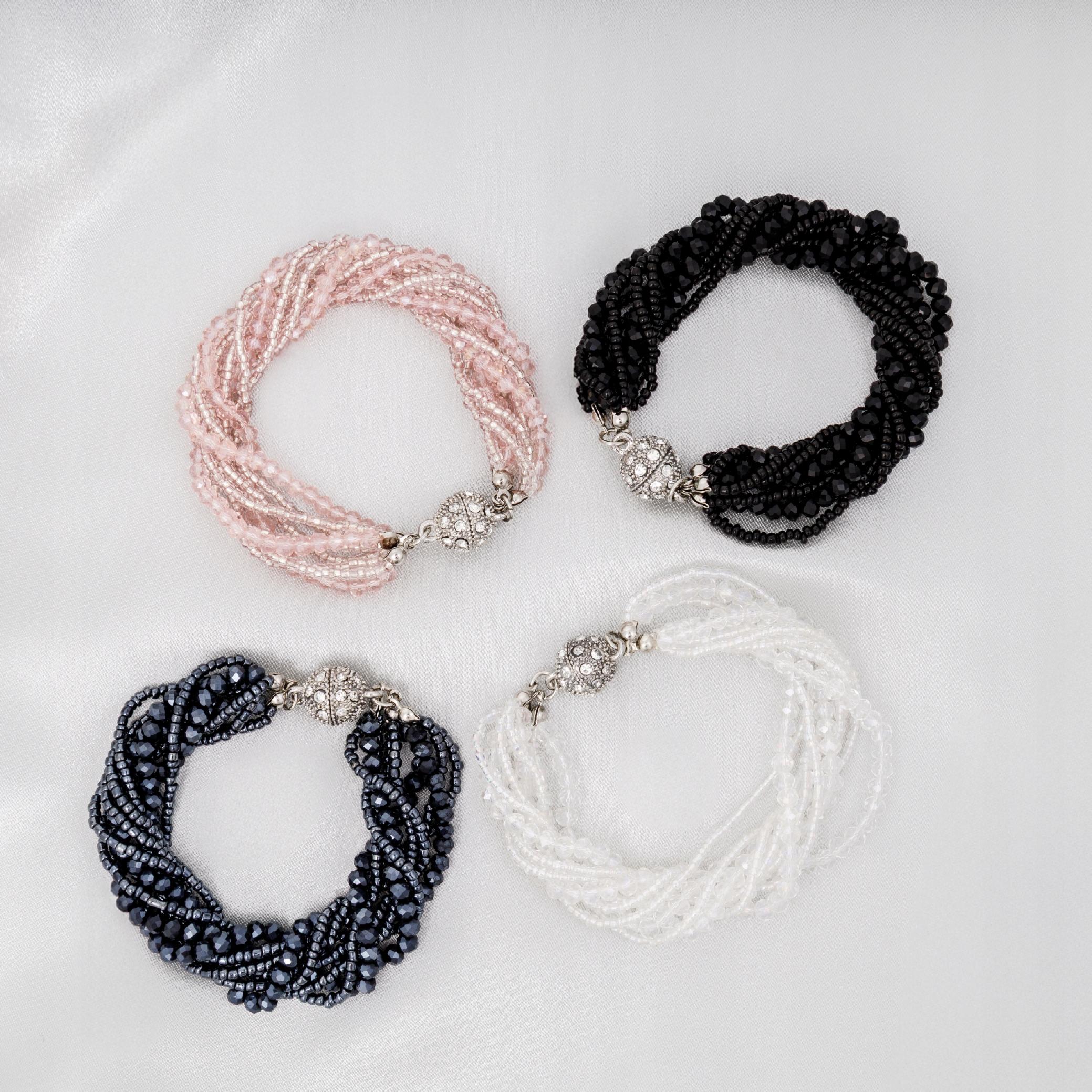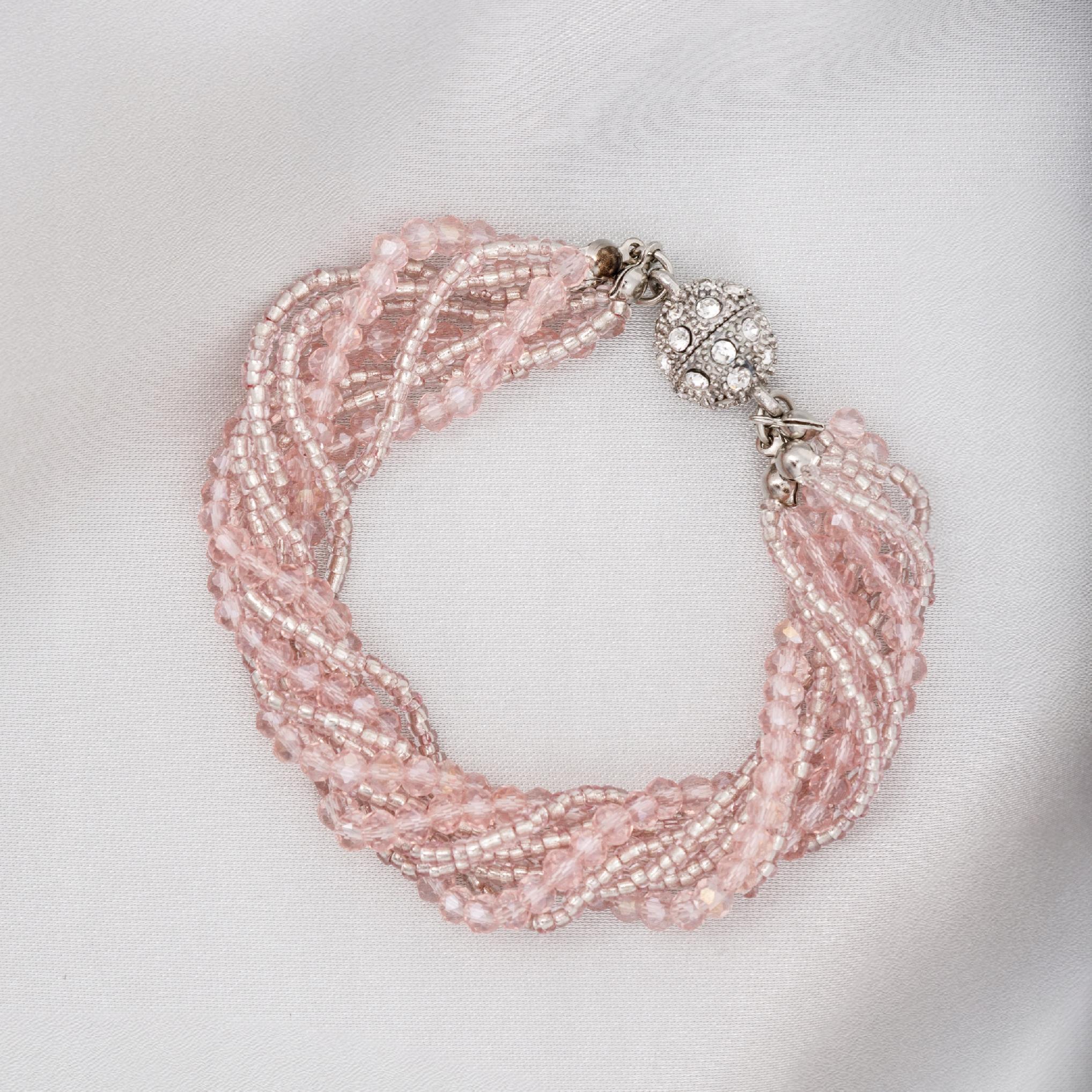 Wykonana z drobnych szklanych różowych koralików, spleciona w efektowny warkocz i zakończona ozdobnym zapięciem na magnes z cyrkoniami – świetnie sprawdzi się na co dzień i na specjalne okazje.