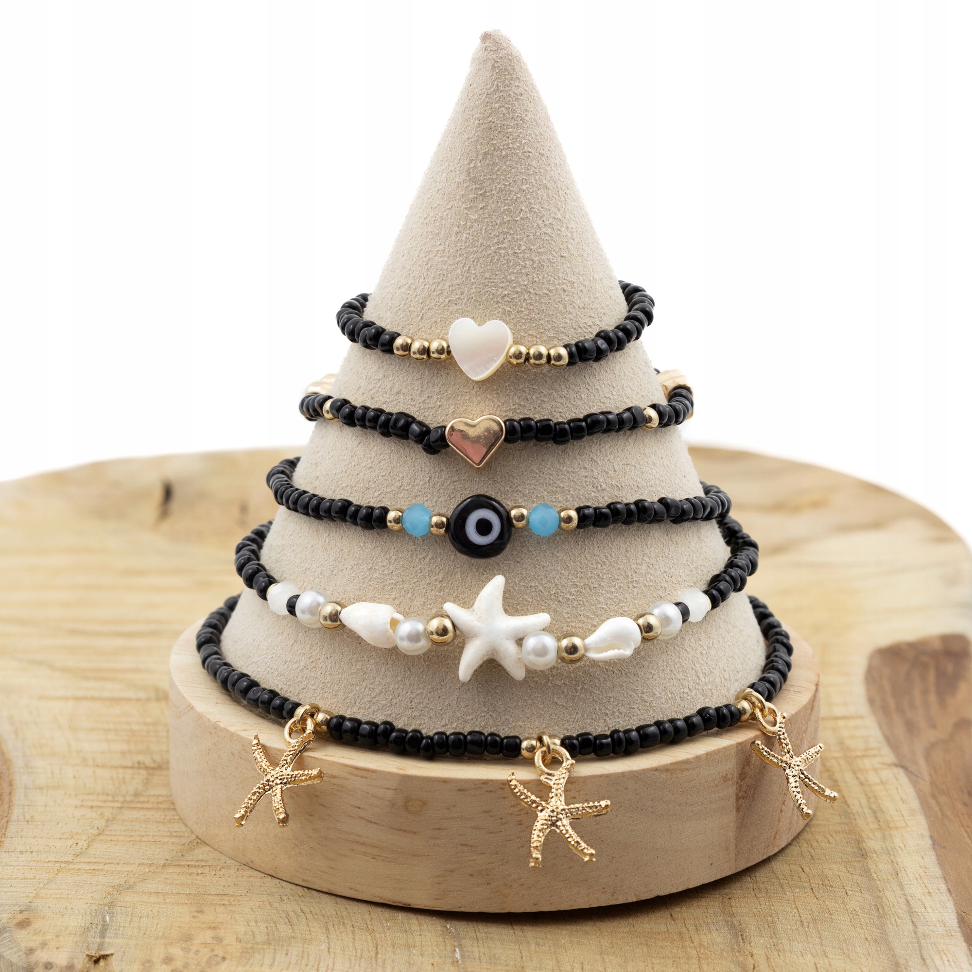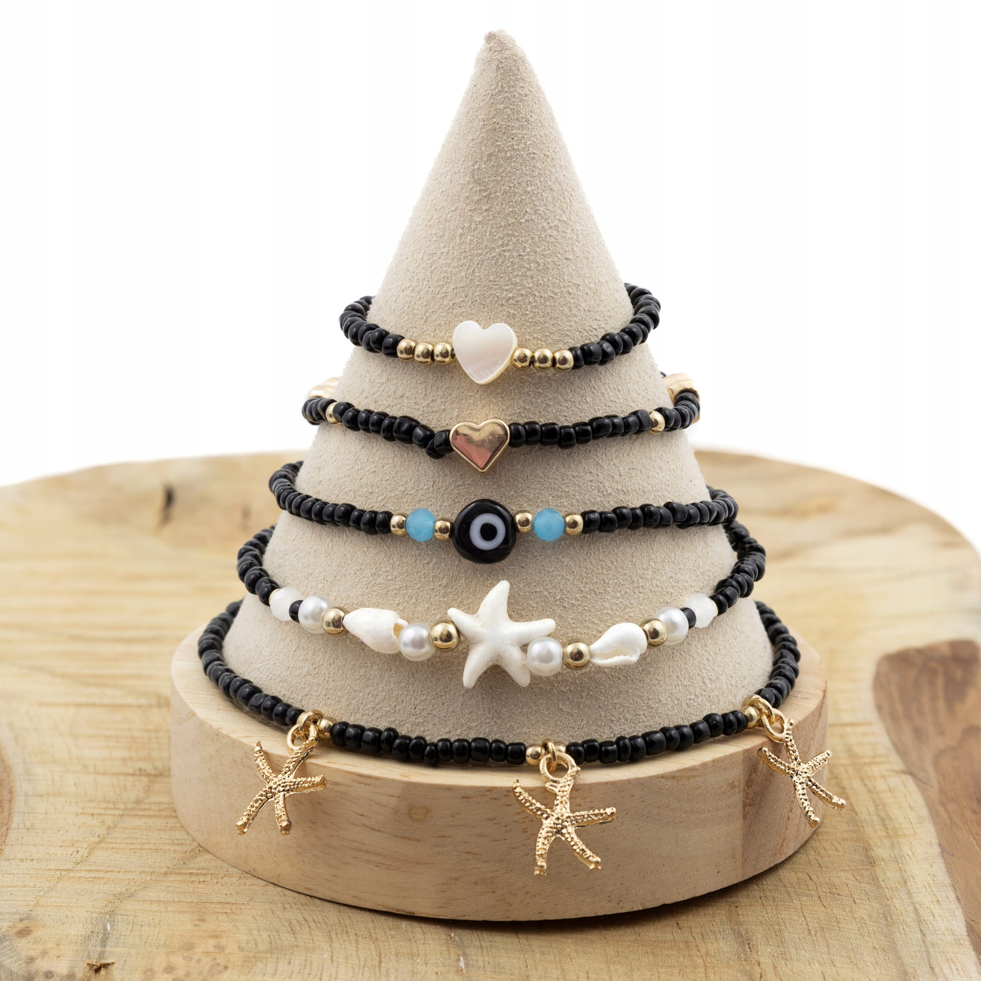Każda z nich ma unikalny motyw – serduszka, rozgwiazdy, muszelki, perełki i koraliki w czerni, złocie i bieli. Możesz je nosić razem lub osobno – według własnego stylu!