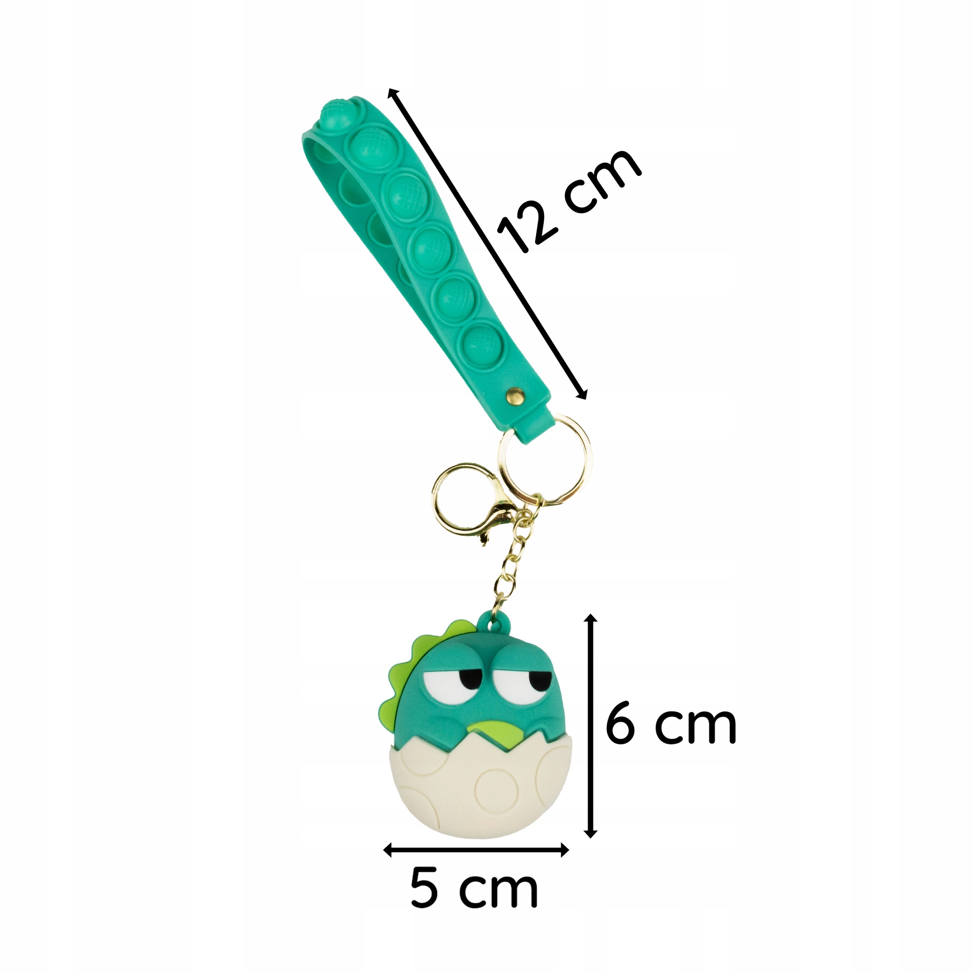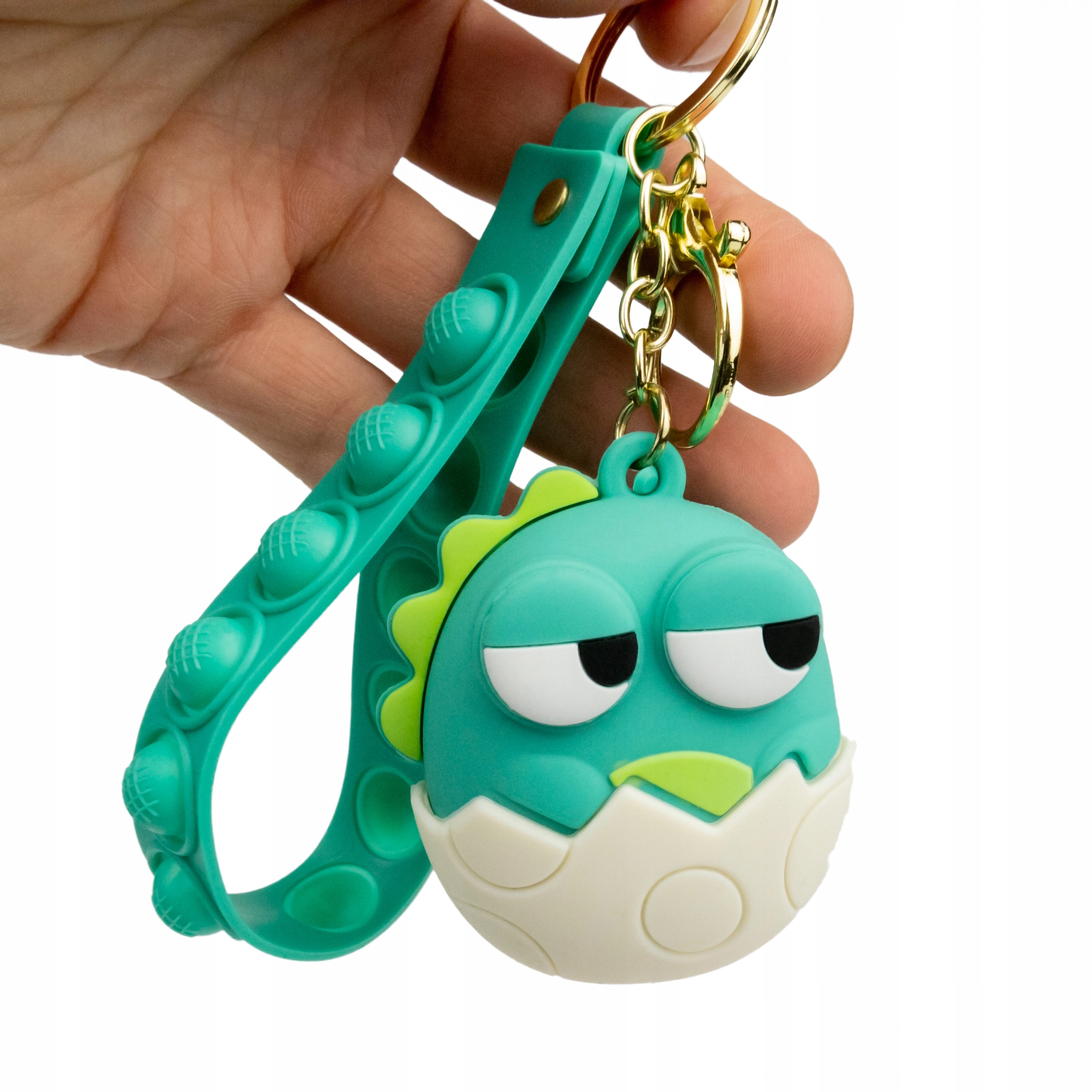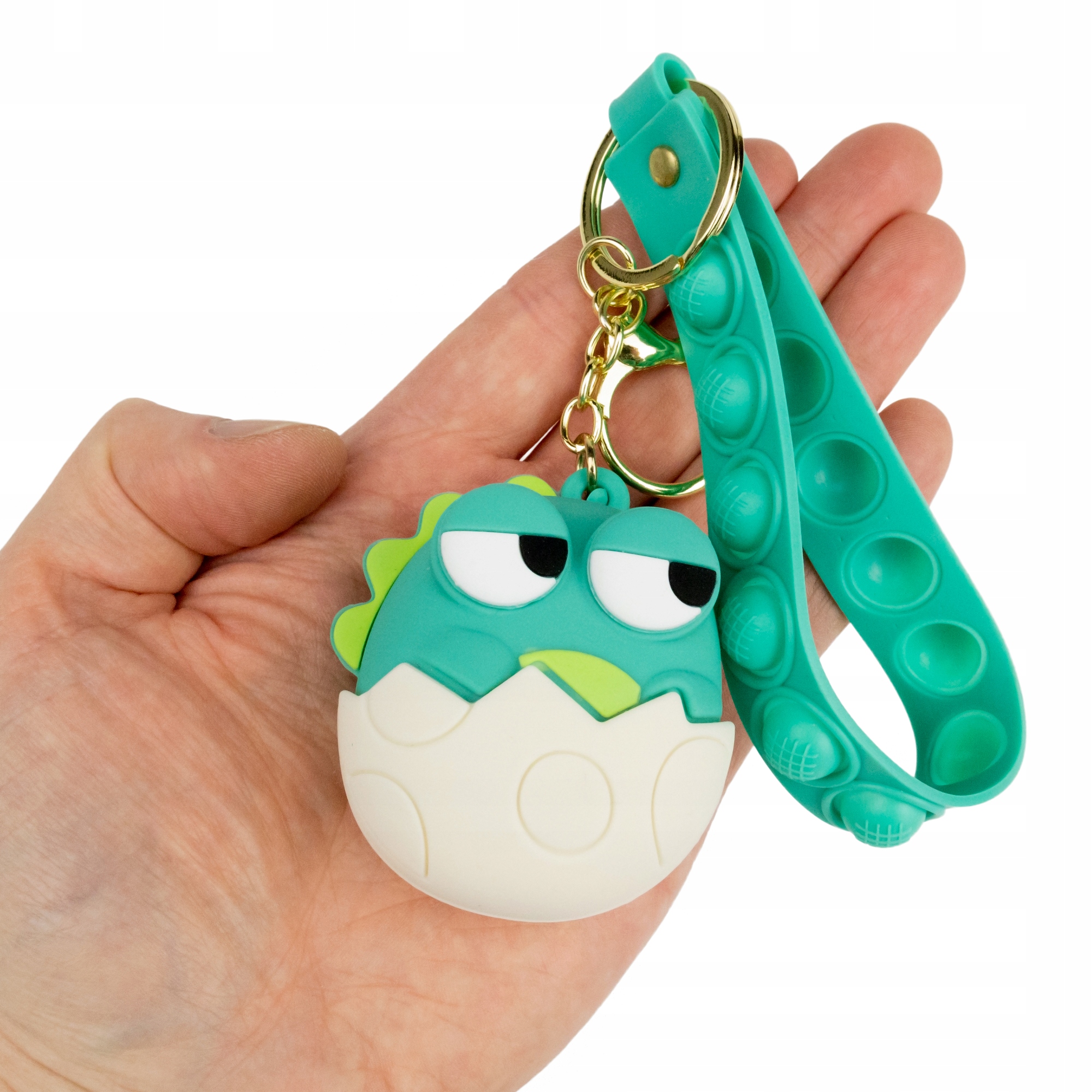 Piękny silikonowy breloczek z małym zielonym dinozaurem wykluwającym się z jajka