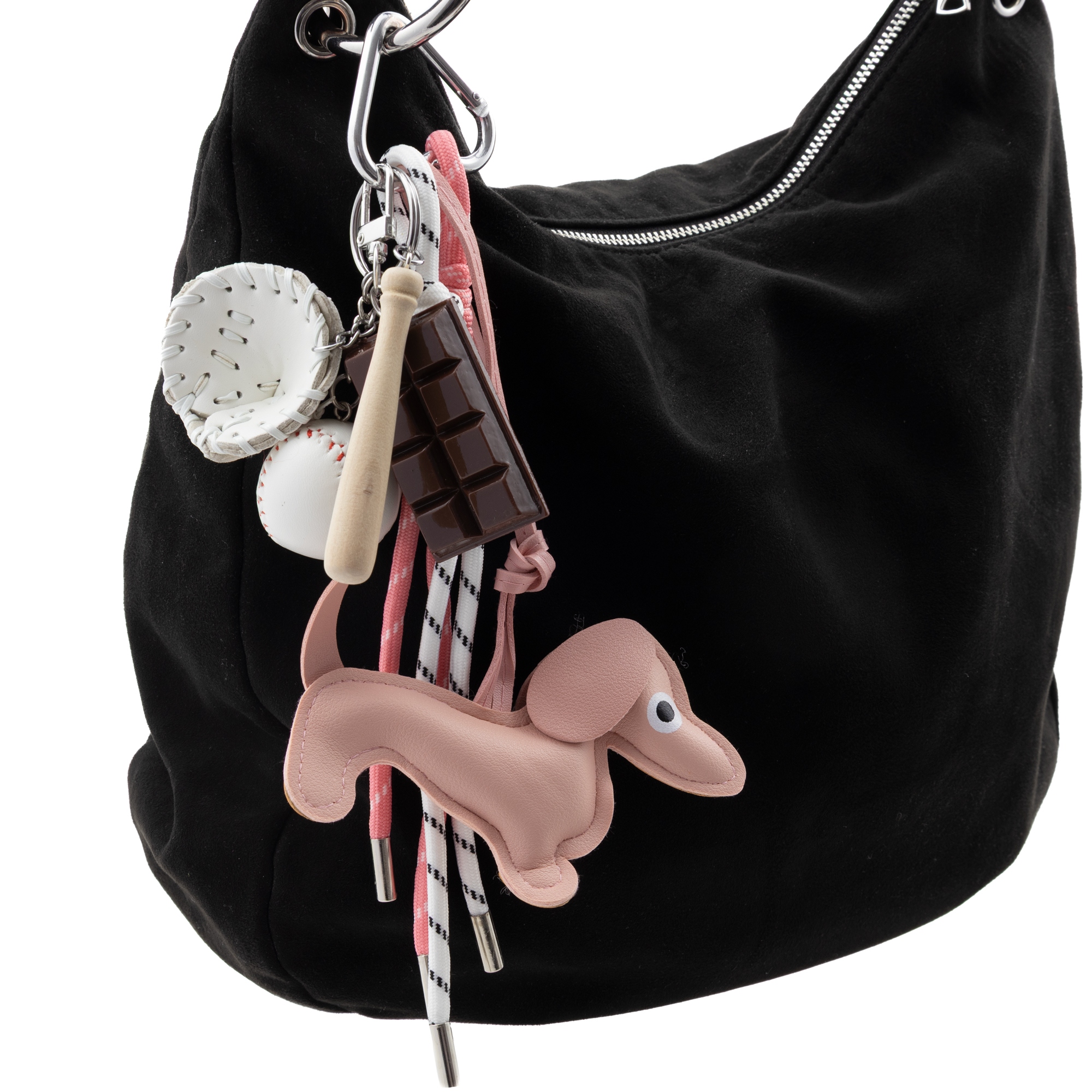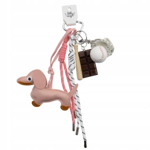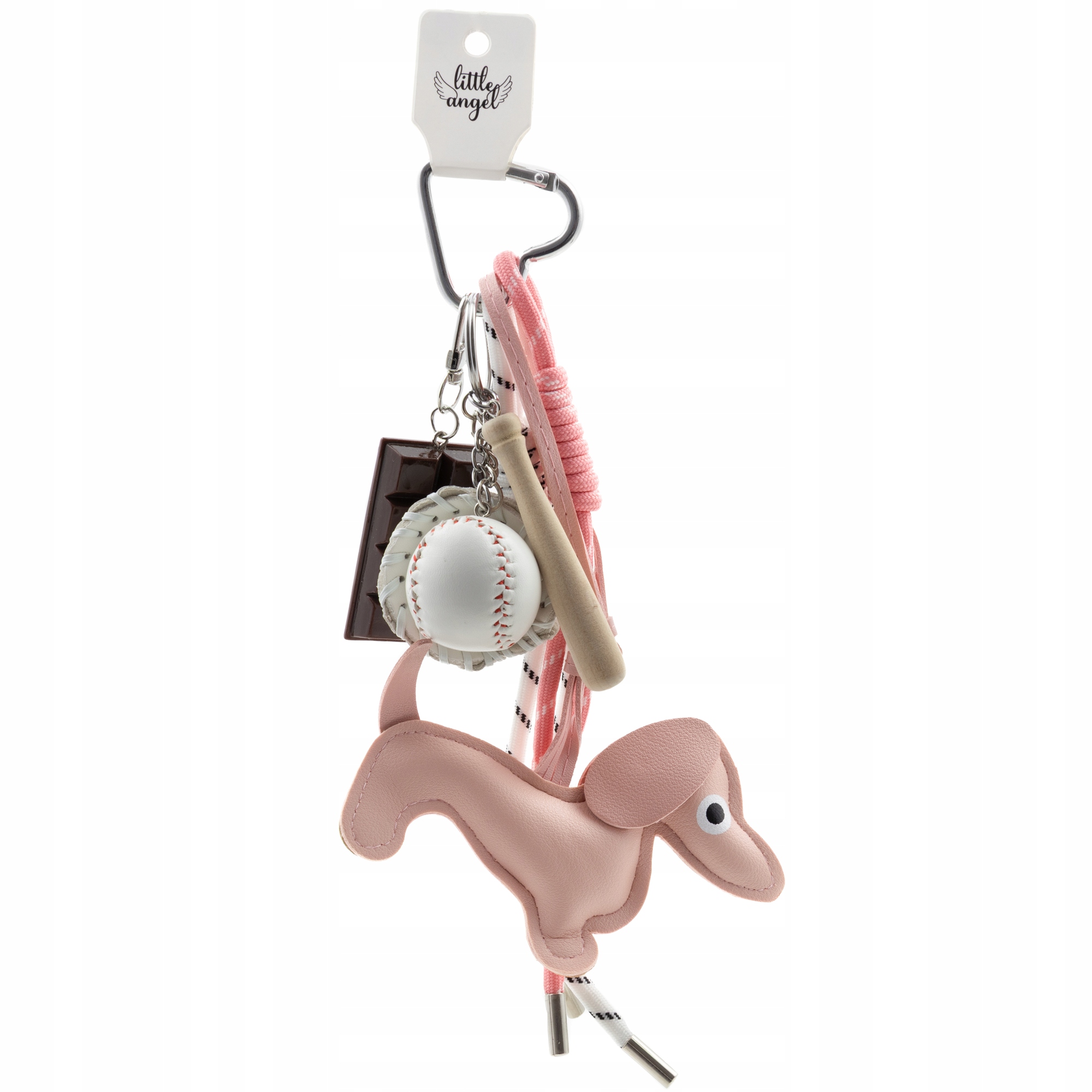 Słodki, dziewczęcy i pełen charakteru! Ten uroczy brelok od Little Angel w pastelowym różu to idealny dodatek do torebki, plecaka lub kluczy. Figurka jamnika z miękkiej ekoskóry, sportowe dodatki w postaci piłki baseballowej, rękawicy i kija oraz dekoracyjna tabliczka czekolady tworzą niepowtarzalną całość.