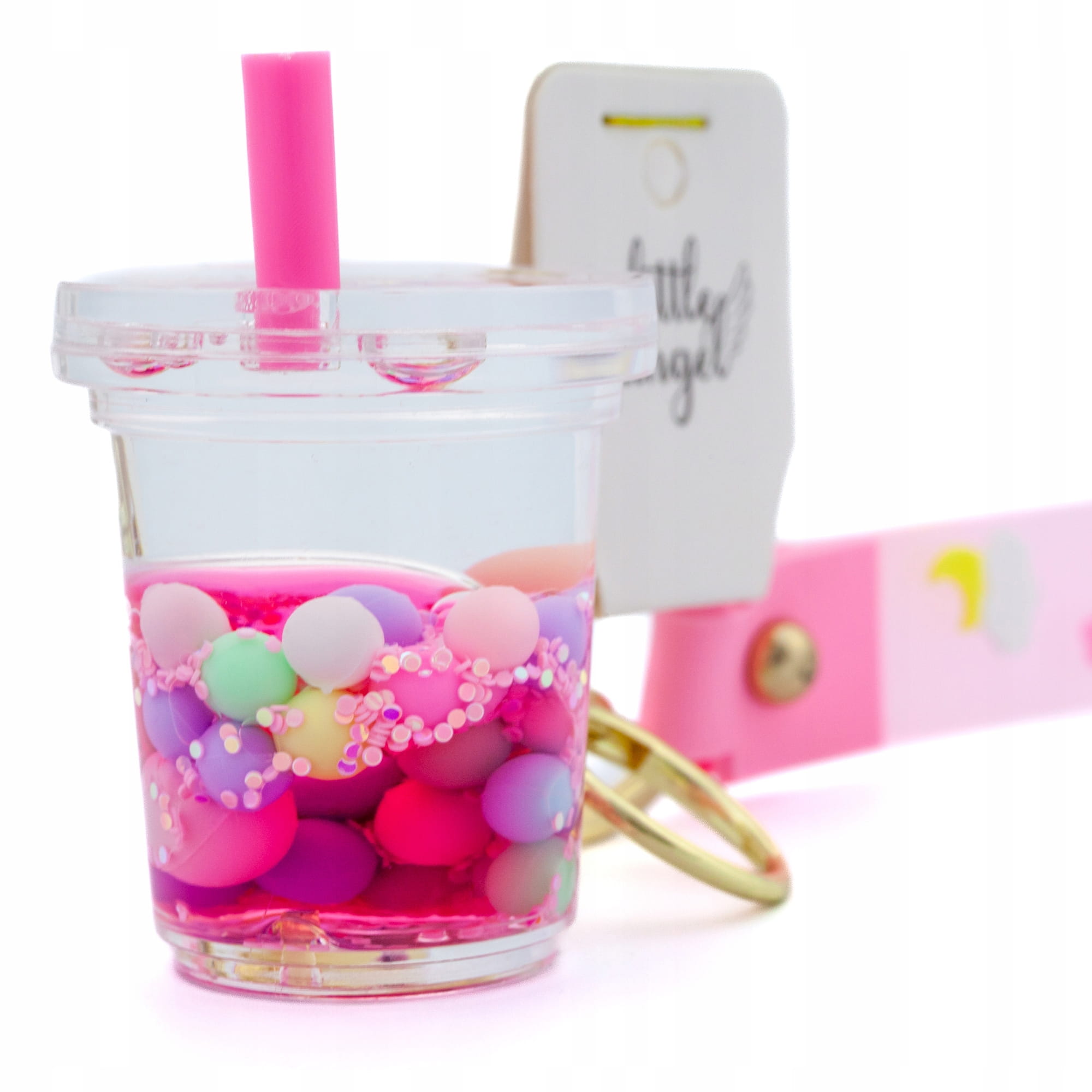 Brelok w kształcie plastikowego kubka ze słomką z brokatem i kulkami w środku