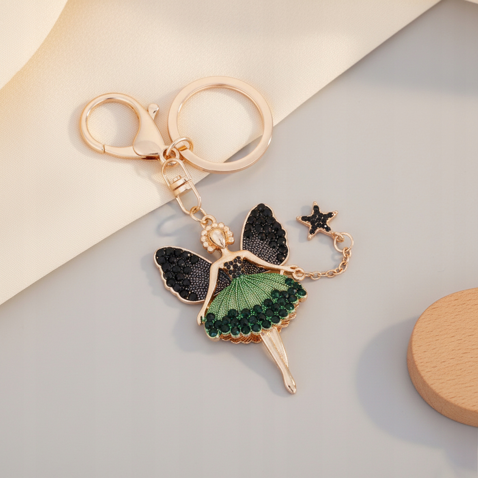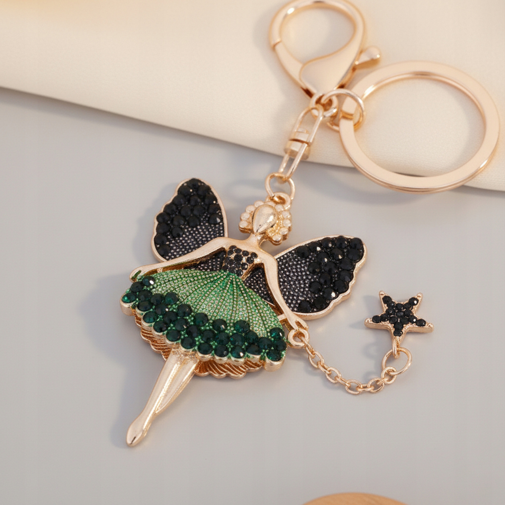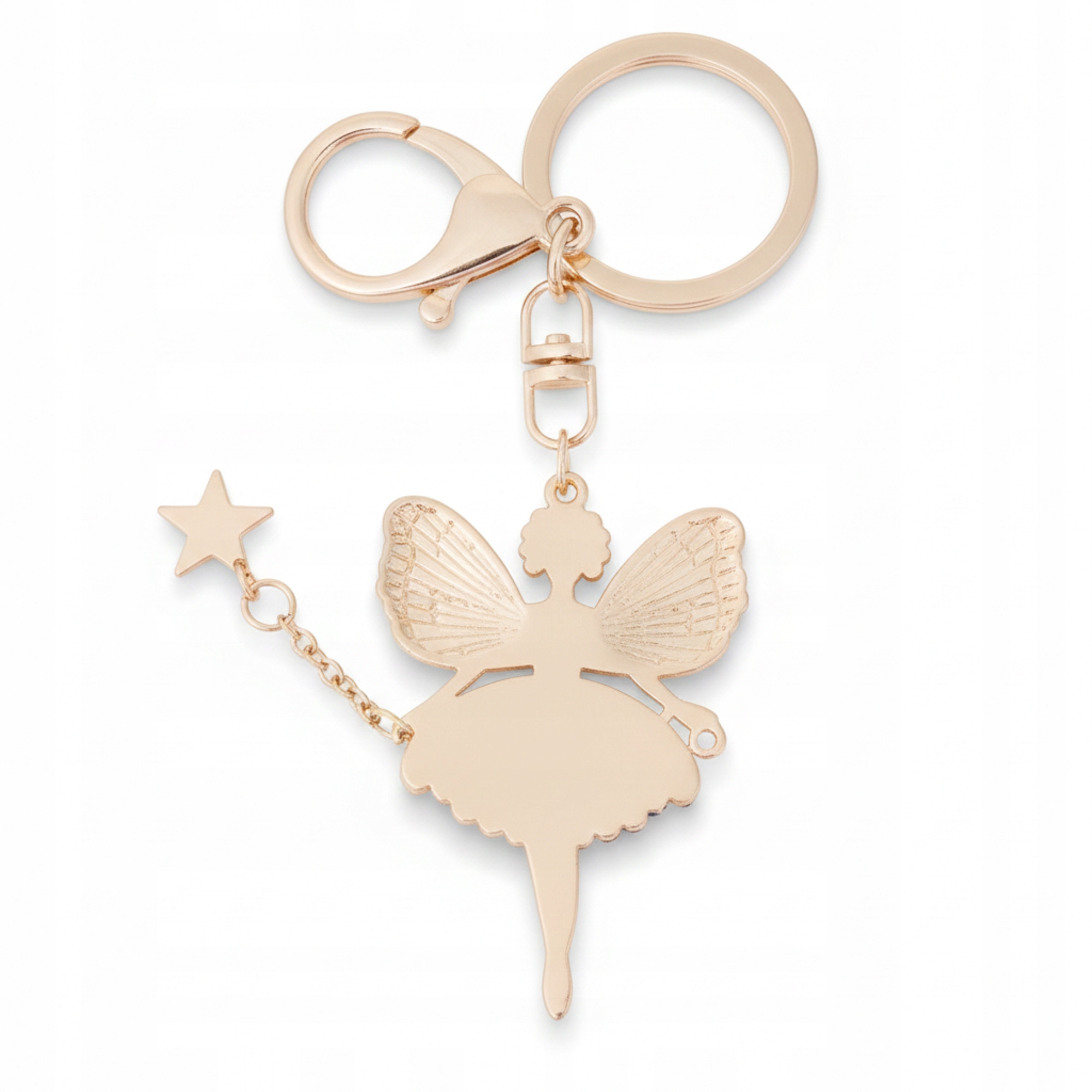 Elegancki brelok w kształcie wróżki to stylowa zawieszka do kluczy, torebki lub plecaka. Biżuteryjne wykończenie, połyskujące kryształki i delikatny łańcuszek z gwiazdką tworzą wyjątkowy, kobiecy dodatek, który przyciąga spojrzenia.