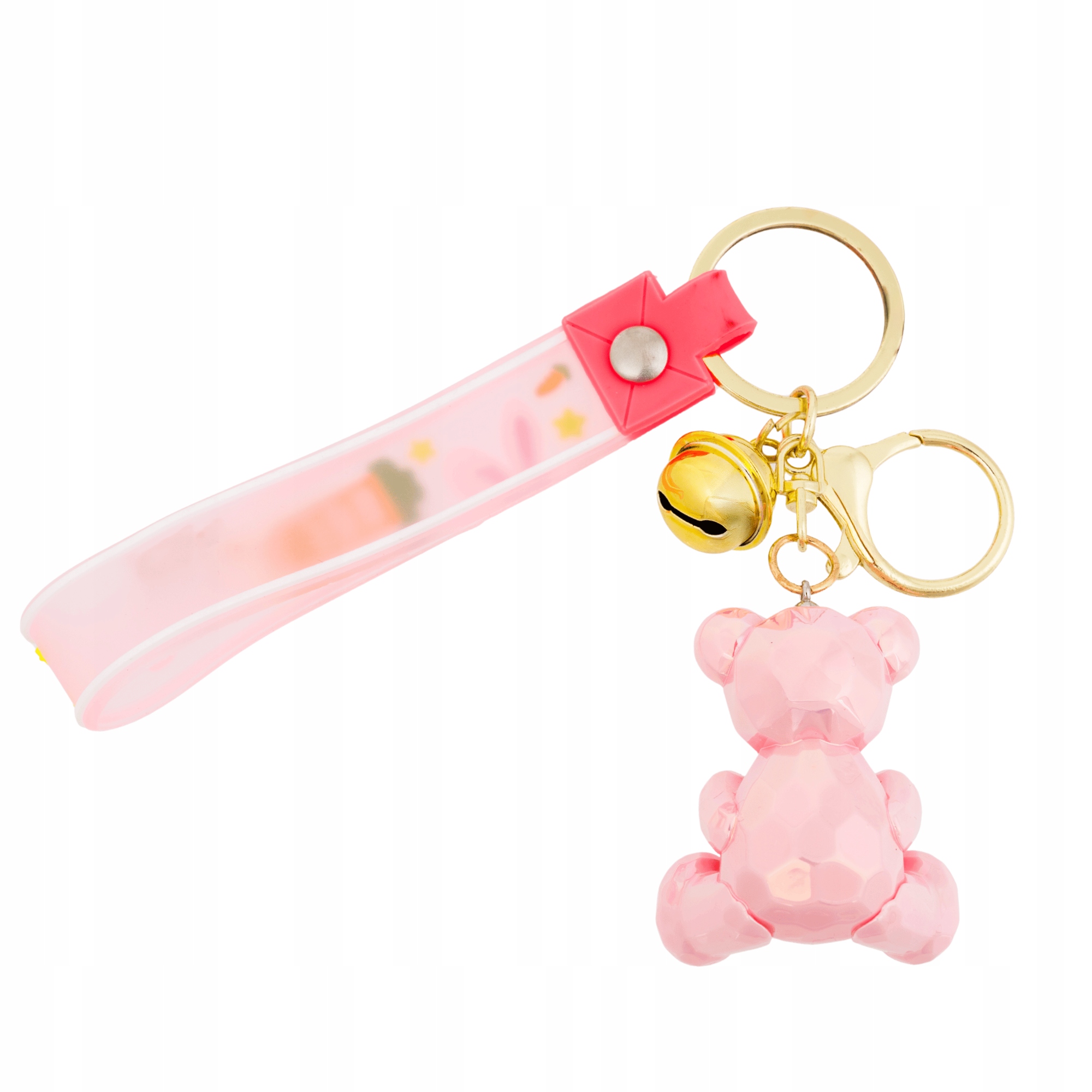 Brelok wykonany jest z błyszczącego tworzywa o diamentowym szlifie, który pięknie odbija światło. Uzupełnia go miękka różowa zawieszka z napisem „Angels” oraz złoty dzwoneczek dodający uroku przy każdym ruchu. Solidny karabińczyk umożliwia łatwe przypięcie i przenoszenie ozdoby.