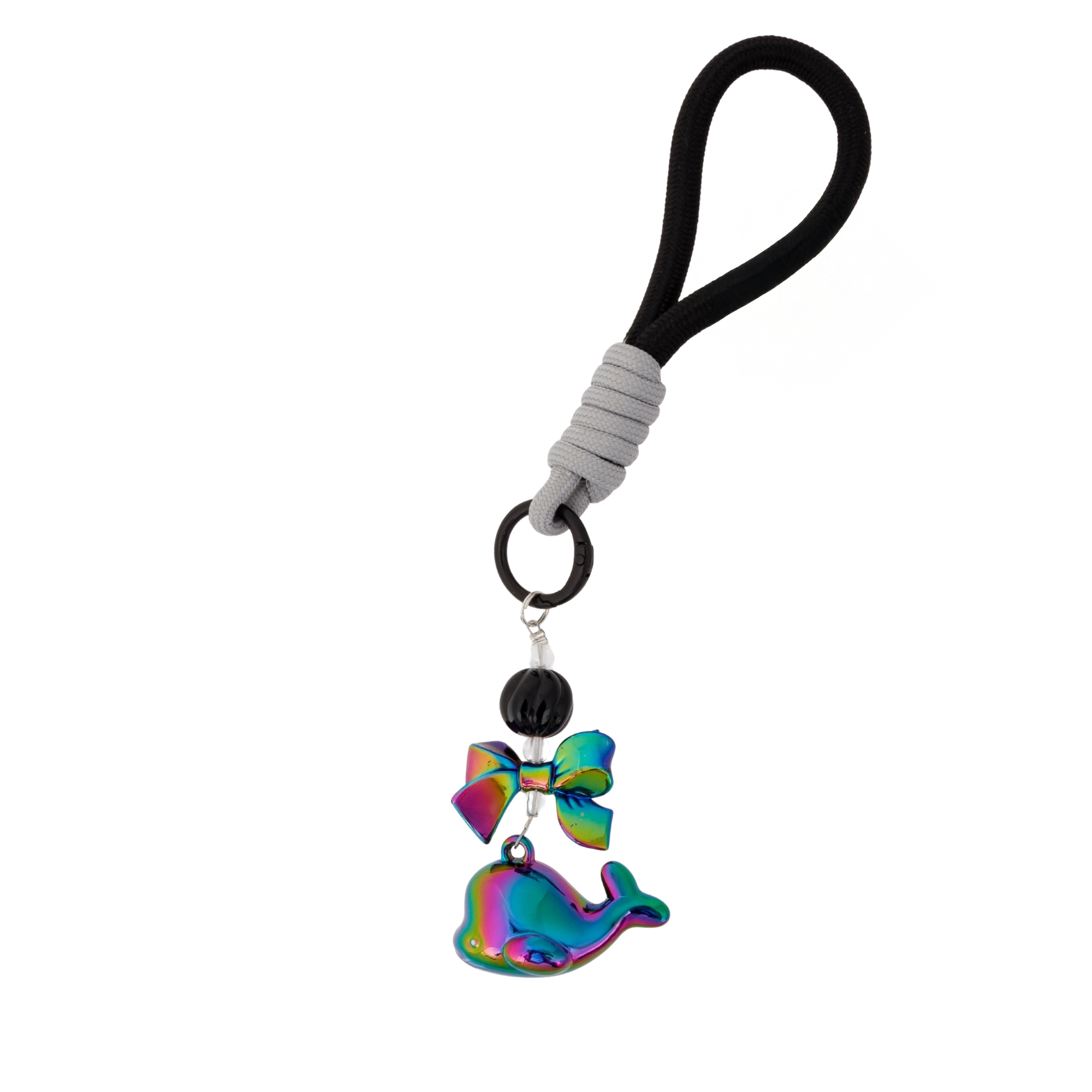 Brelok ozdobiono połyskującą kokardką w kolorach tęczy oraz dekoracyjnym czarnym koralikiem, które razem tworzą modny, nowoczesny kontrast. Solidny, dwukolorowy sznurek (czarno-szary) sprawia, że całość wygląda elegancko i trwało — idealna do przypięcia przy plecaku, torbie lub kluczach.