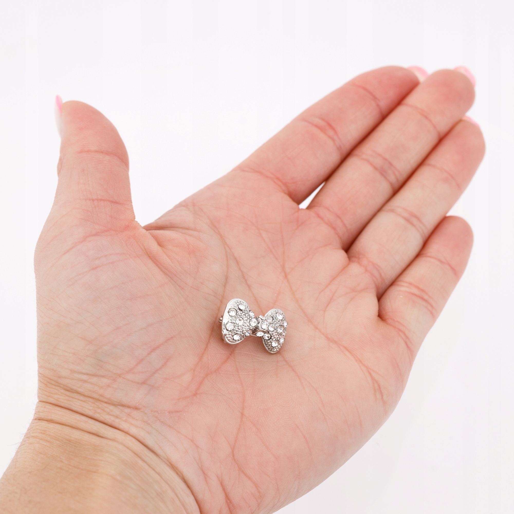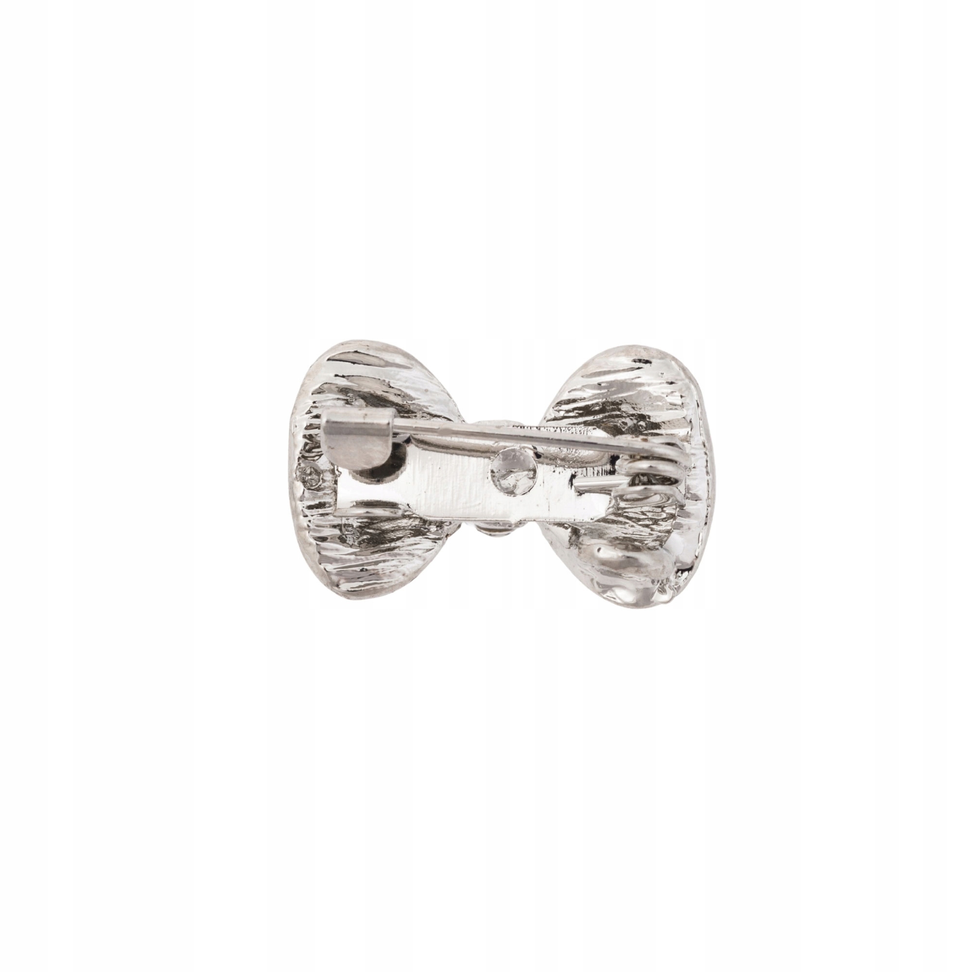 Elegancka broszka w kształcie kokardki ozdobiona błyszczącymi cyrkoniami to subtelny dodatek, który pięknie podkreśli każdą stylizację. Delikatny srebrny kolor i drobne kamienie nadają biżuterii eleganckiego, kobiecego charakteru.