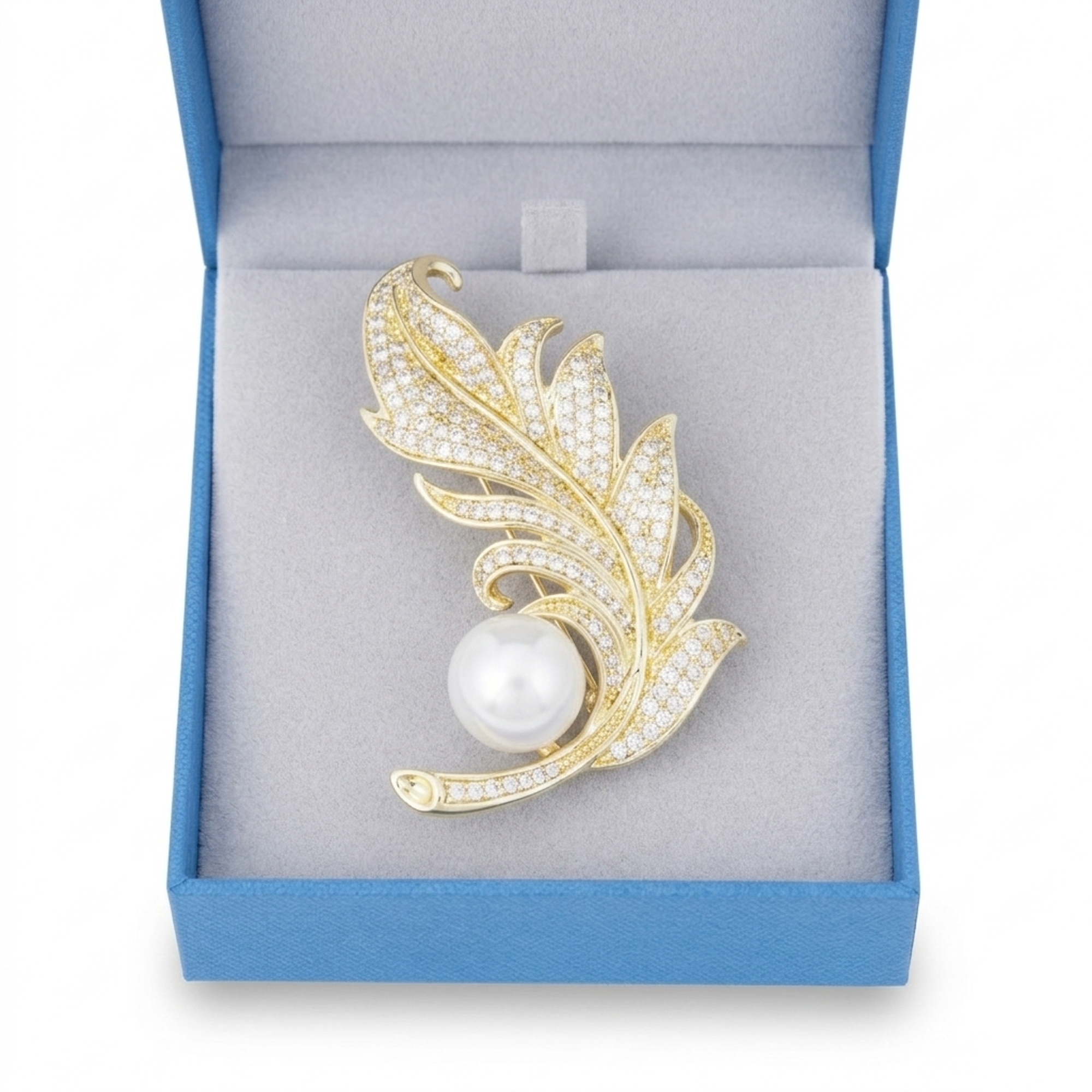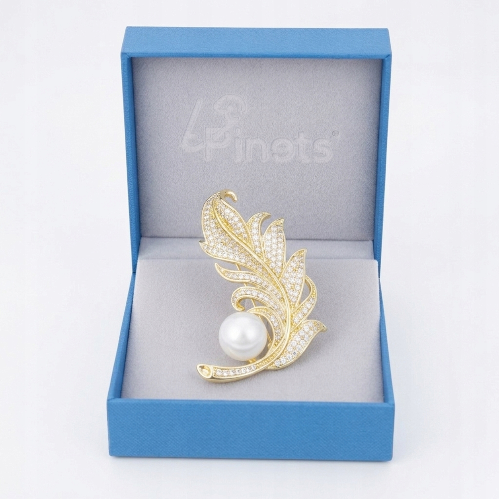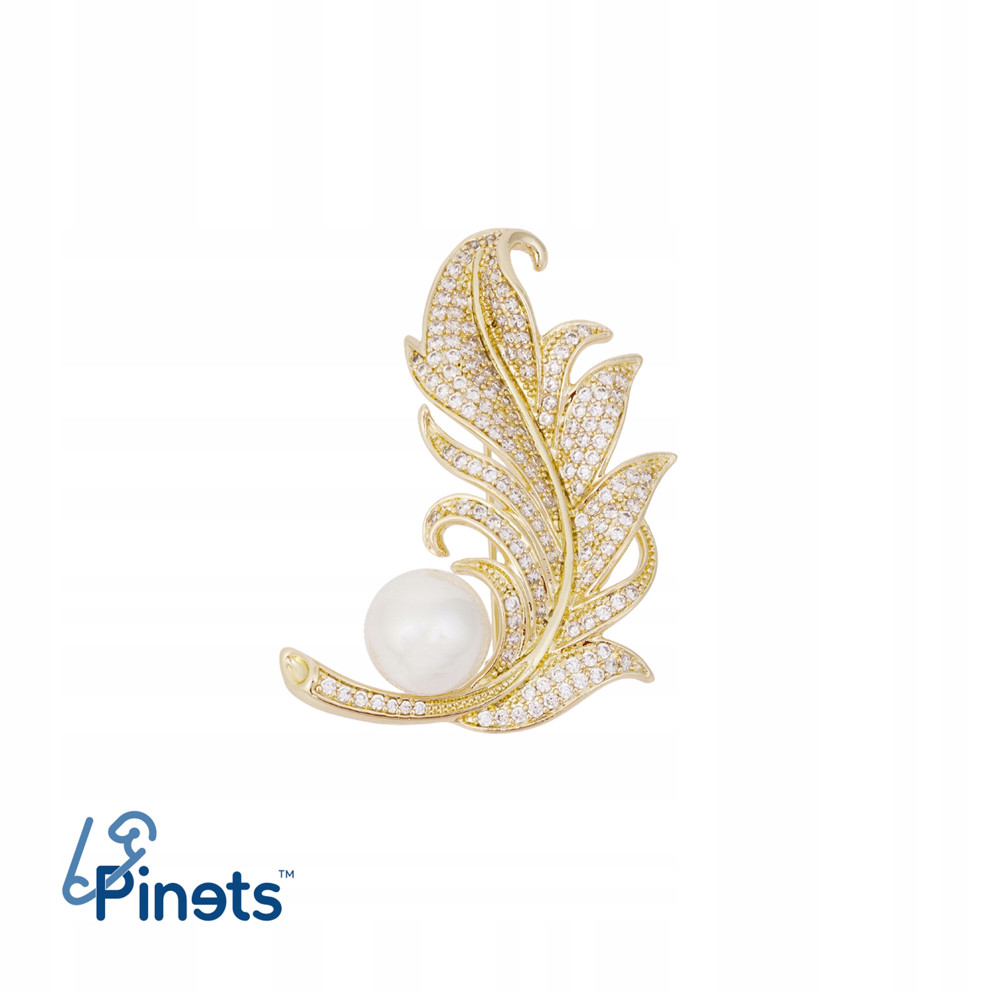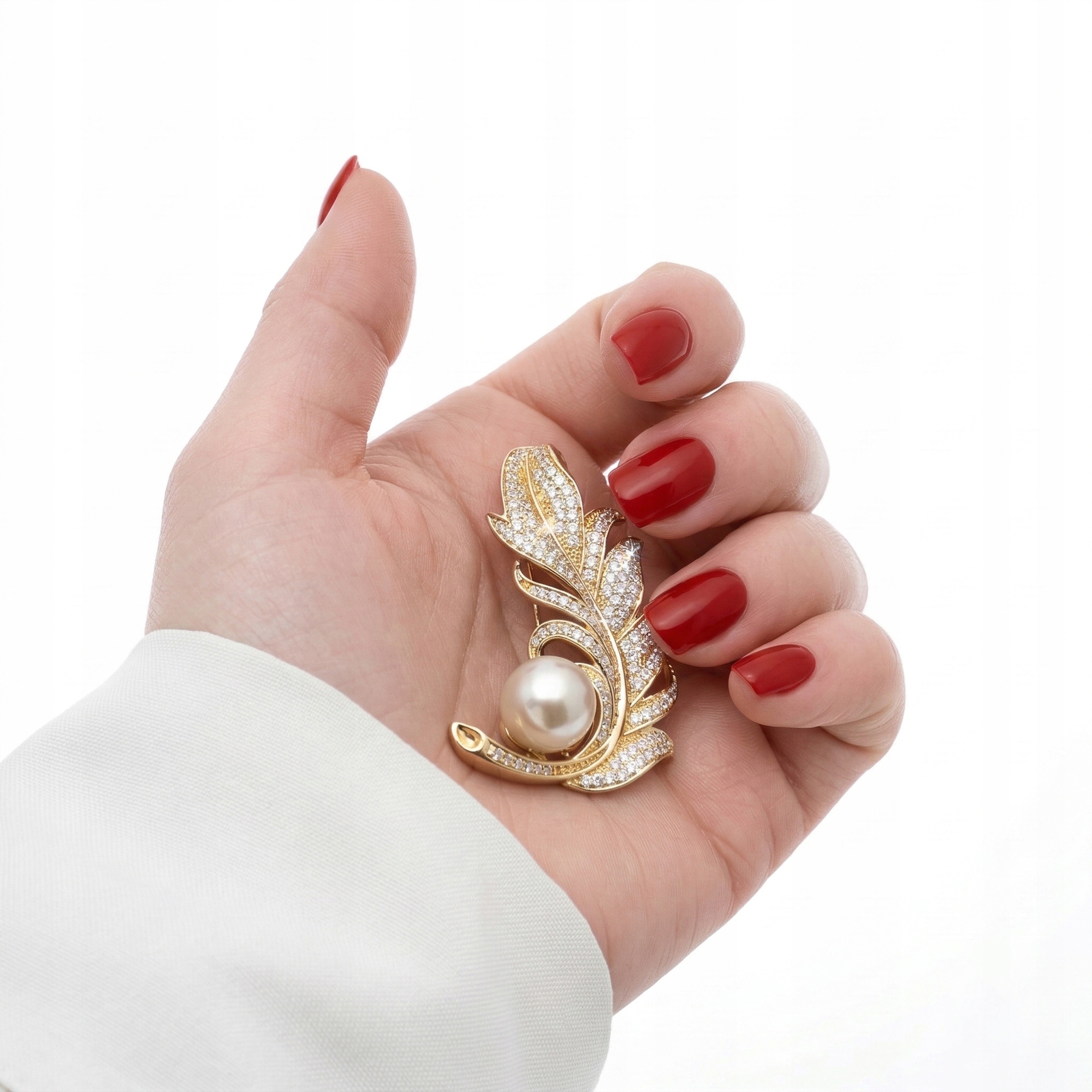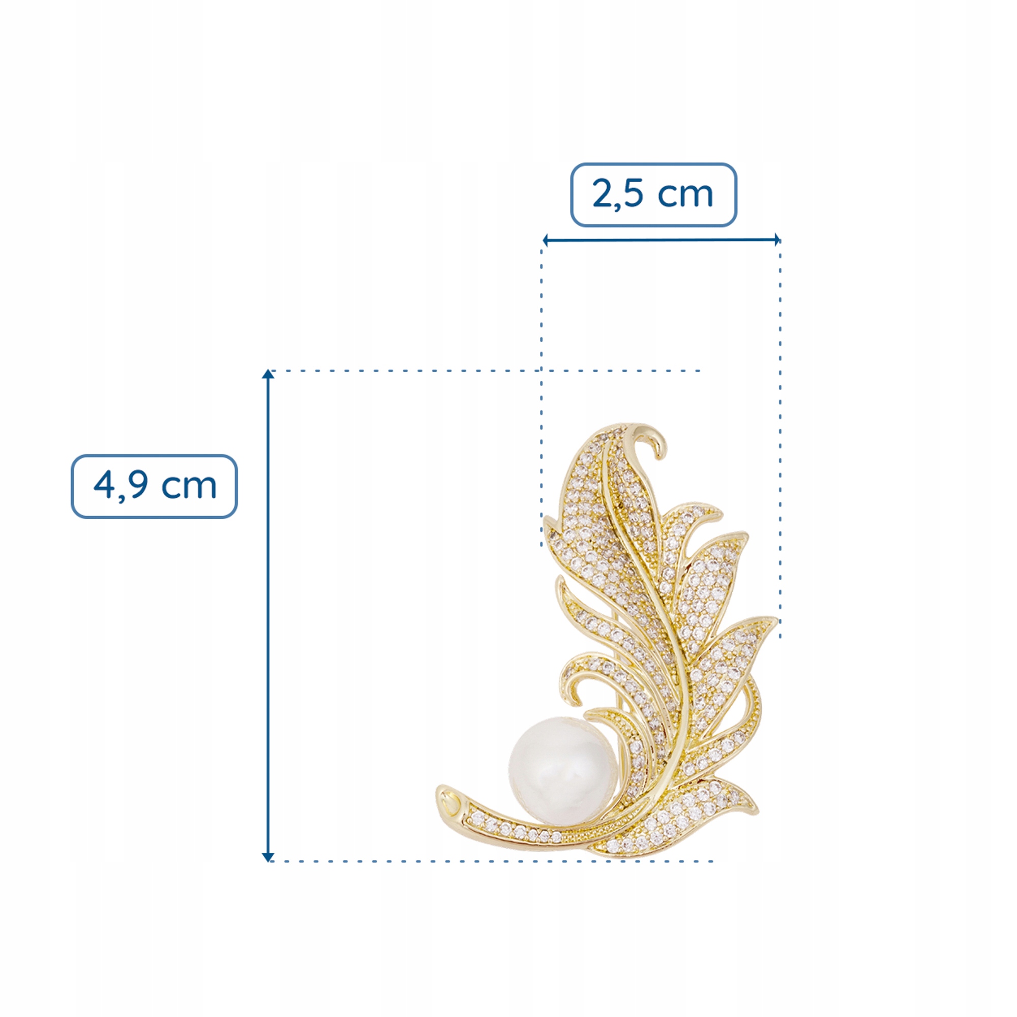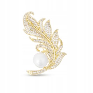 Elegancka broszka w kształcie pióra ozdobiona lśniącymi cyrkoniami i dekoracyjną perłą to wyjątkowy dodatek, który podkreśli styl każdej stylizacji. Pozłacana miedziana baza nadaje biżuterii luksusowy, złoty połysk, a subtelny motyw pióra dodaje lekkości i elegancji.