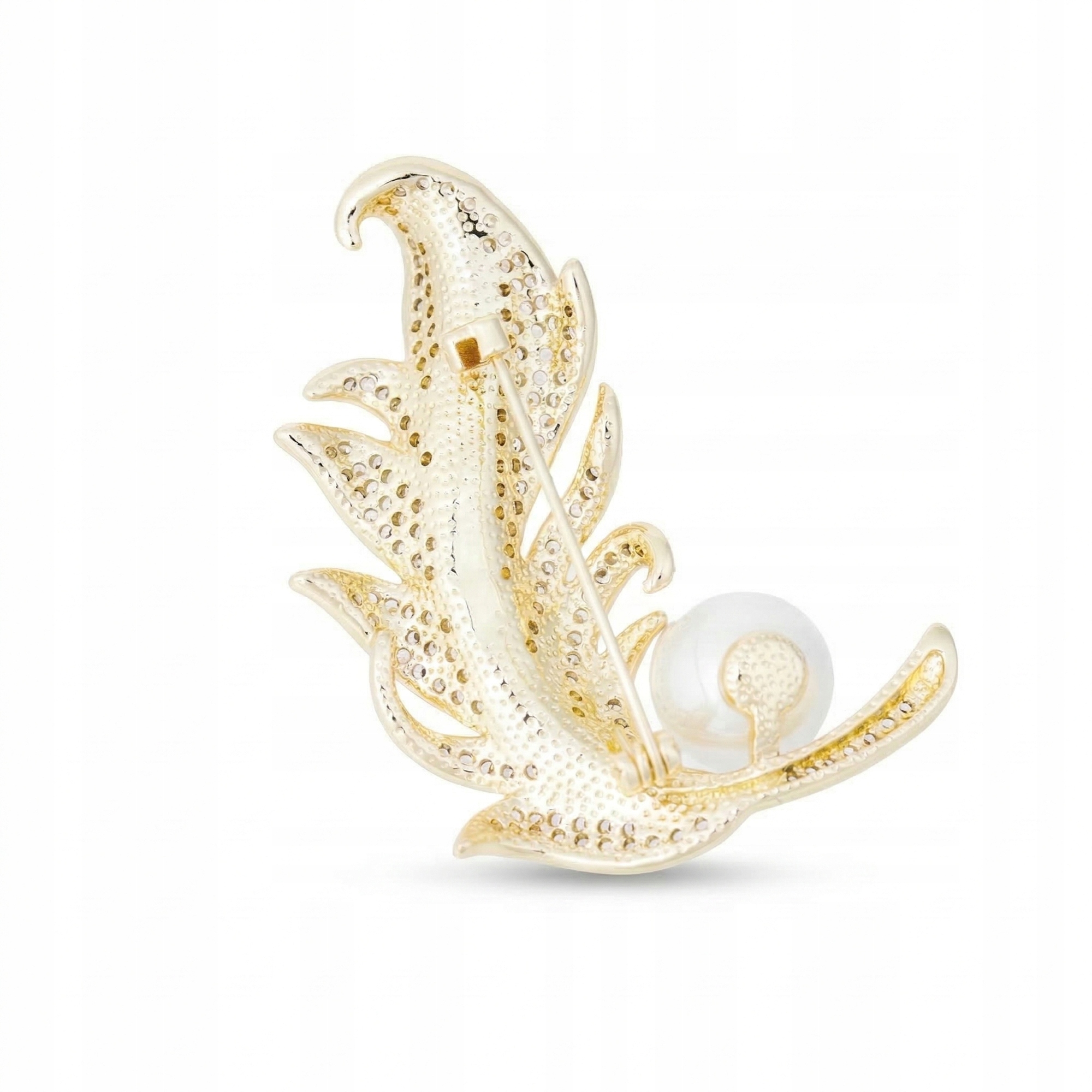 Broszka Pióro z Perłą Cyrkonie Miedziana Pozłacana Elegancka Damska