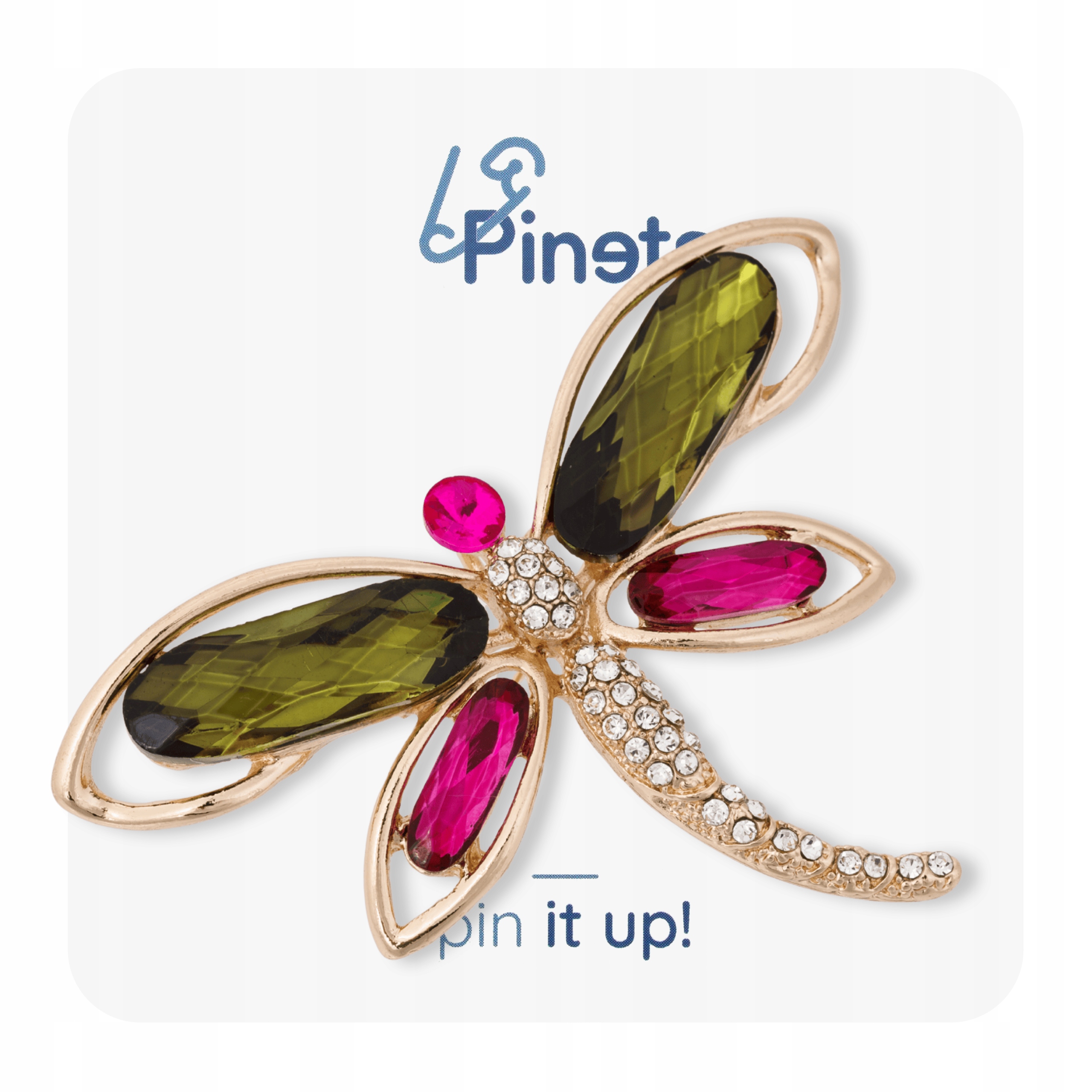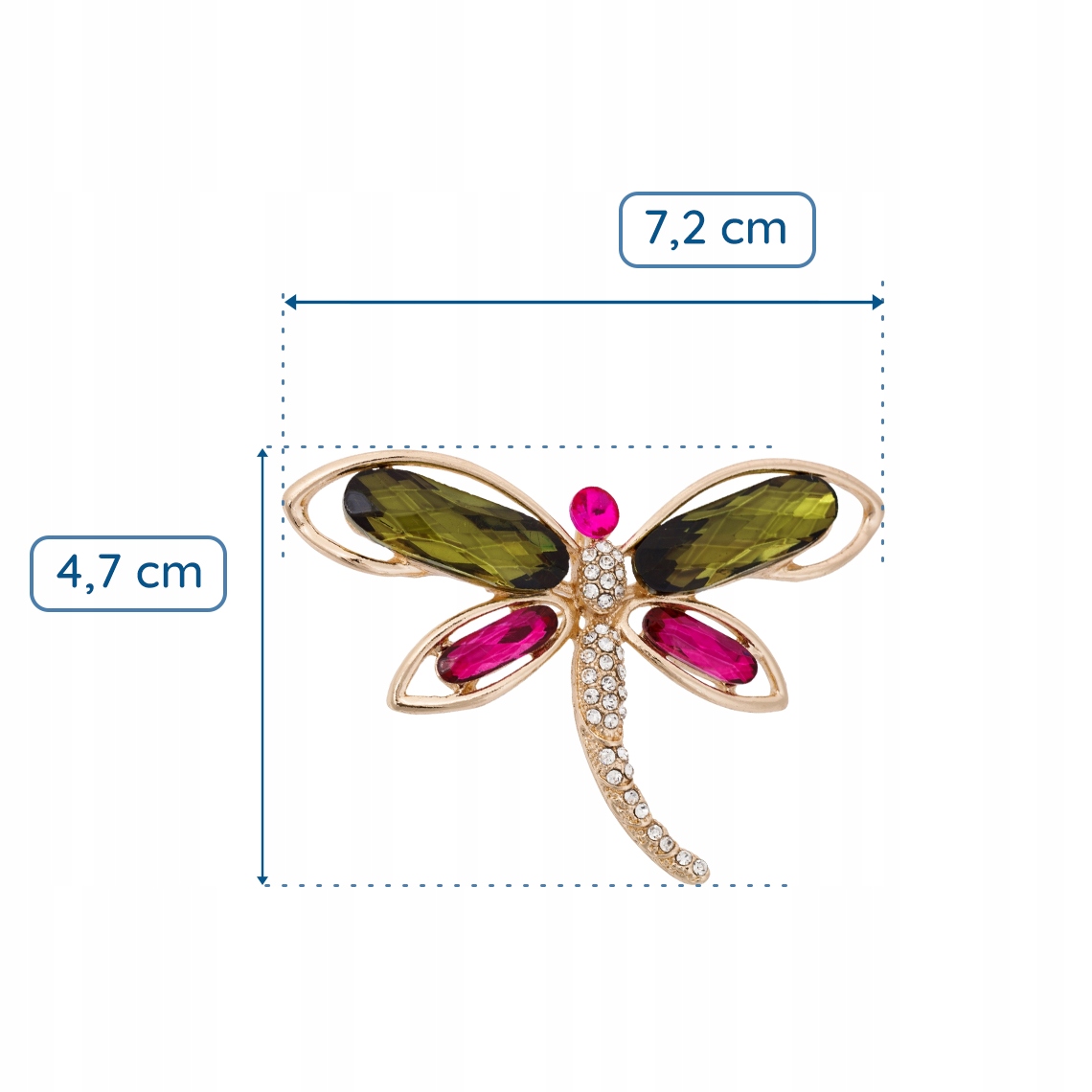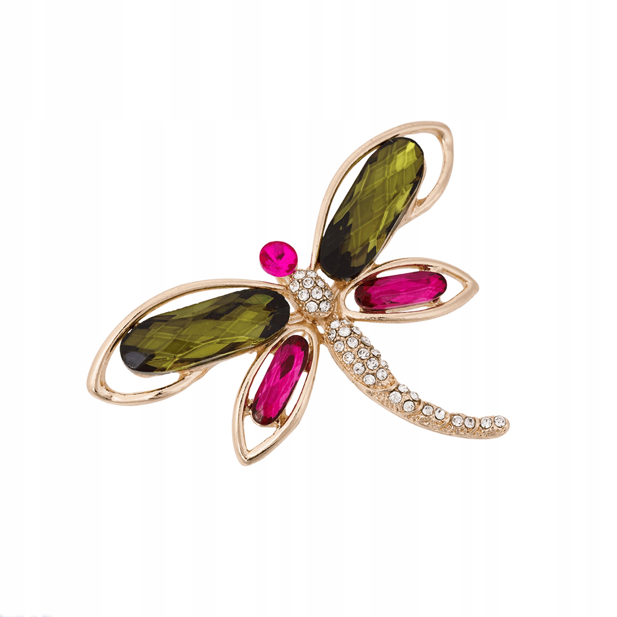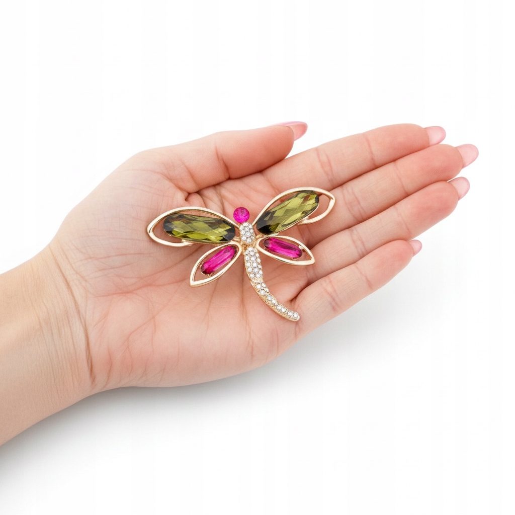 Stylowa broszka w kształcie ważki to wyjątkowy dodatek, który nada każdej stylizacji elegancji i subtelnego blasku. Pięknie wykonane skrzydła ozdobione zostały dużymi kryształami w odcieniach głębokiej zieleni oraz intensywnego różu, które efektownie odbijają światło i przyciągają spojrzenia.