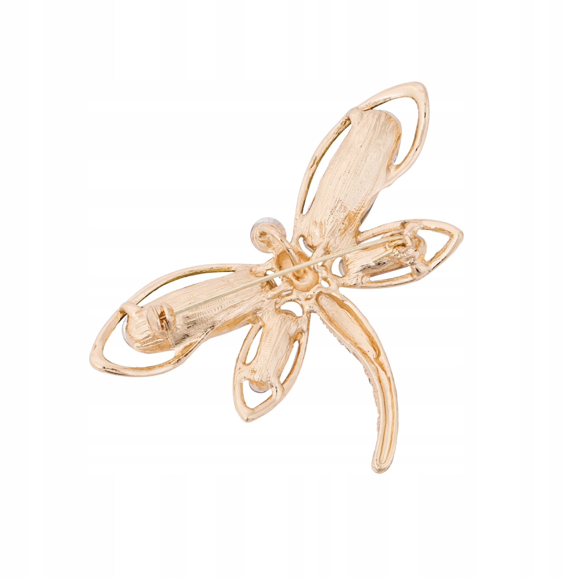 Złota baza broszki została dodatkowo udekorowana drobnymi błyszczącymi cyrkoniami, dzięki czemu biżuteria prezentuje się niezwykle elegancko i luksusowo. Motyw ważki symbolizuje lekkość, harmonię oraz pozytywną energię, dlatego broszka doskonale sprawdzi się jako stylowy akcent do wielu różnych stylizacji.