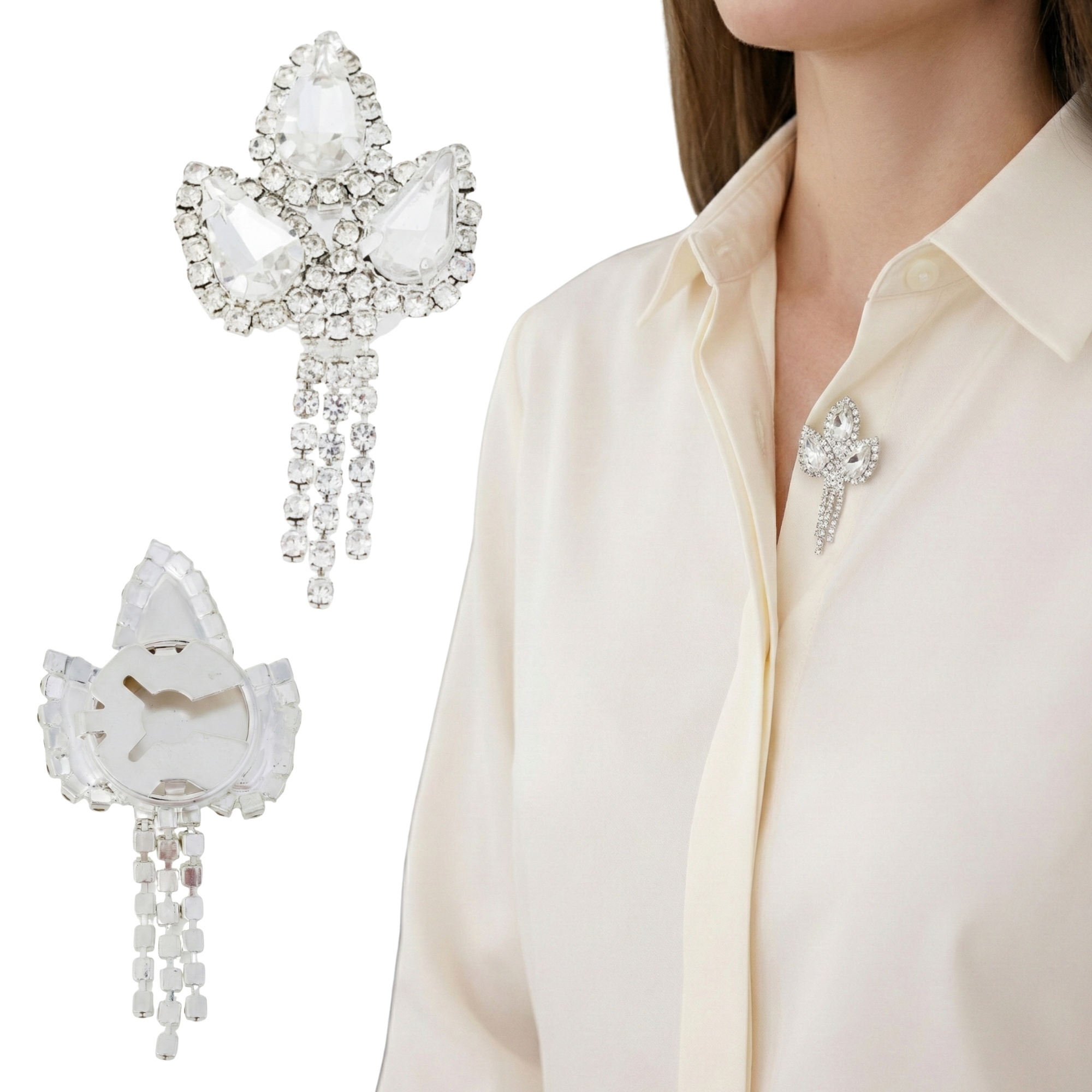 Stylowa nakładka na guzik w kształcie eleganckiej kokardy z kryształami natychmiast odmienia wygląd koszuli, bluzki lub mankietu. Srebrne wykończenie i lśniące kryształy tworzą luksusowy, biżuteryjny efekt — bez przypinania broszki i bez szycia.