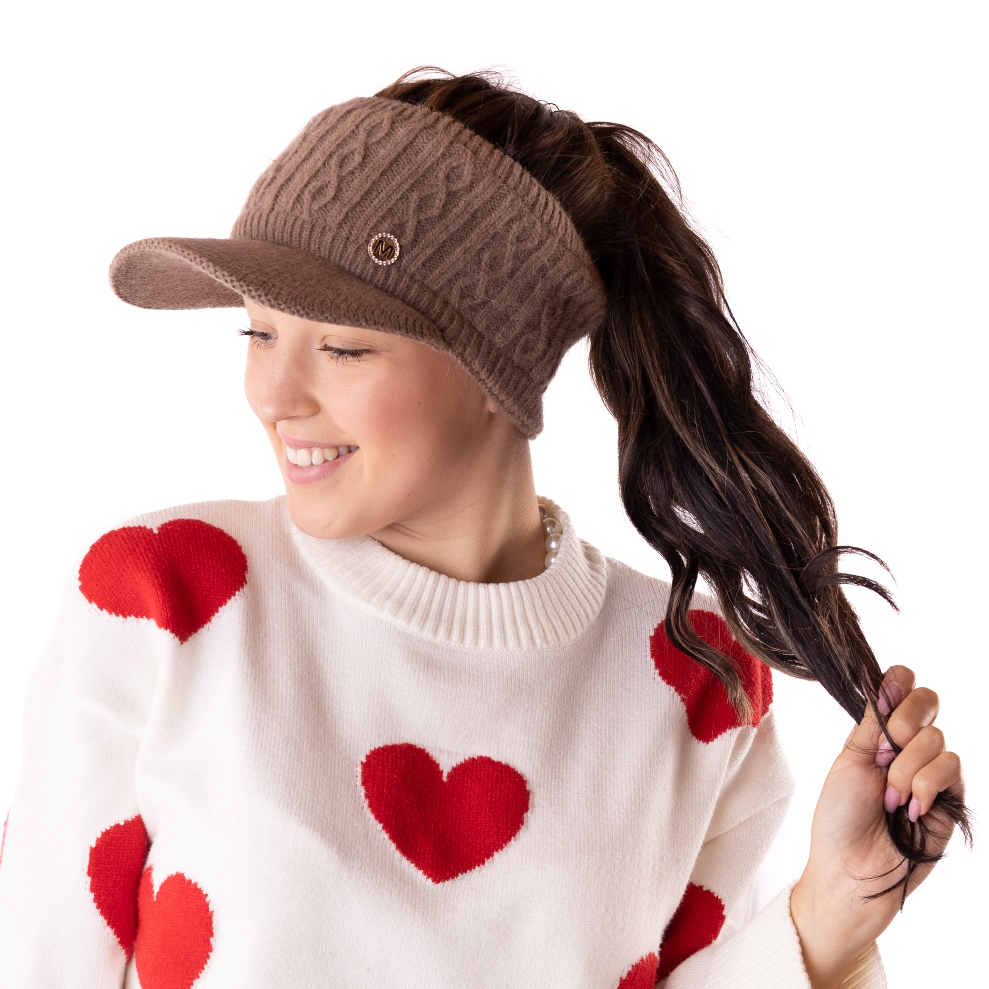 CZAPKA zimowa ciepła z daszkiem na kitkę brązowa