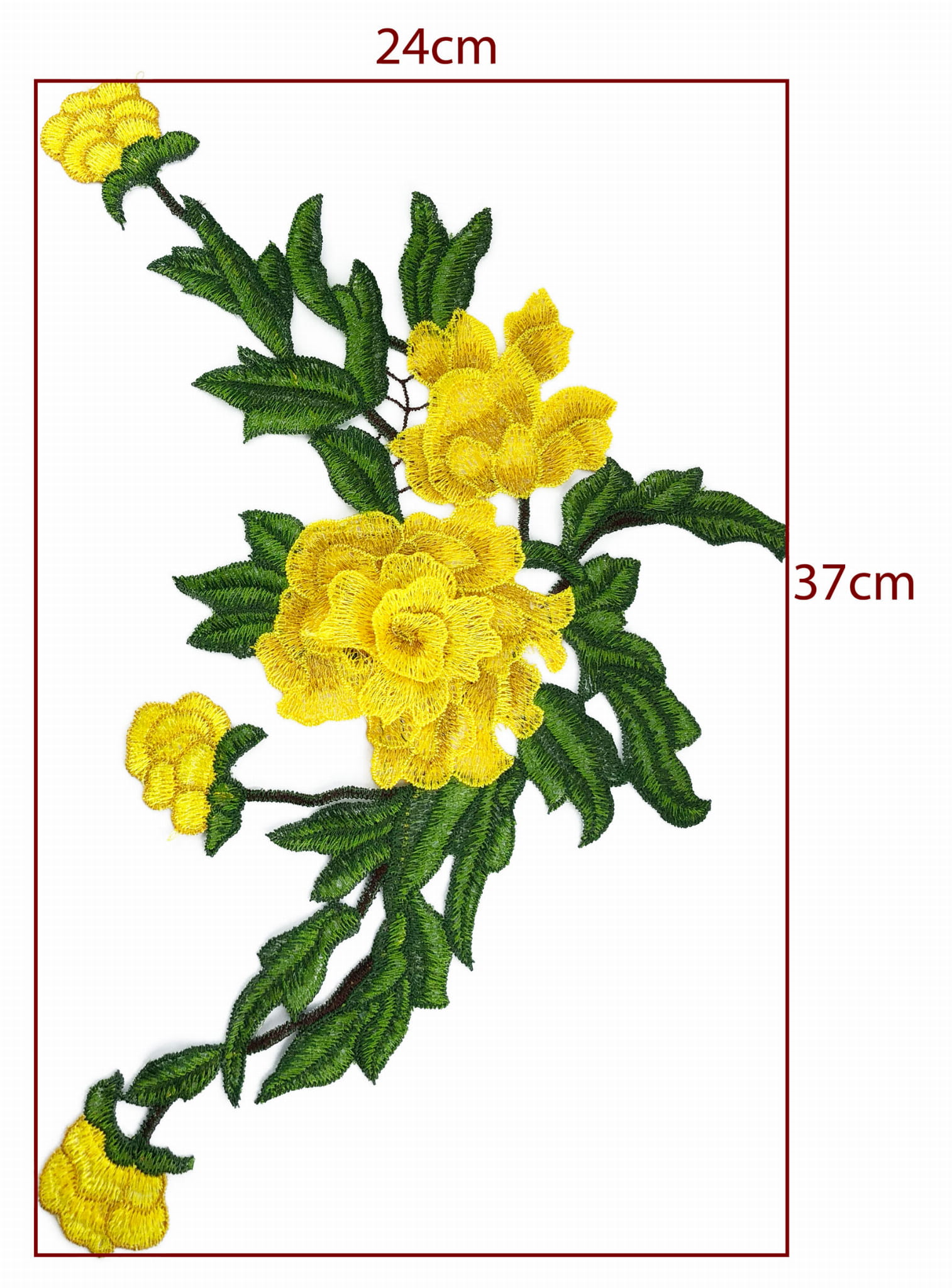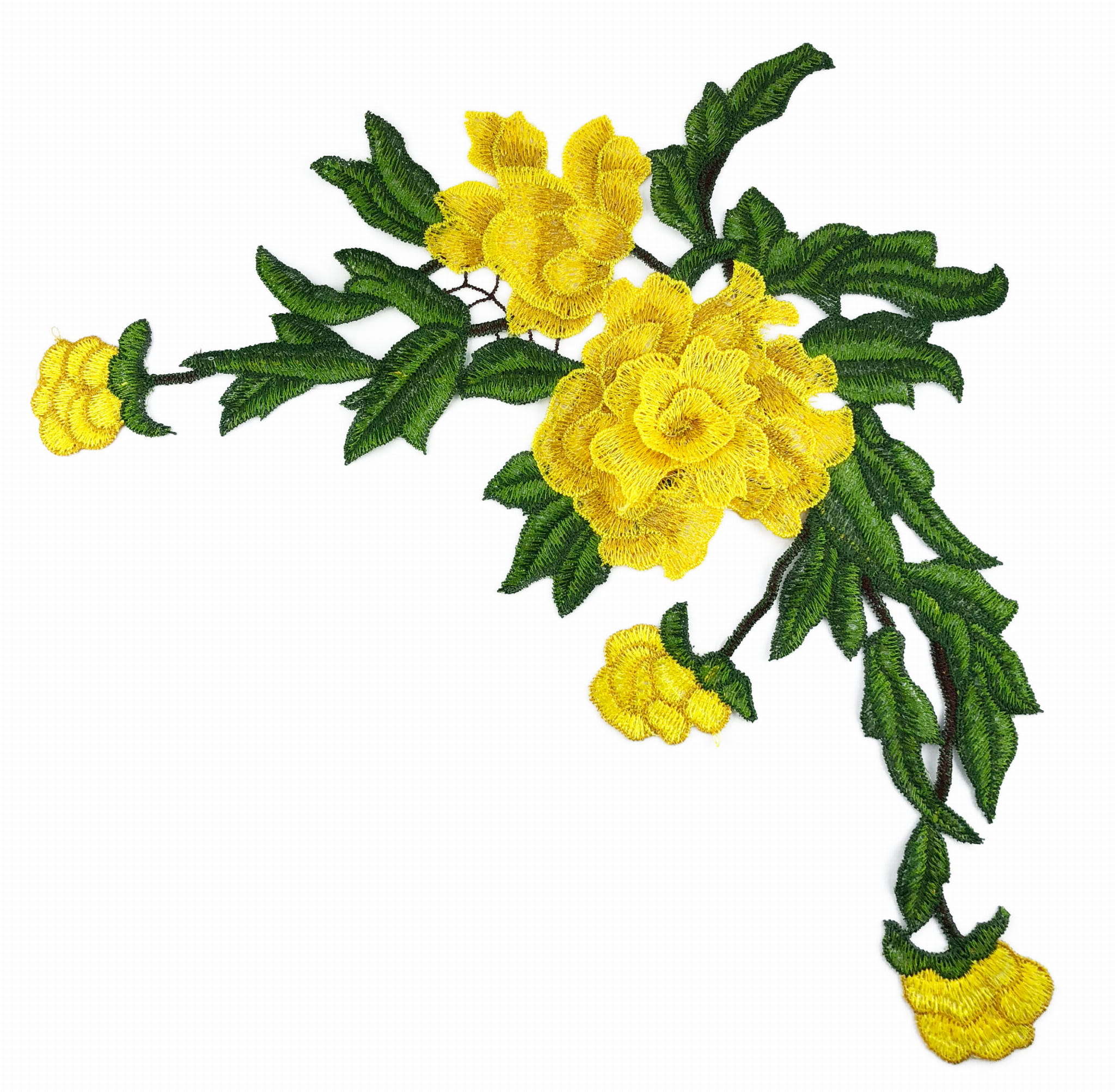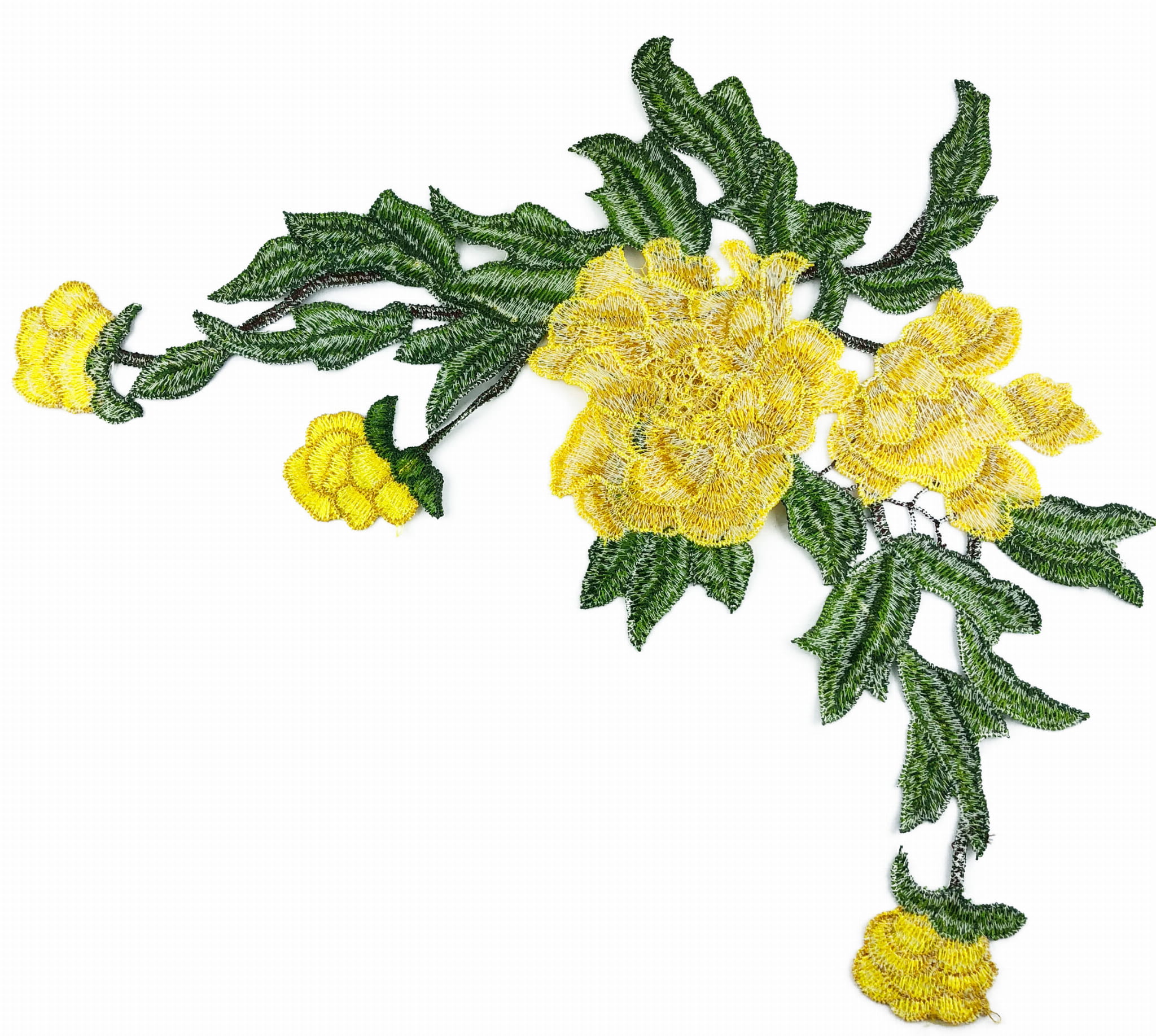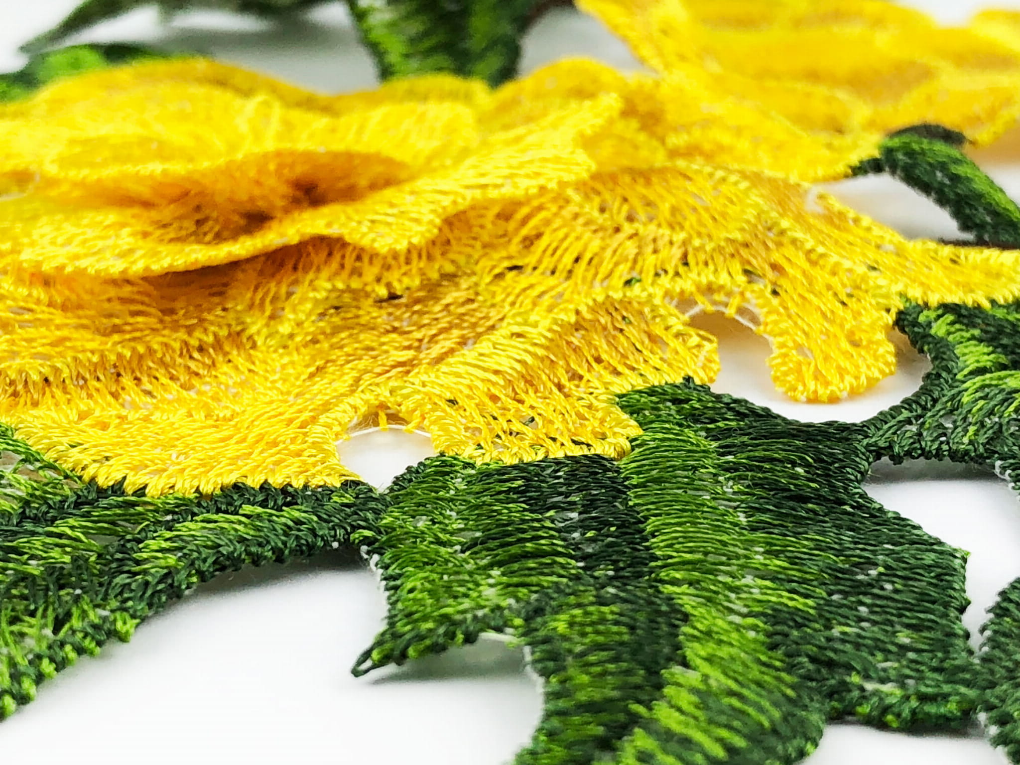 Żywe kolory cieniowanego zielonego i żółtego haftu.