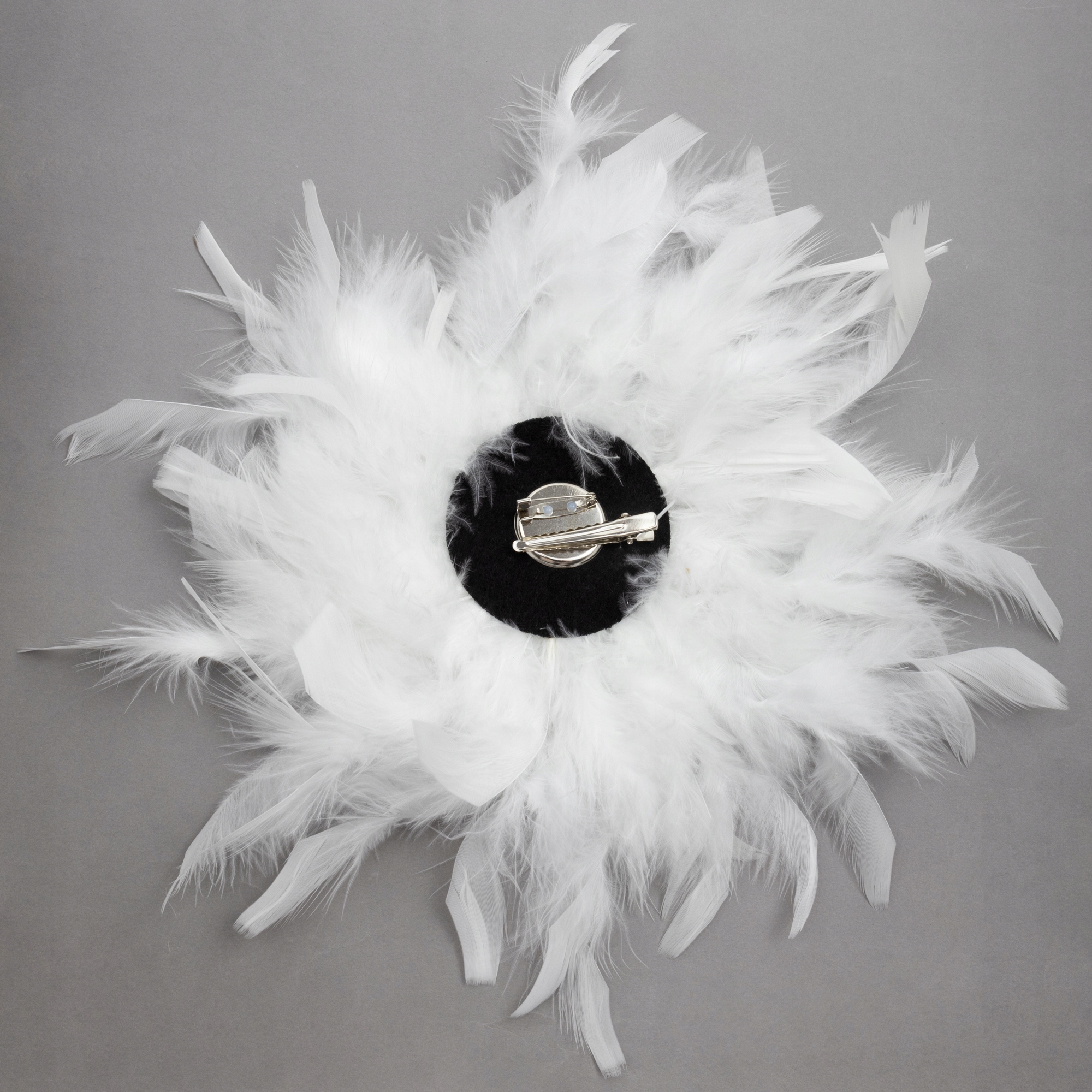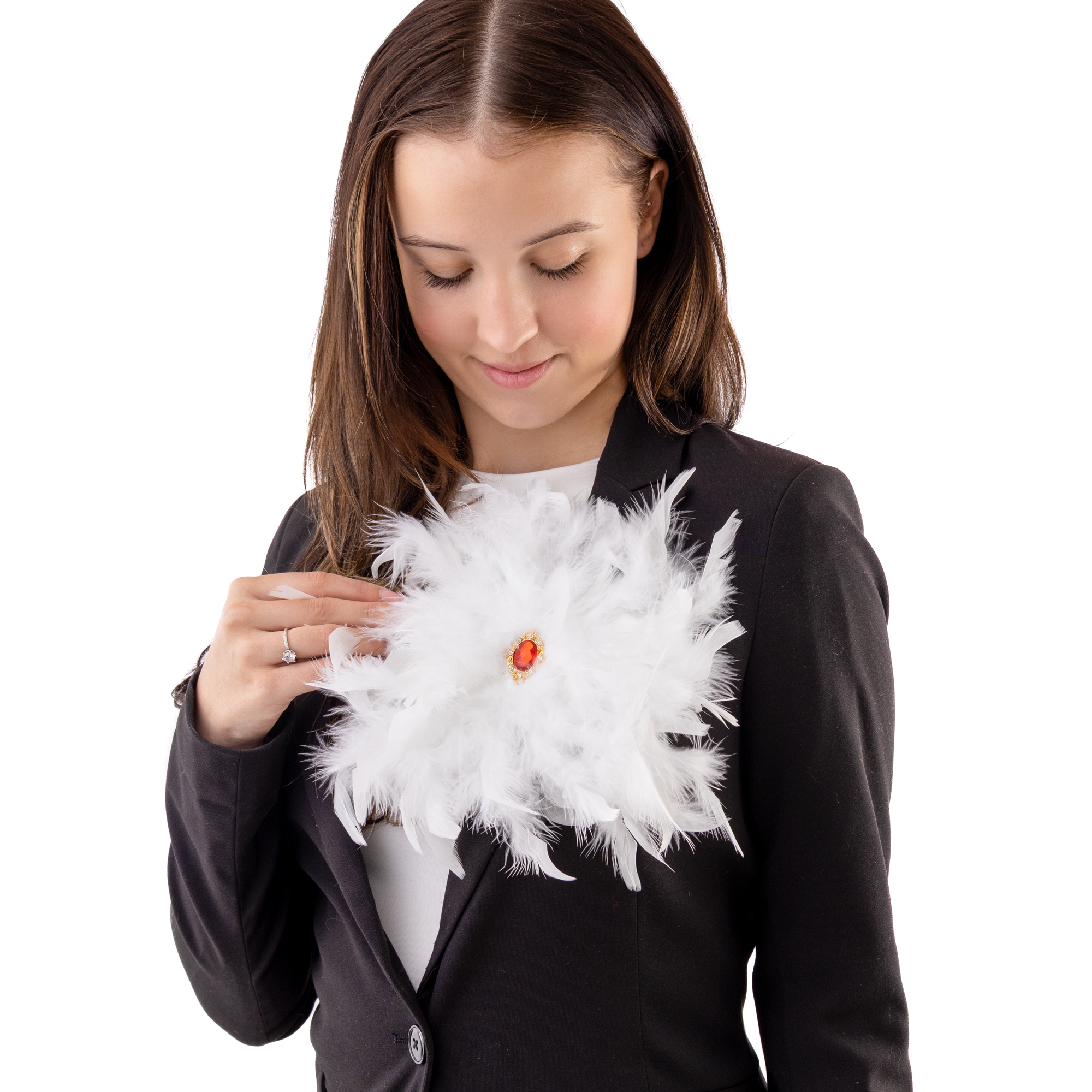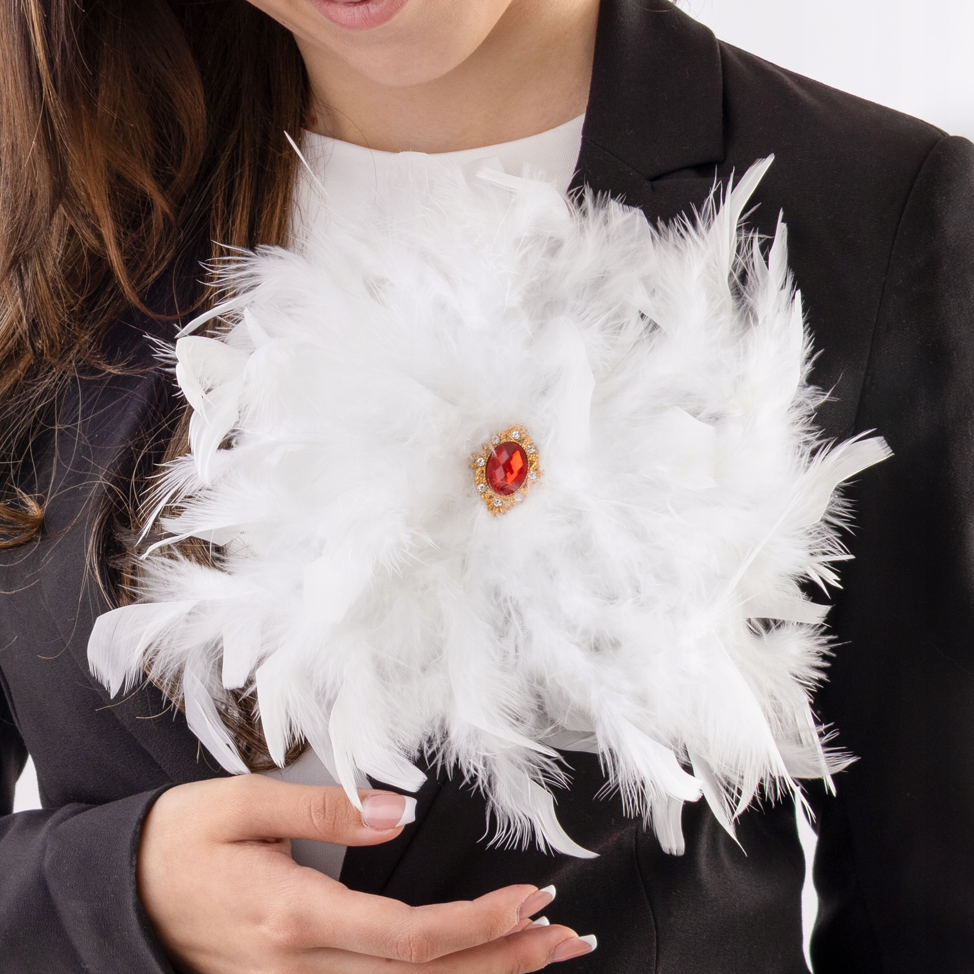 Efektowna Duża broszka z białych piór z czerwonym kamieniem ozdoba