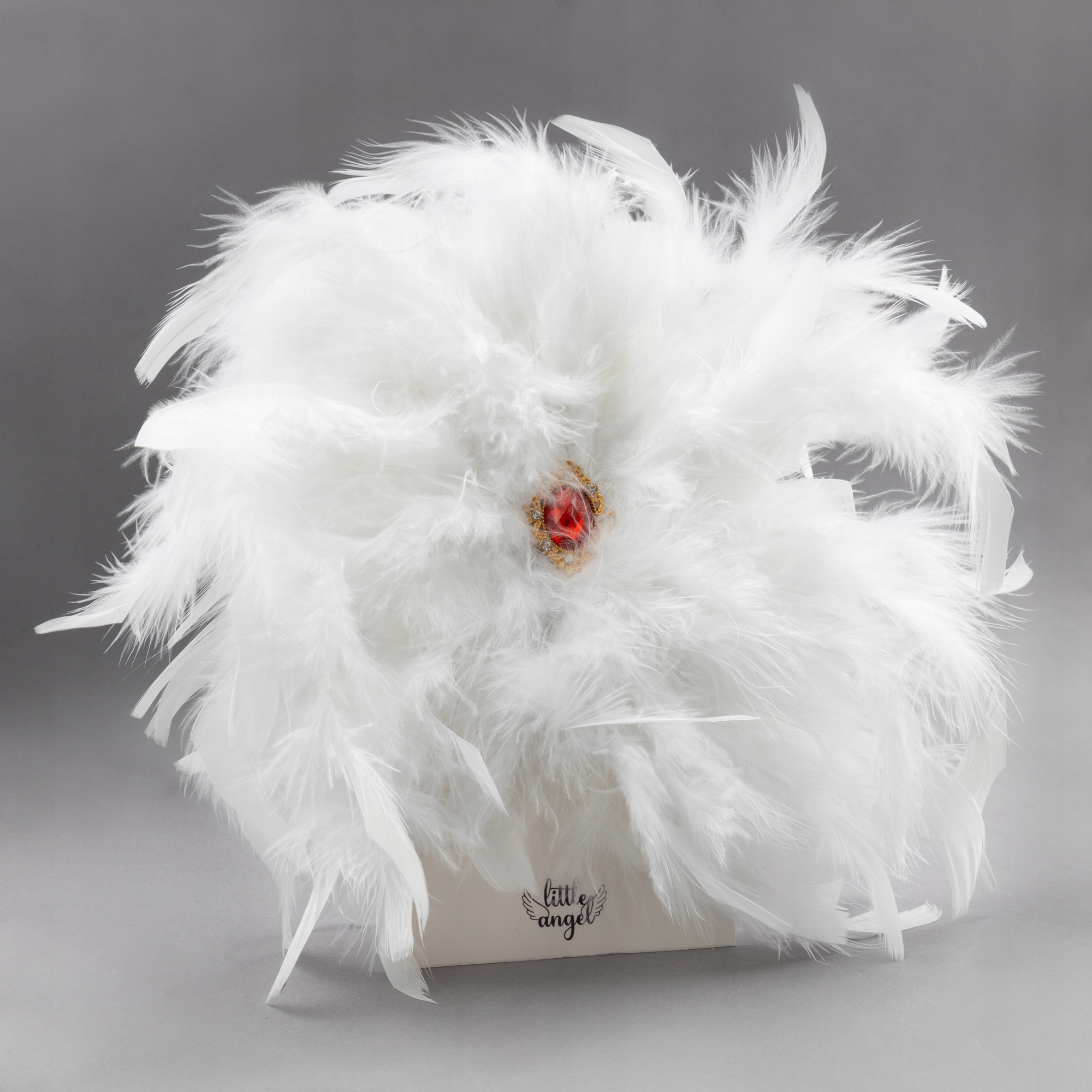 Zjawiskowa broszka z kolekcji Little Angel, wykonana z lekkich, miękkich piór w kolorze śnieżnej bieli. W centralnym punkcie znajduje się duży czerwony kamień osadzony w ozdobnym okuciu, dodający elegancji i charakteru.