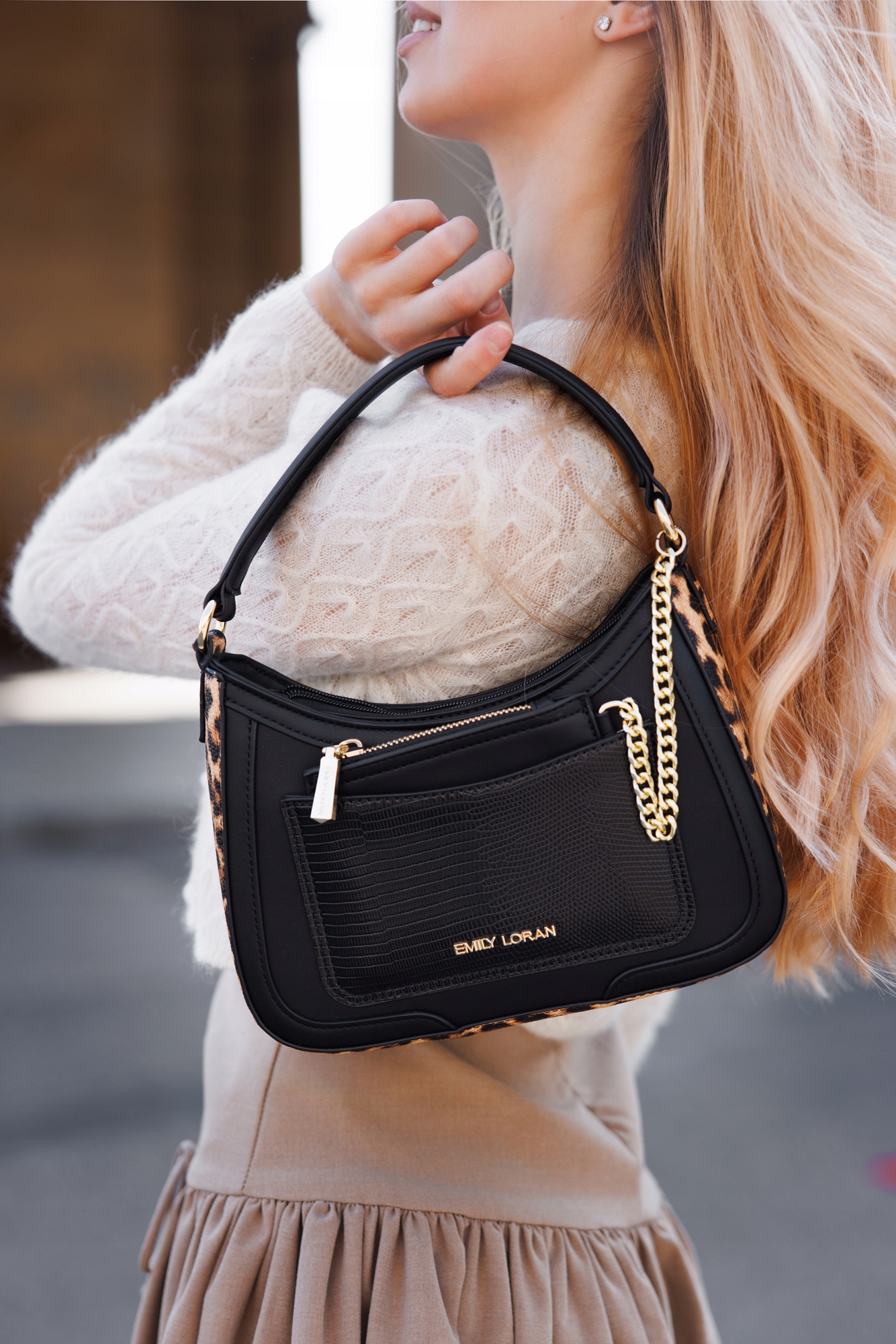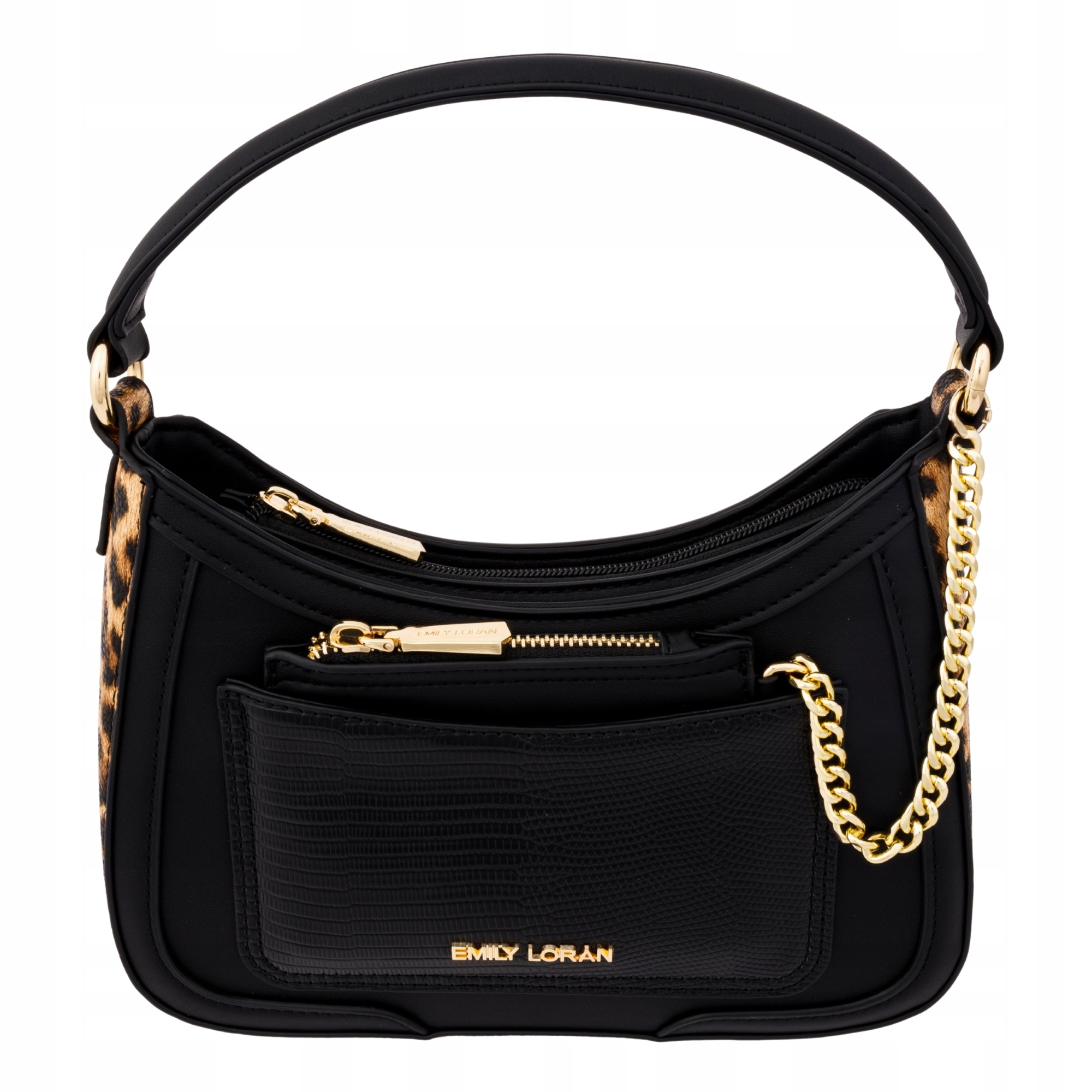 Odkryj wyjątkowy styl z torebką z kolekcji Emily Loran od Little Angel, która łączy klasyczną czerń z odważnym akcentem w postaci bocznych wstawek w panterkowy wzór. To model dla kobiet, które lubią łączyć elegancję z nutą ekstrawagancji.