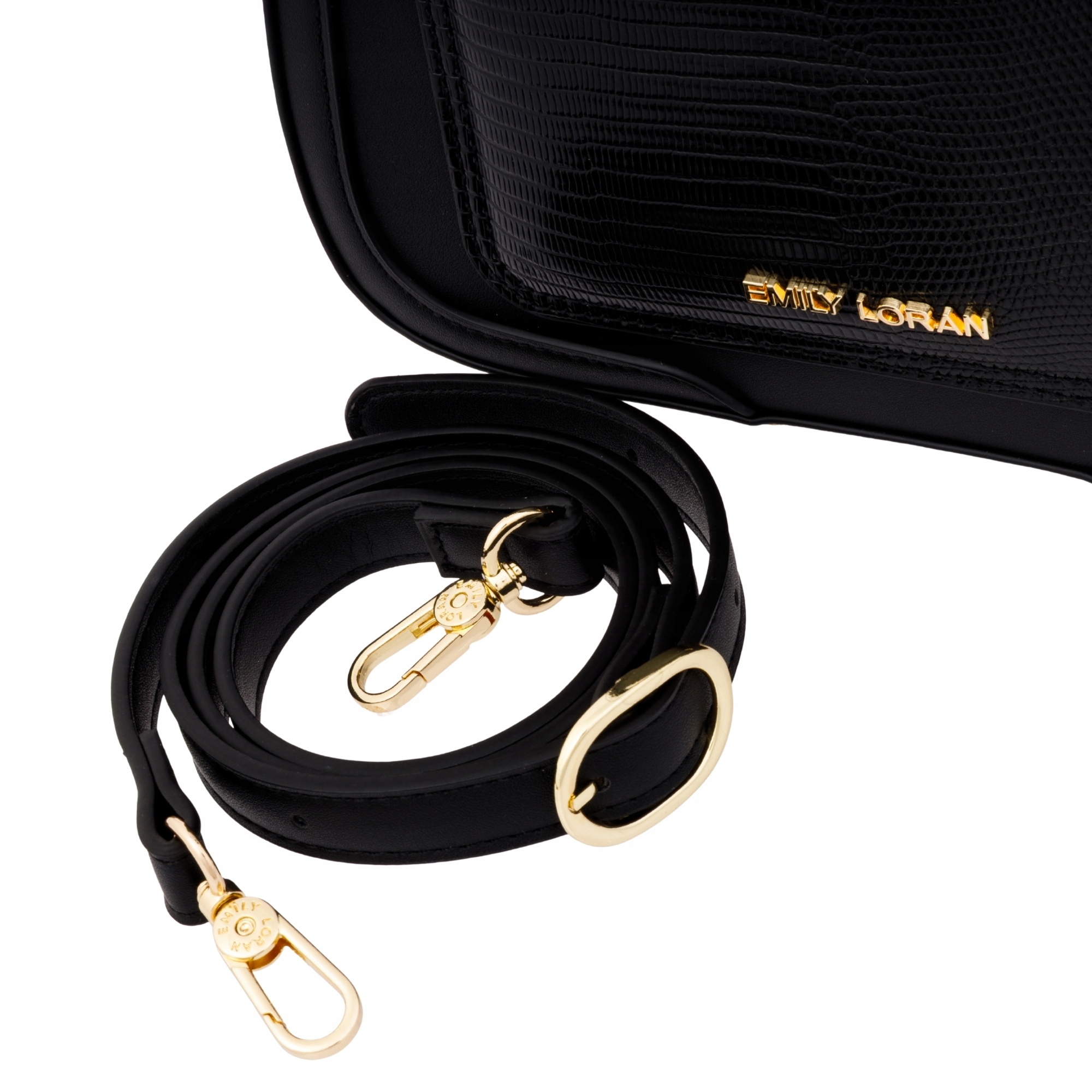 - Detale: złote okucia, łańcuszek, logo