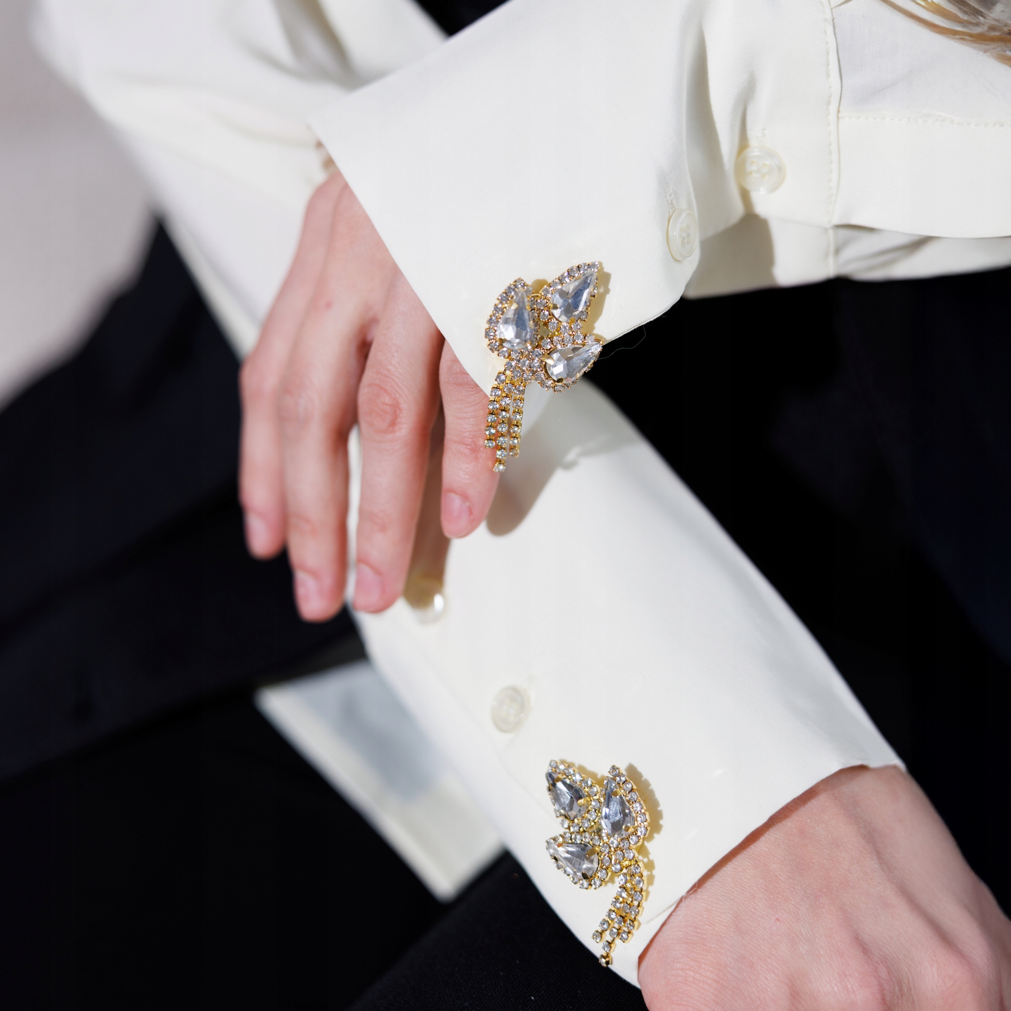 Stylowa nakładka na guzik w kształcie eleganckiej kokardy z kryształami natychmiast odmienia wygląd koszuli, bluzki lub mankietu. Złote wykończenie i lśniące kryształy tworzą luksusowy, biżuteryjny efekt — bez przypinania broszki i bez szycia.