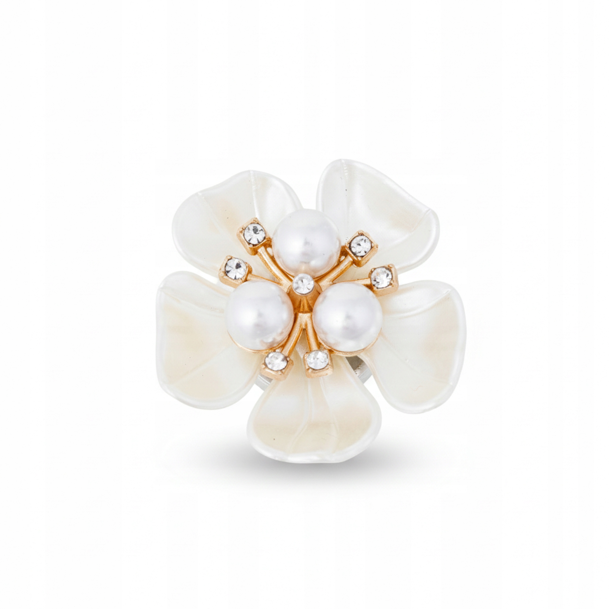 Dekoracyjny kwiat z perłami pięknie odbija światło i przyciąga uwagę, nadając stylizacji luksusowy, kobiecy charakter.
