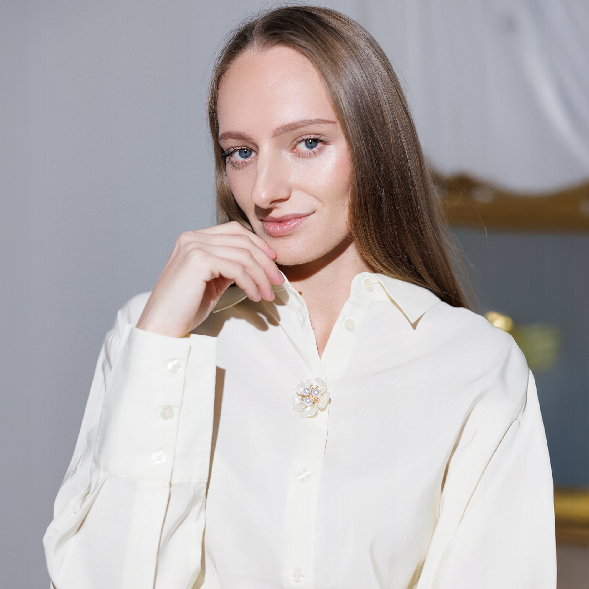Klasyczna biel, eleganckie perły i złote wykończenie tworzą ponadczasową kompozycję pasującą do koszul biznesowych, wizytowych oraz stylizacji eleganckich.