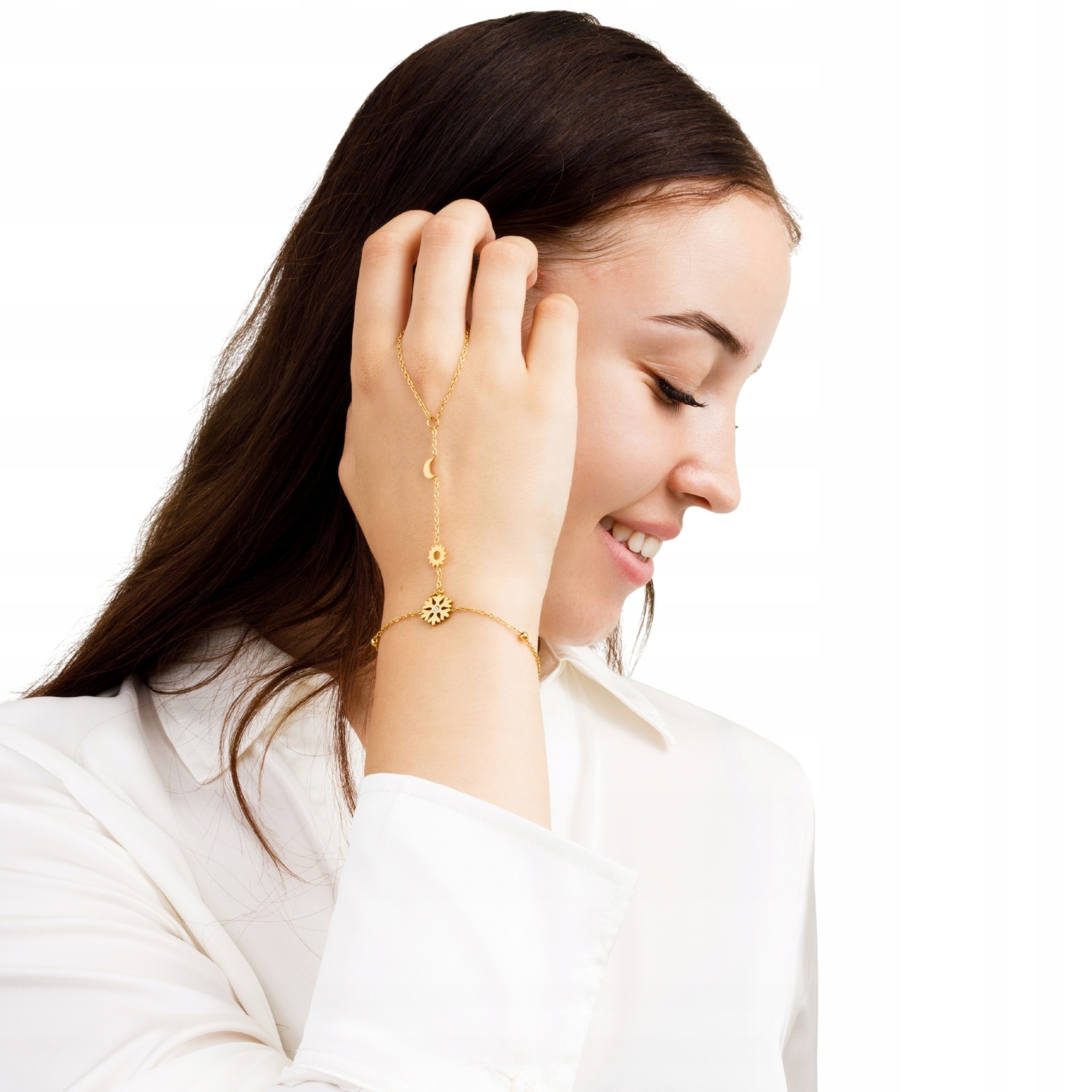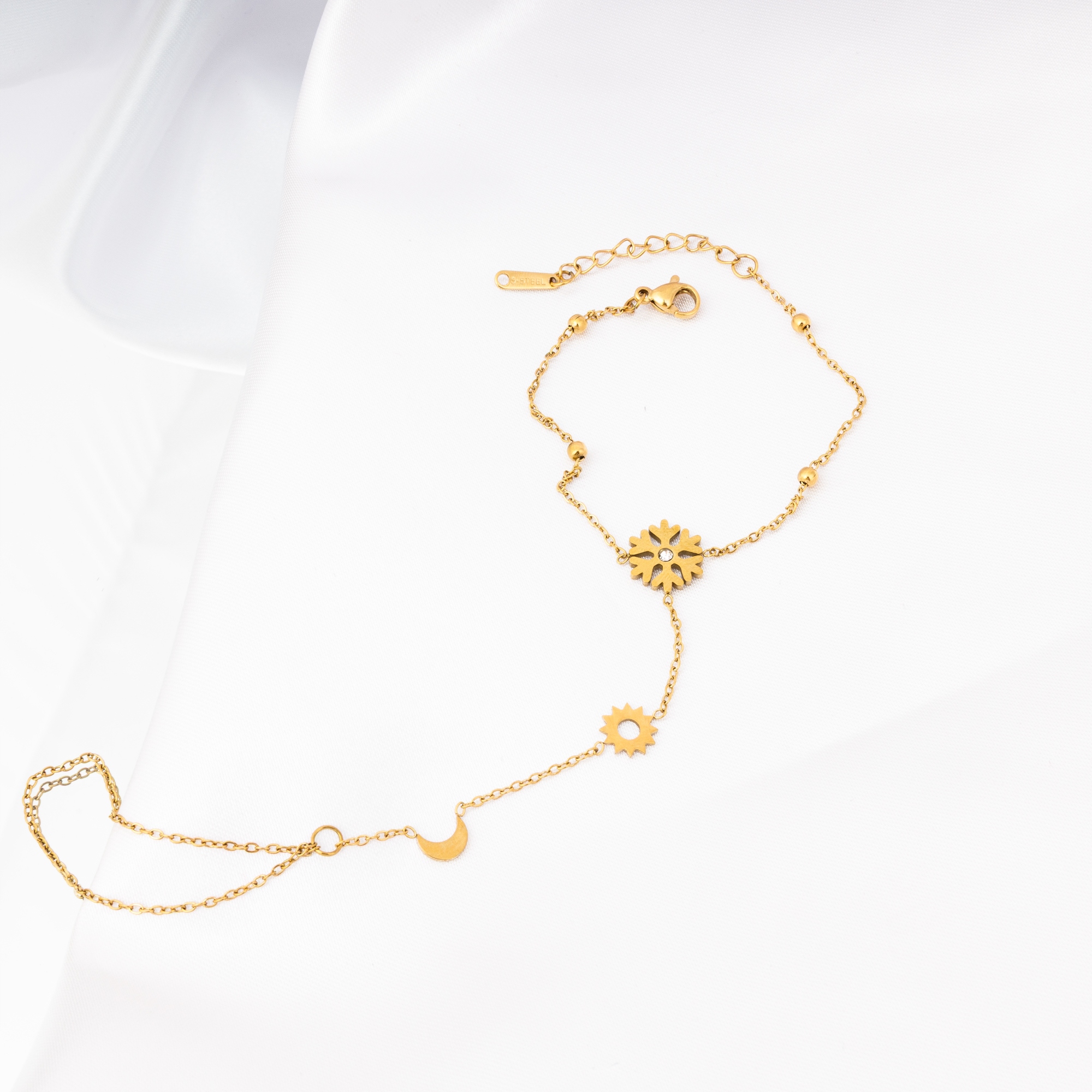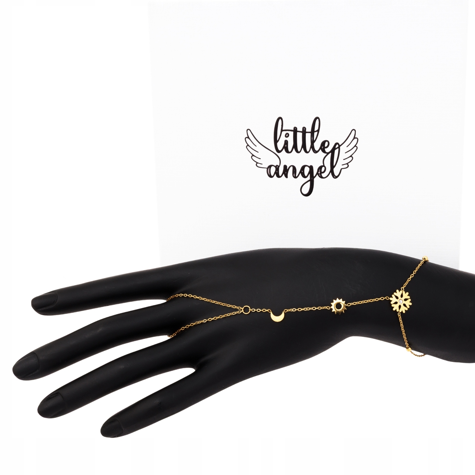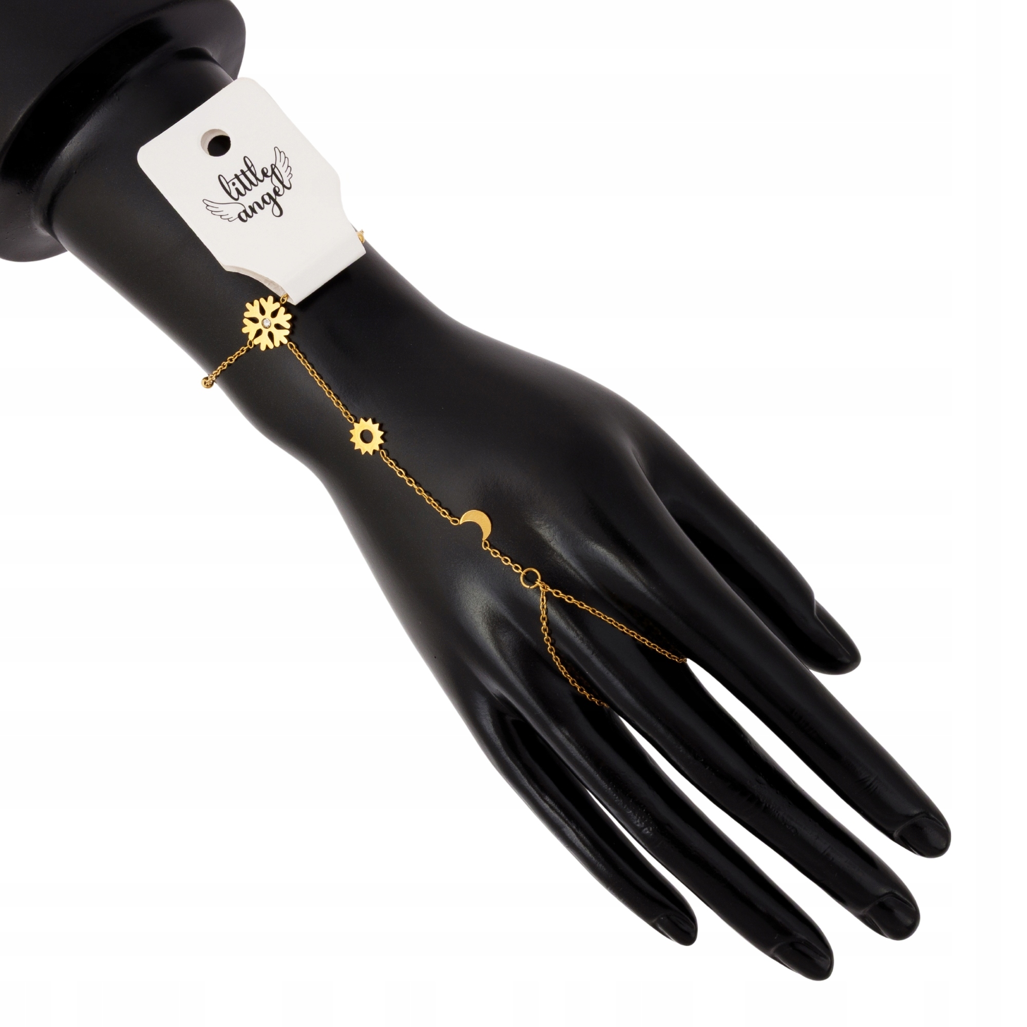 Złota bransoletka na dłoń z motywem śnieżynki z cyrkonią i księżyca – biżuteria łańcuszkowa Little Angel