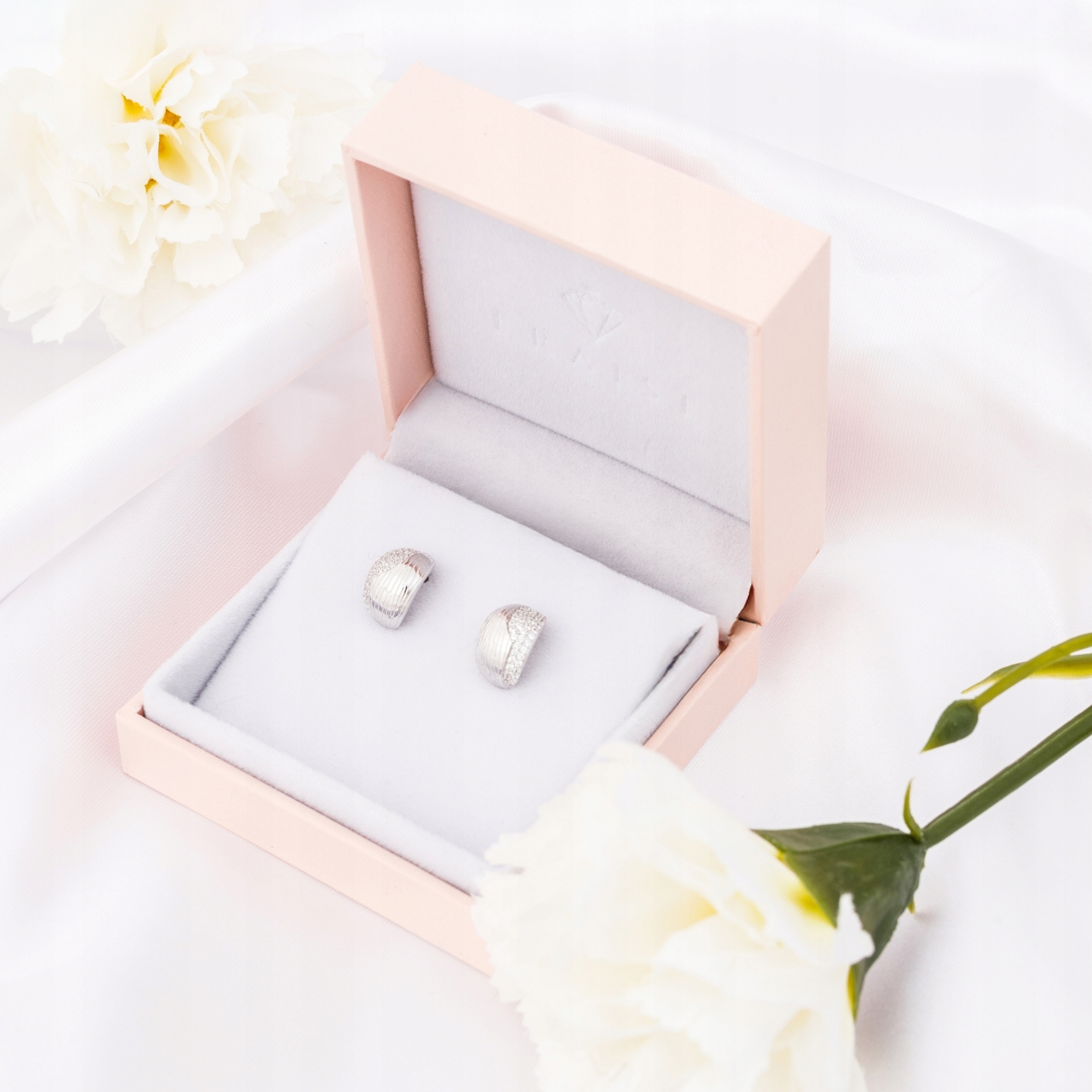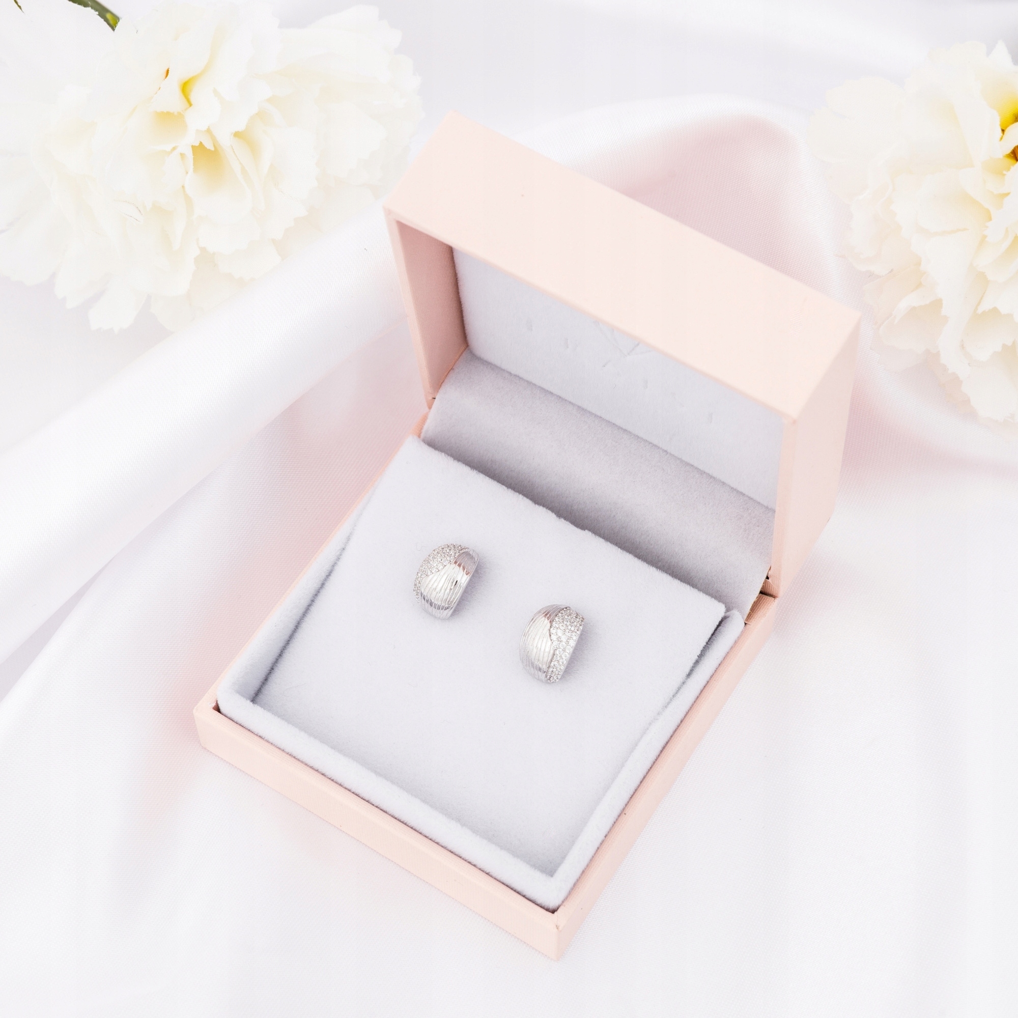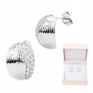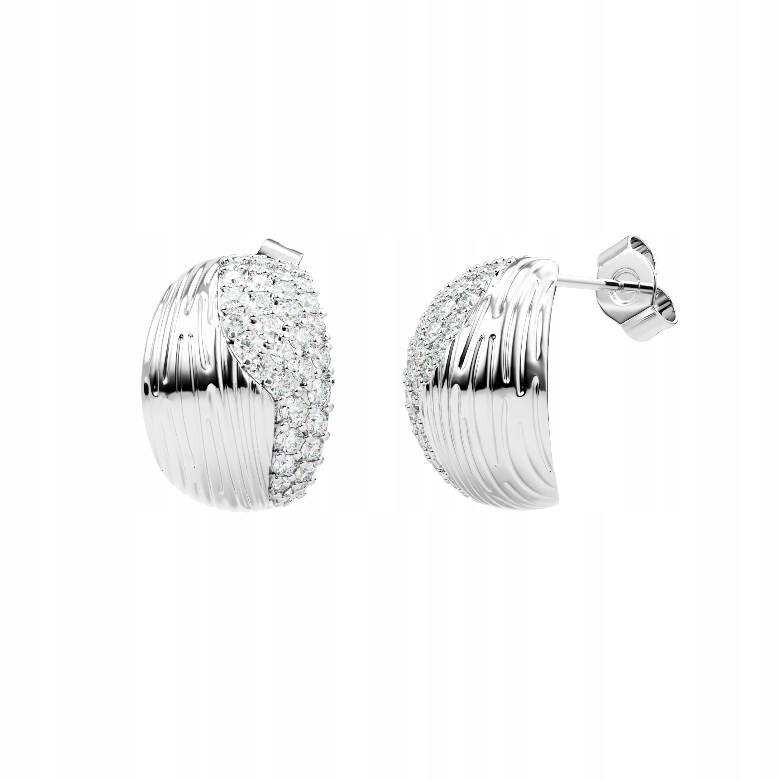 Model półokrągłych kolczyków zachwyca piękną, falowaną strukturą oraz wyraźnie błyszczącą częścią wysadzaną cyrkoniami, które dodają im luksusowego charakteru.
