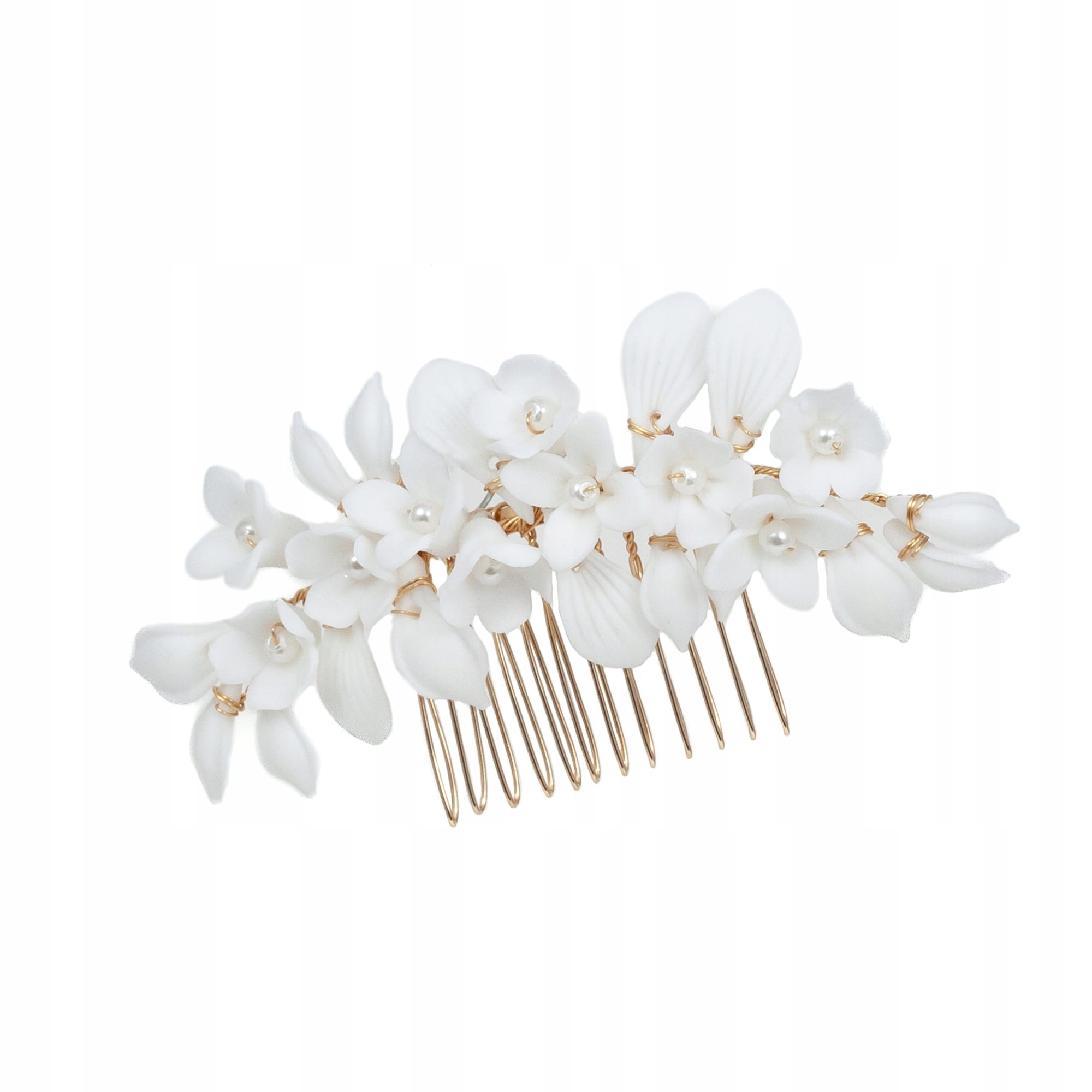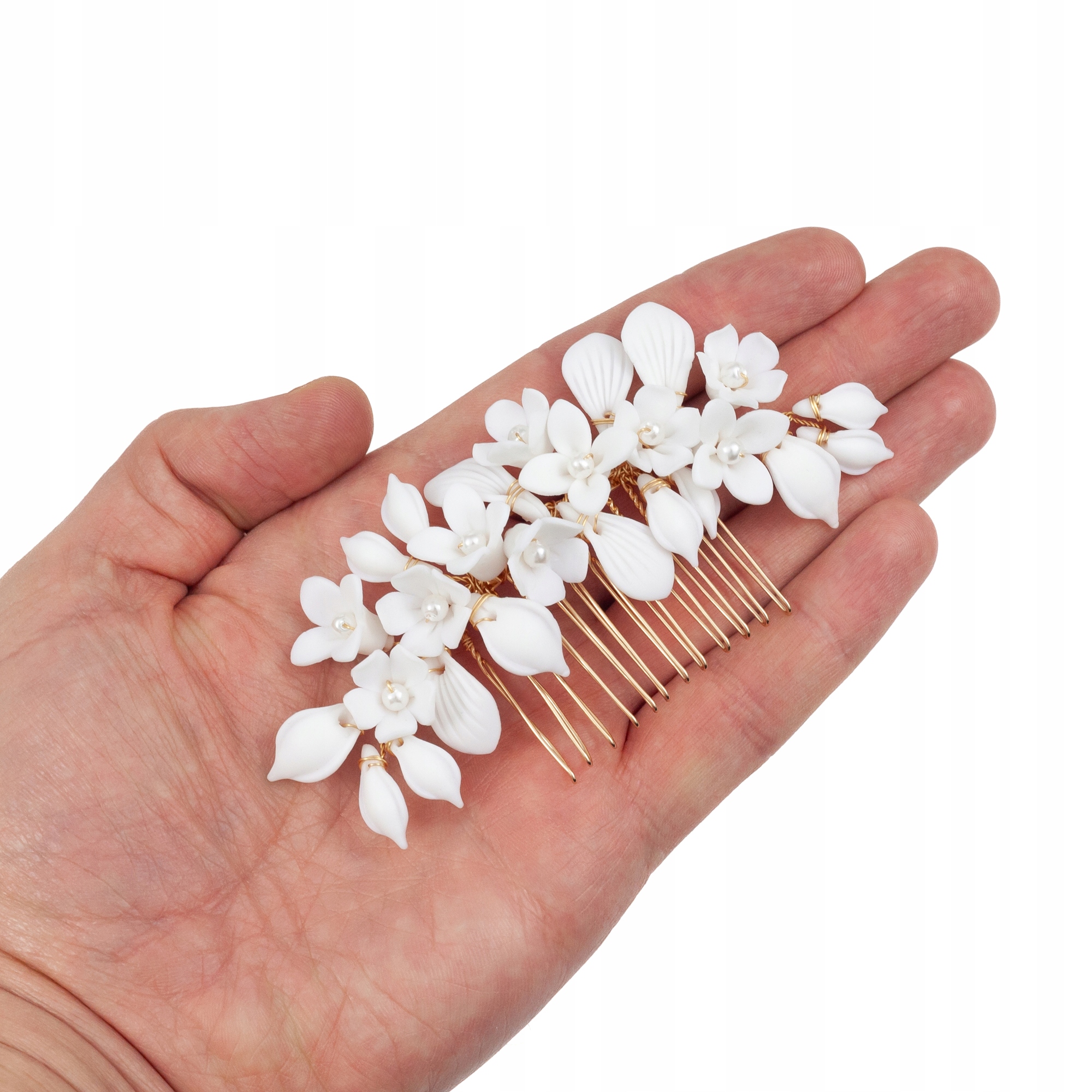Grzebyk do włosów ozdoba ślubna z kwiatami koralikami złota biała