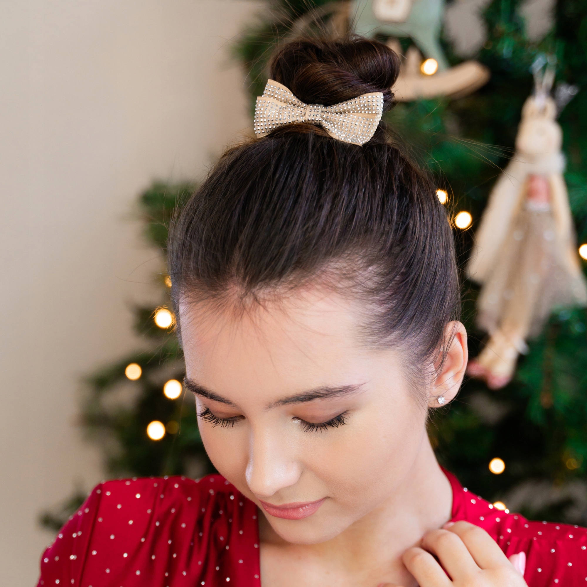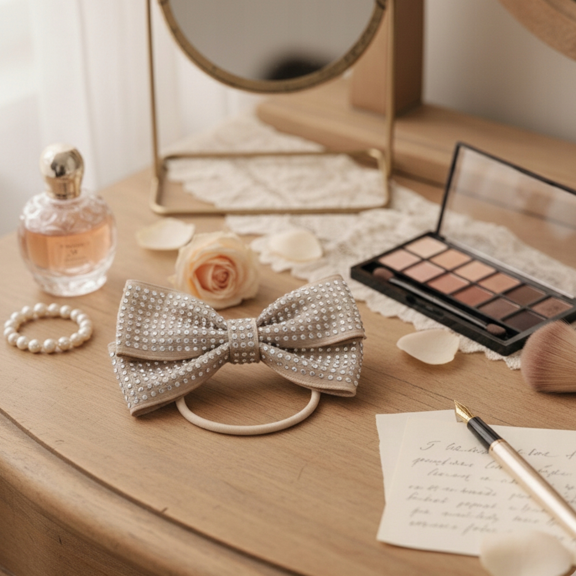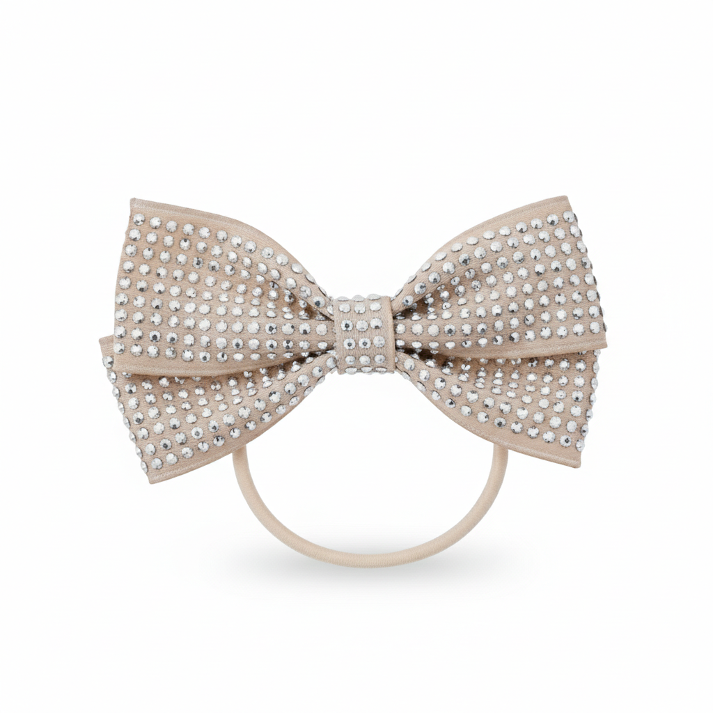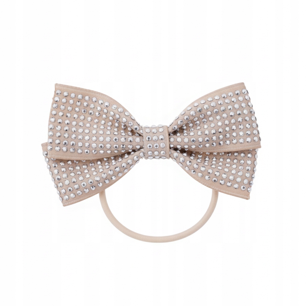 Stylowa gumka do włosów z dużą kokardą w beżowym odcieniu, pokrytą drobnymi kryształkami. Subtelny połysk pięknie odbija światło i nadaje fryzurze elegancki, luksusowy charakter. Elastyczna gumka dobrze trzyma włosy, nie ciągnie i jest komfortowa w noszeniu.