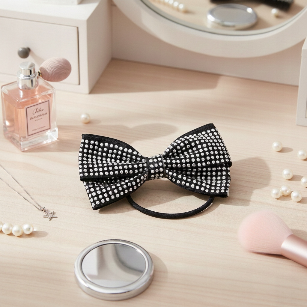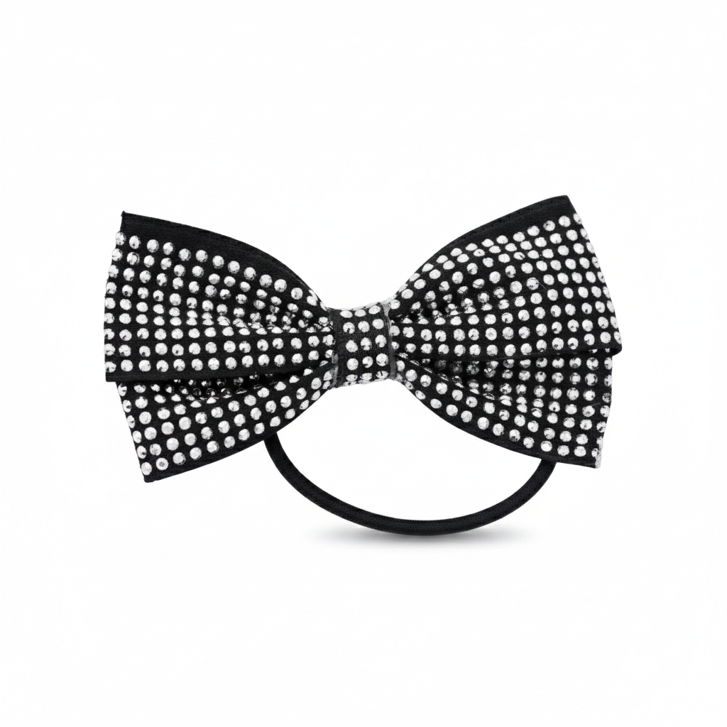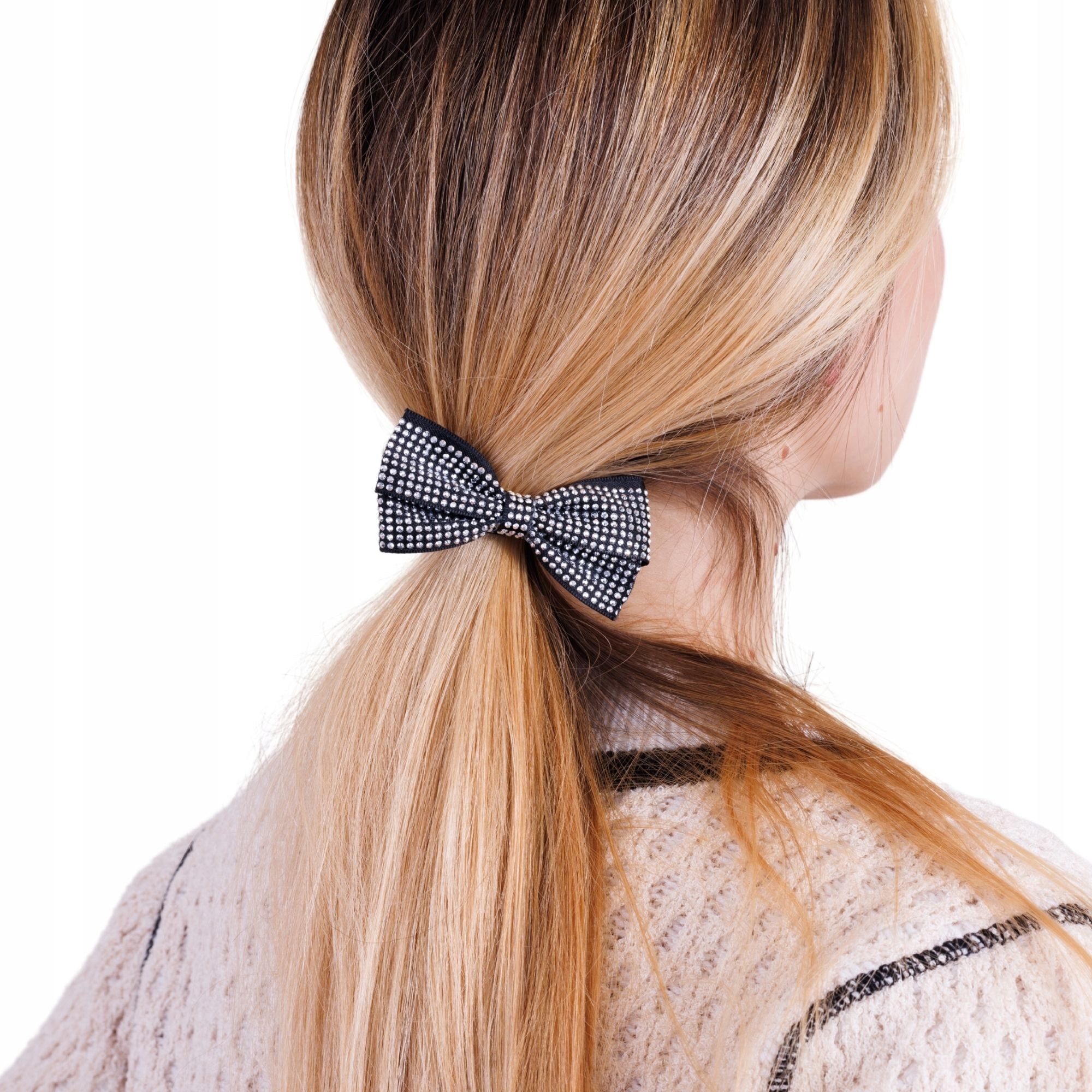Elegancka gumka do włosów z dużą czarną kokardą, bogato zdobioną drobnymi srebrnymi kryształkami. Pięknie odbija światło i nadaje fryzurze wyjątkowy, stylowy charakter. Elastyczna gumka dobrze trzyma włosy, nie ciągnie i jest komfortowa w noszeniu.