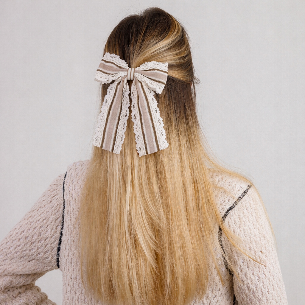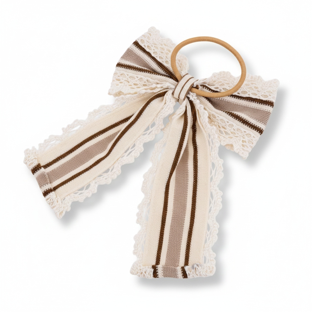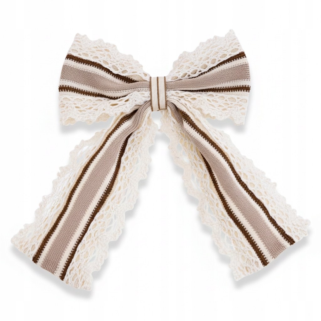 Ozdobna gumka do włosów Little Angel z materiałową kokardą łączy delikatną koronkę z miękką wstążką w beżowo-kremowych odcieniach. To subtelny dodatek, który pięknie podkreśla fryzurę i dodaje jej romantycznego charakteru.