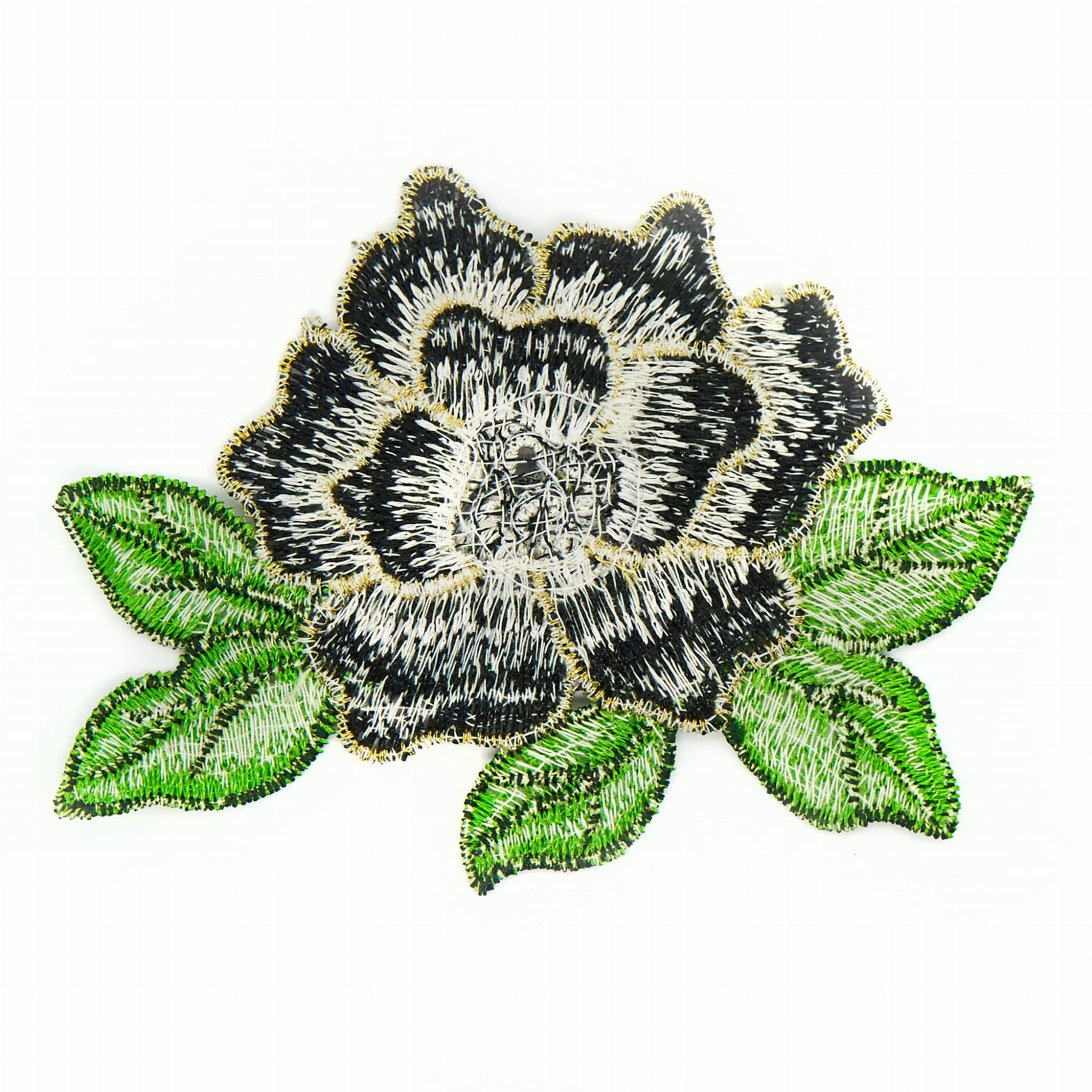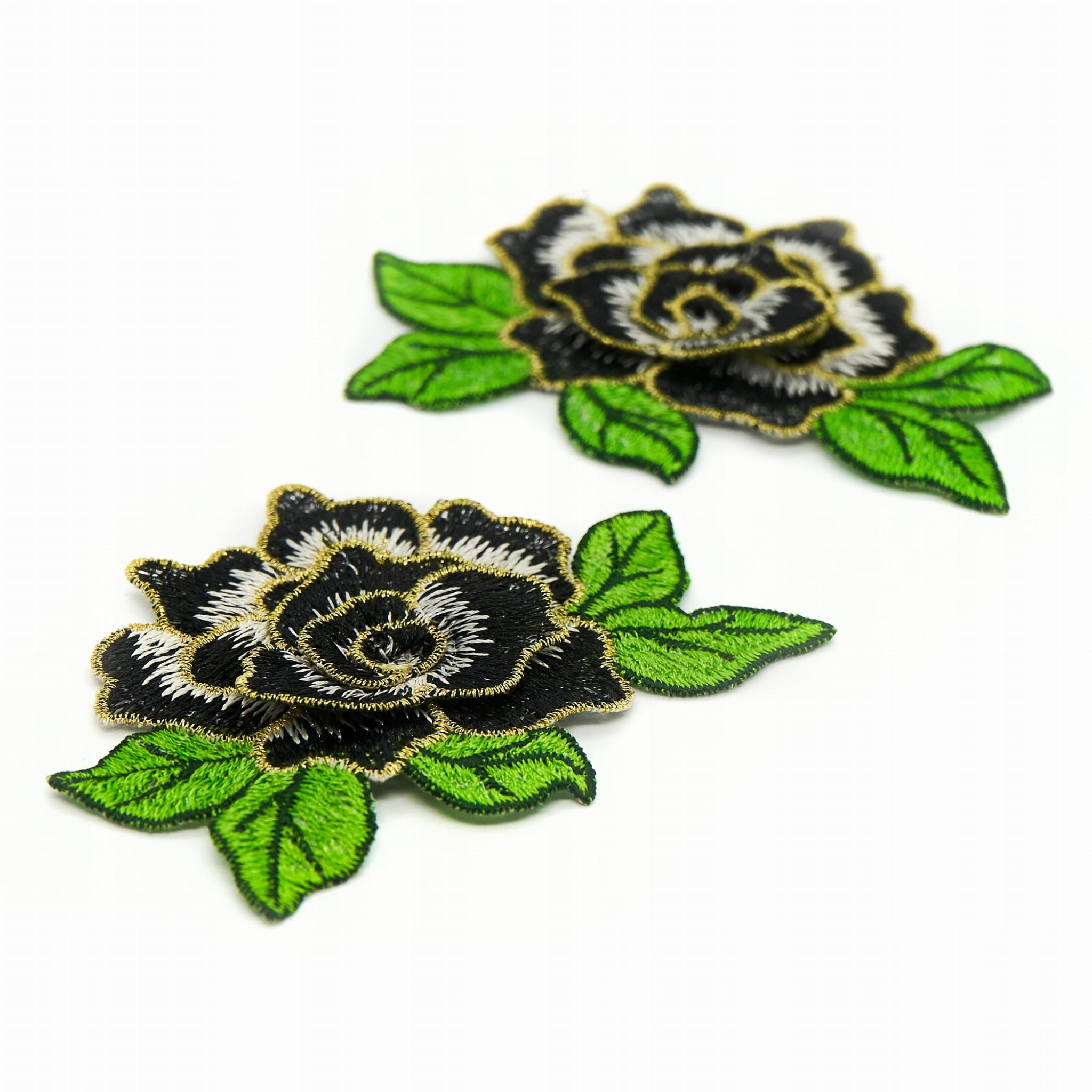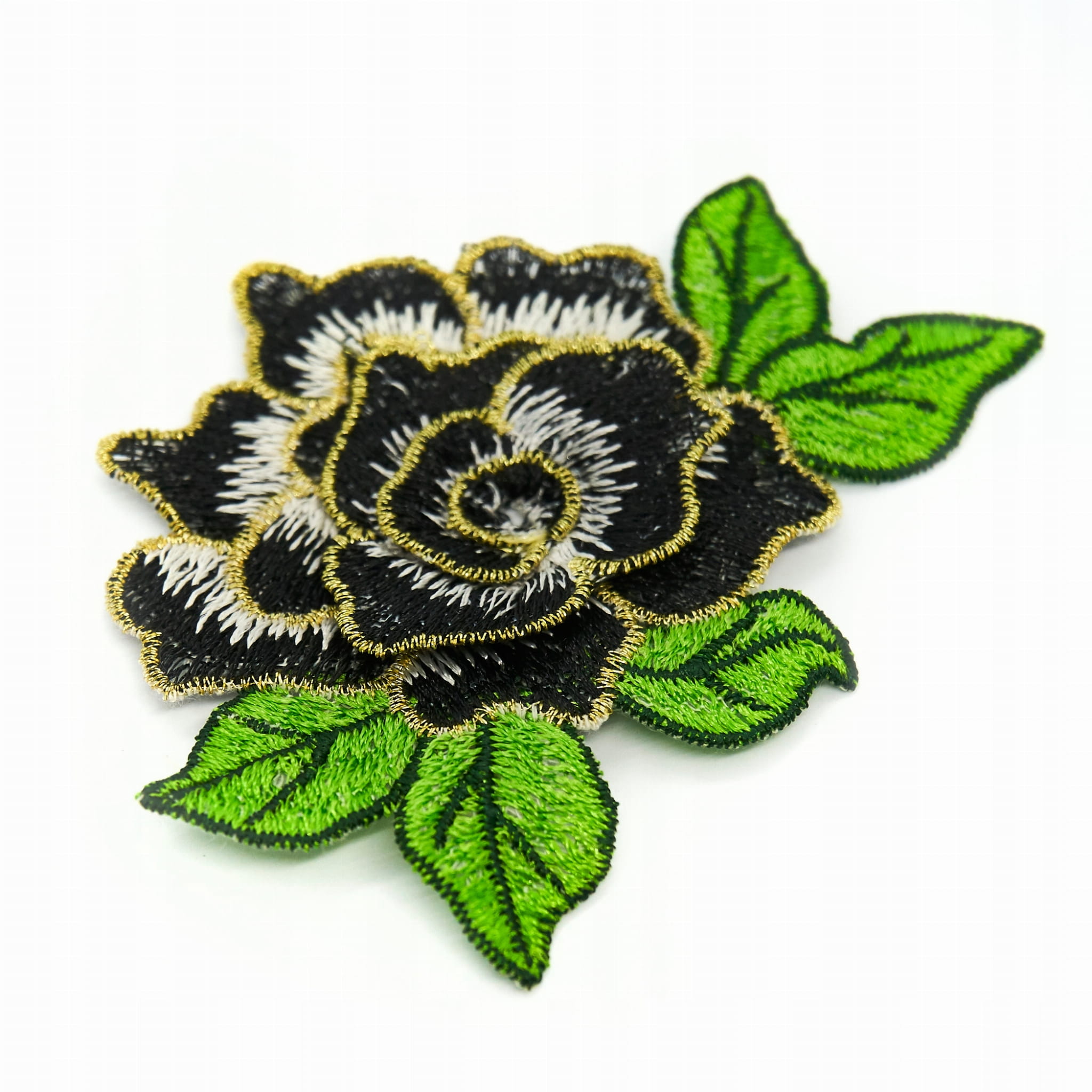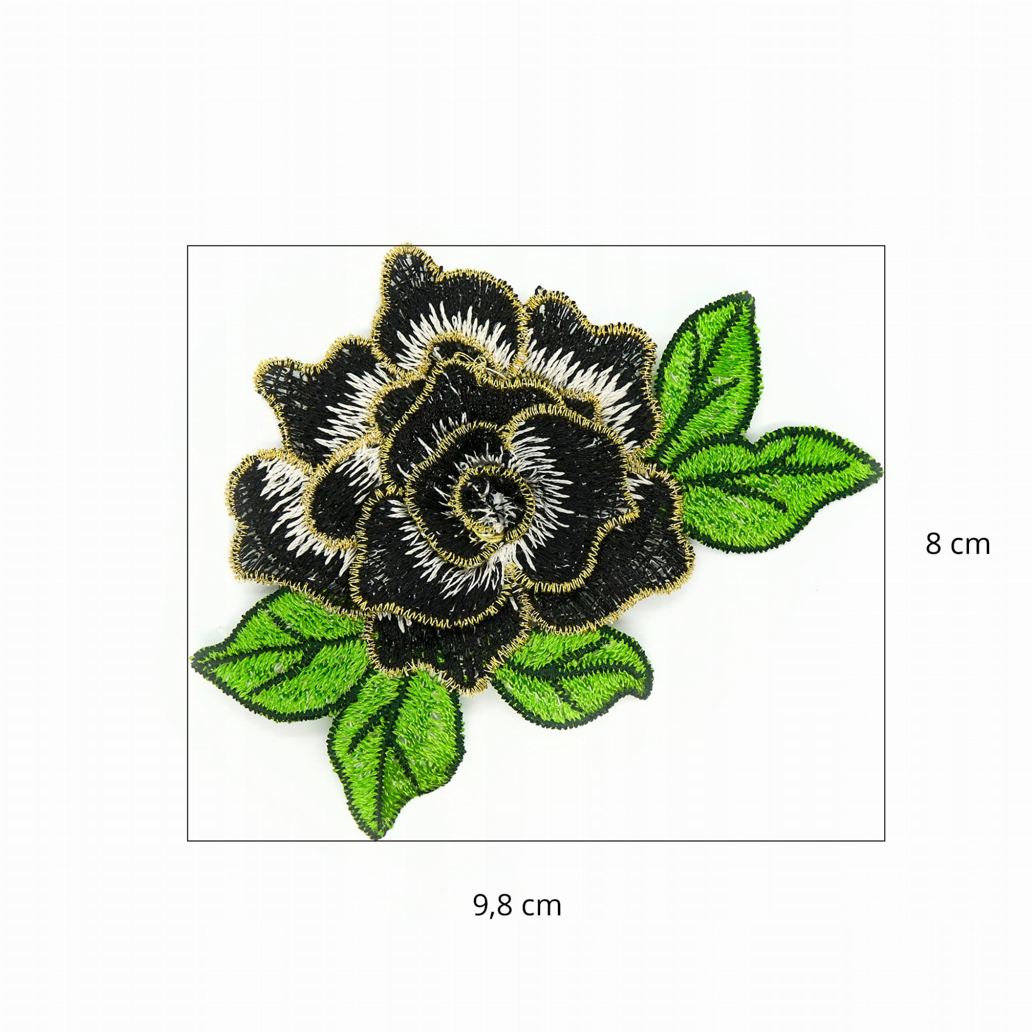Aplikacja CZARNA róża ze złotymi obszyciami i zielonymi listkami.