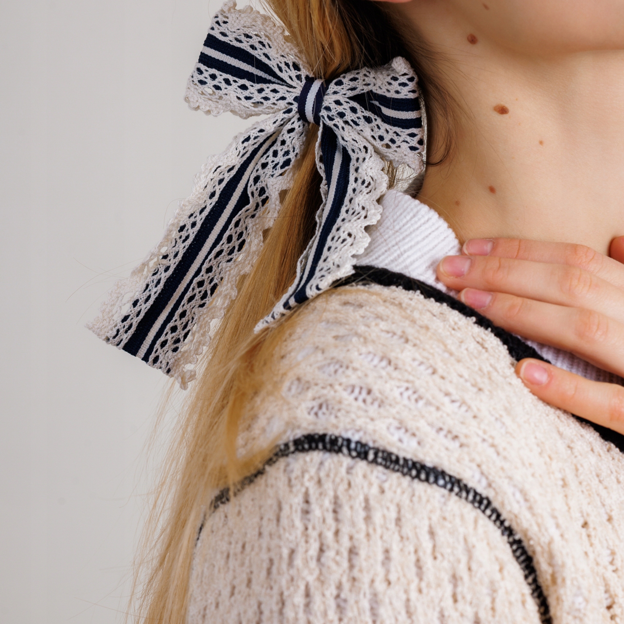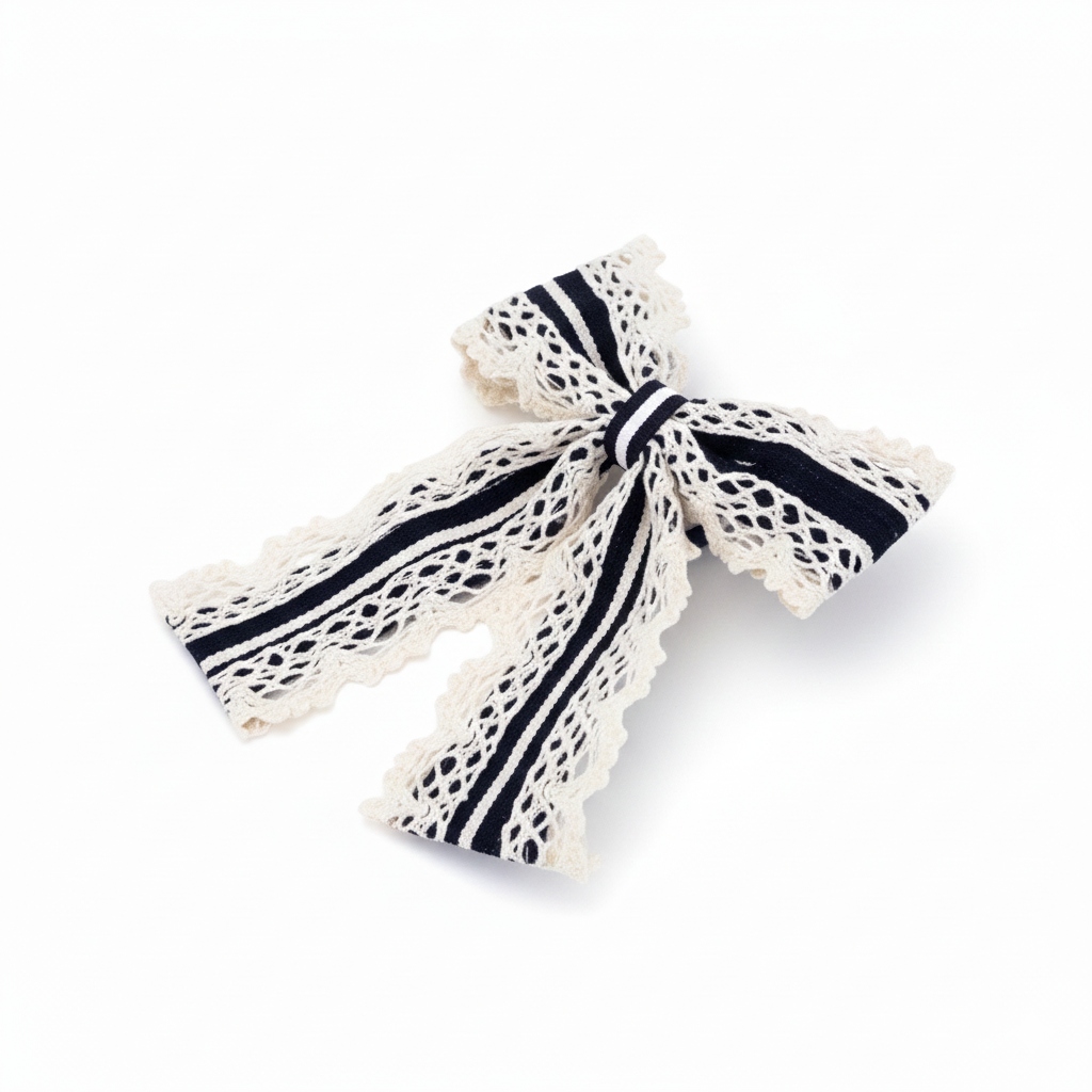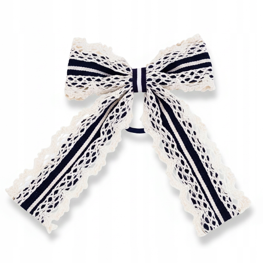 Ozdobna gumka do włosów Little Angel z efektowną materiałową kokardą to połączenie romantycznej koronki i klasycznych granatowych pasków w stylu marynistycznym. Idealna zarówno do codziennych stylizacji, jak i na wyjątkowe okazje.