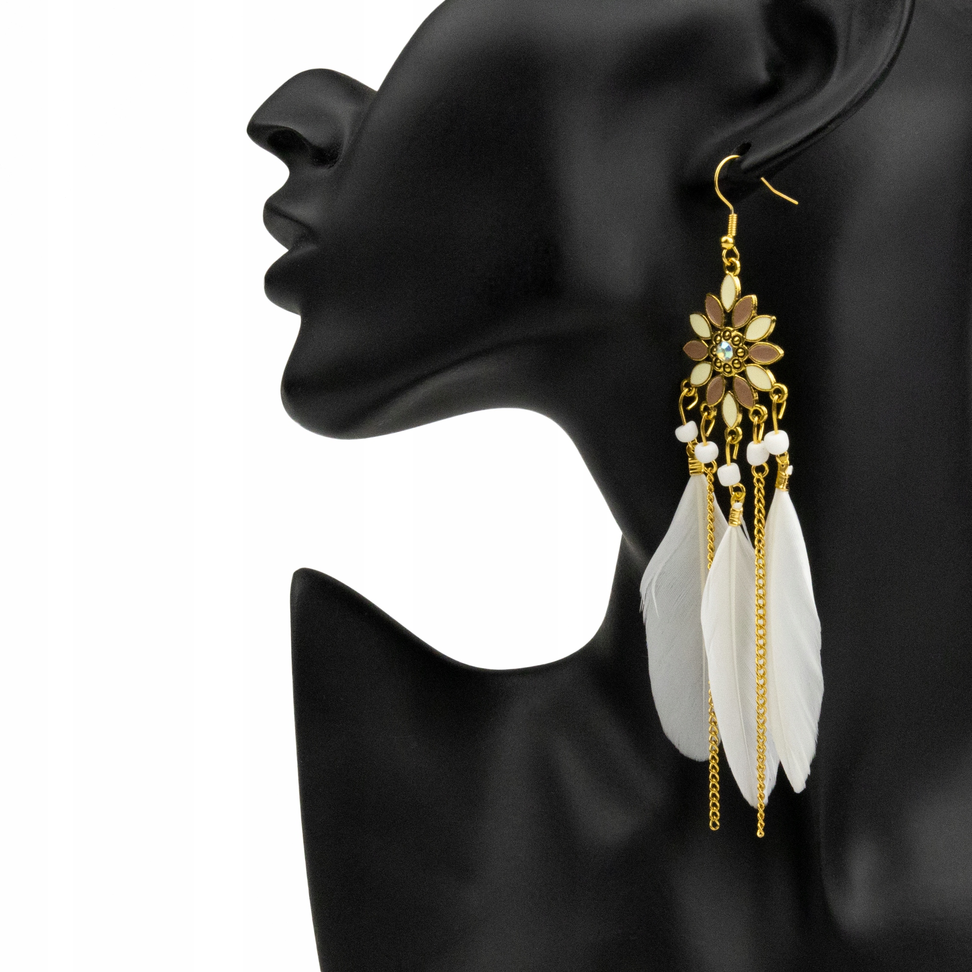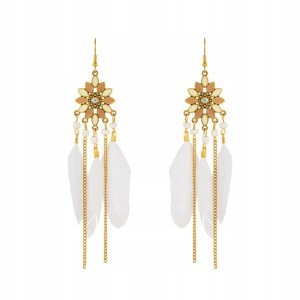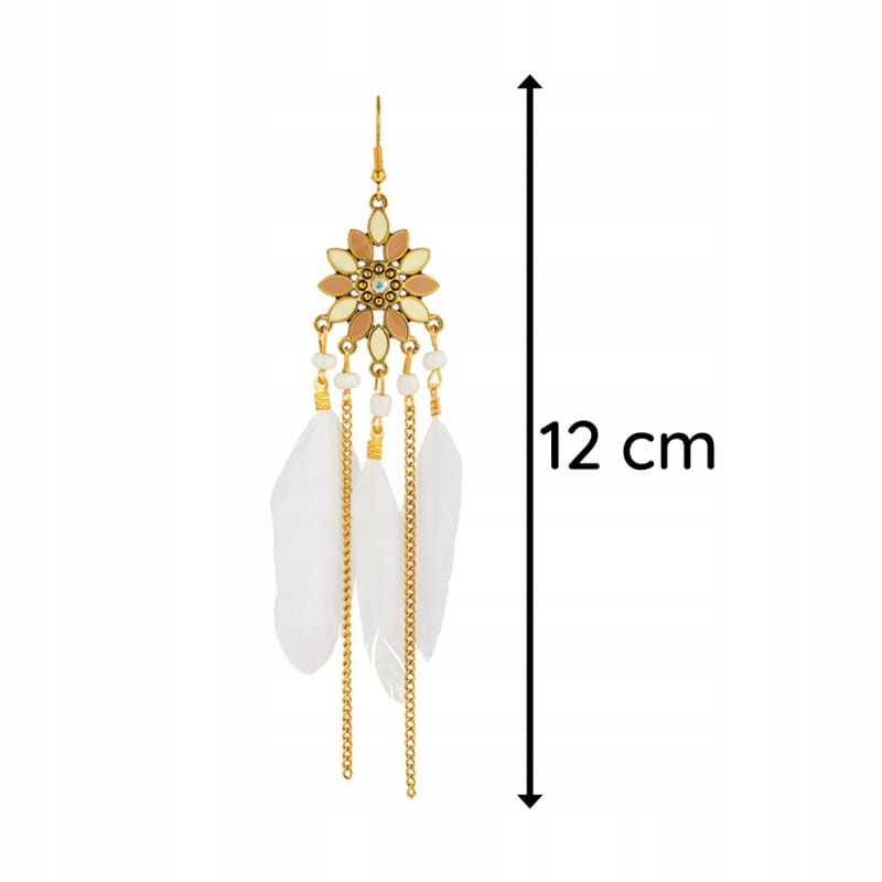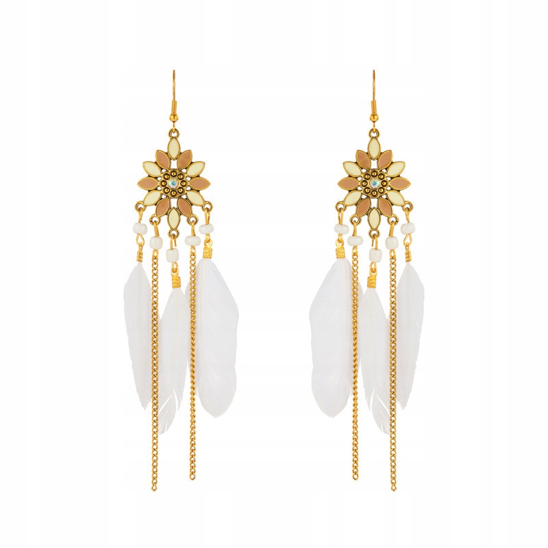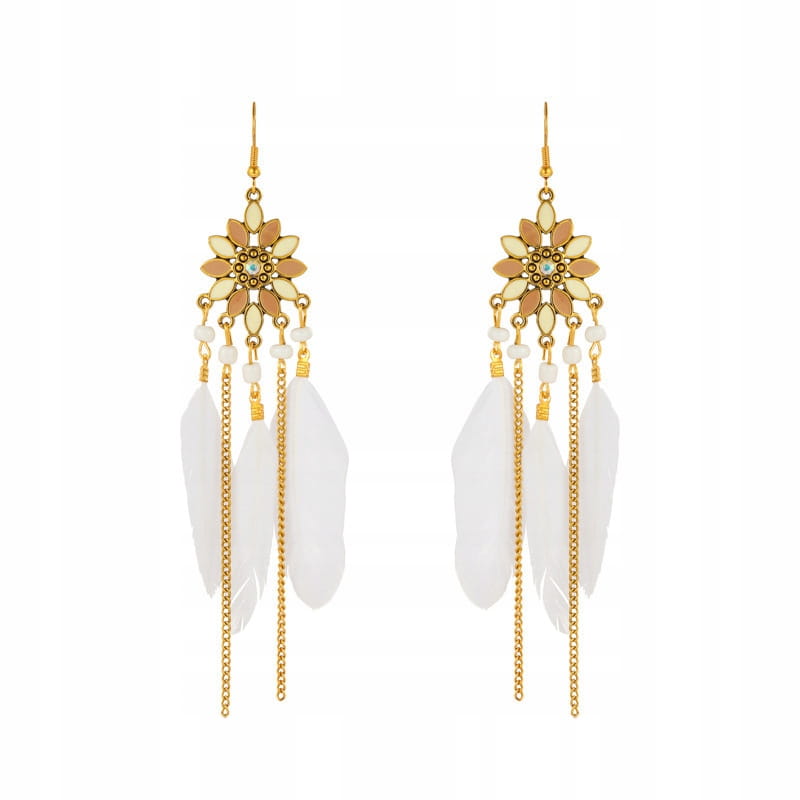 Kolczyki BOHO z białymi piórkami łańcuszki długie