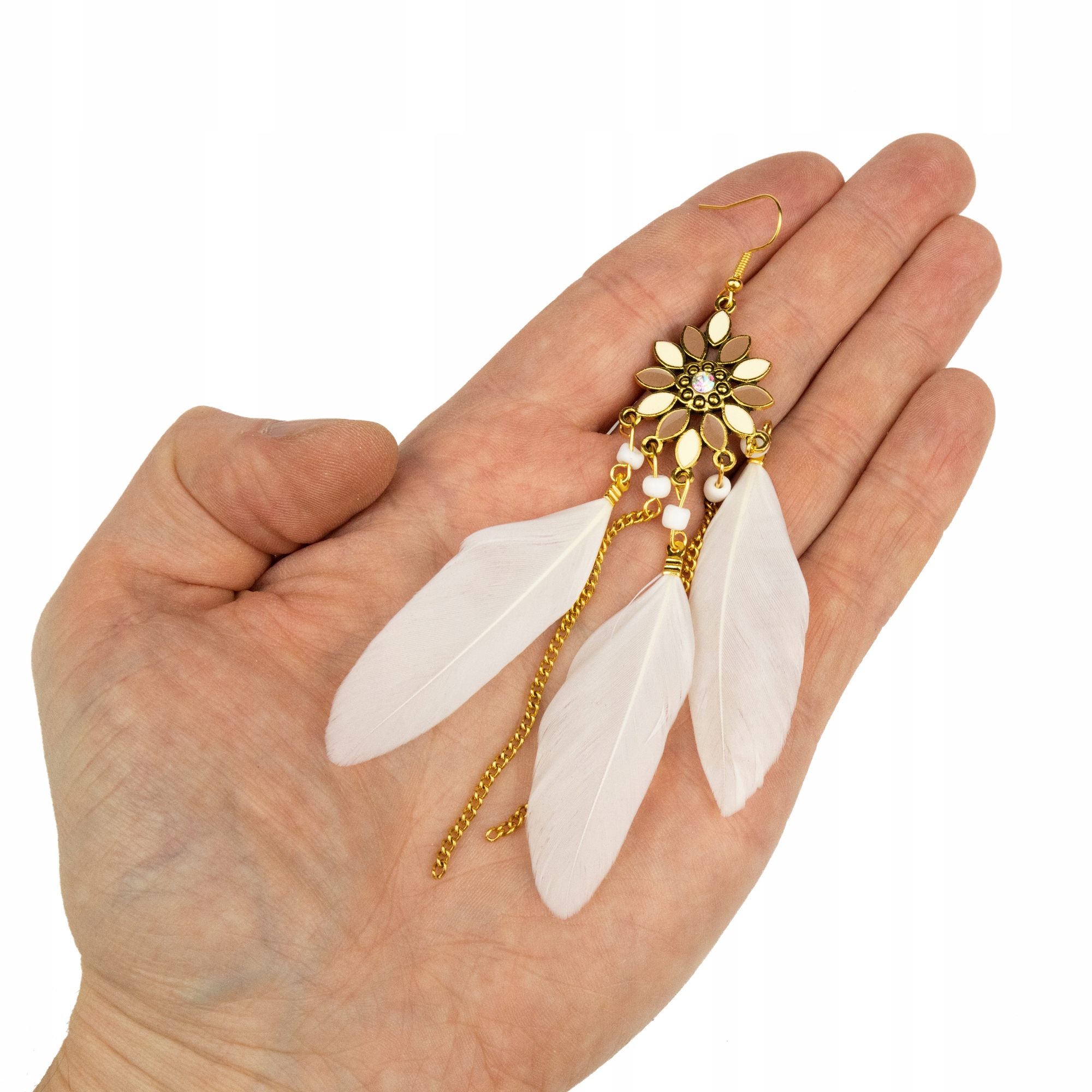 Urocze orientalne kolczyki BOHO - naturalne białe pióra z łańcuszkami