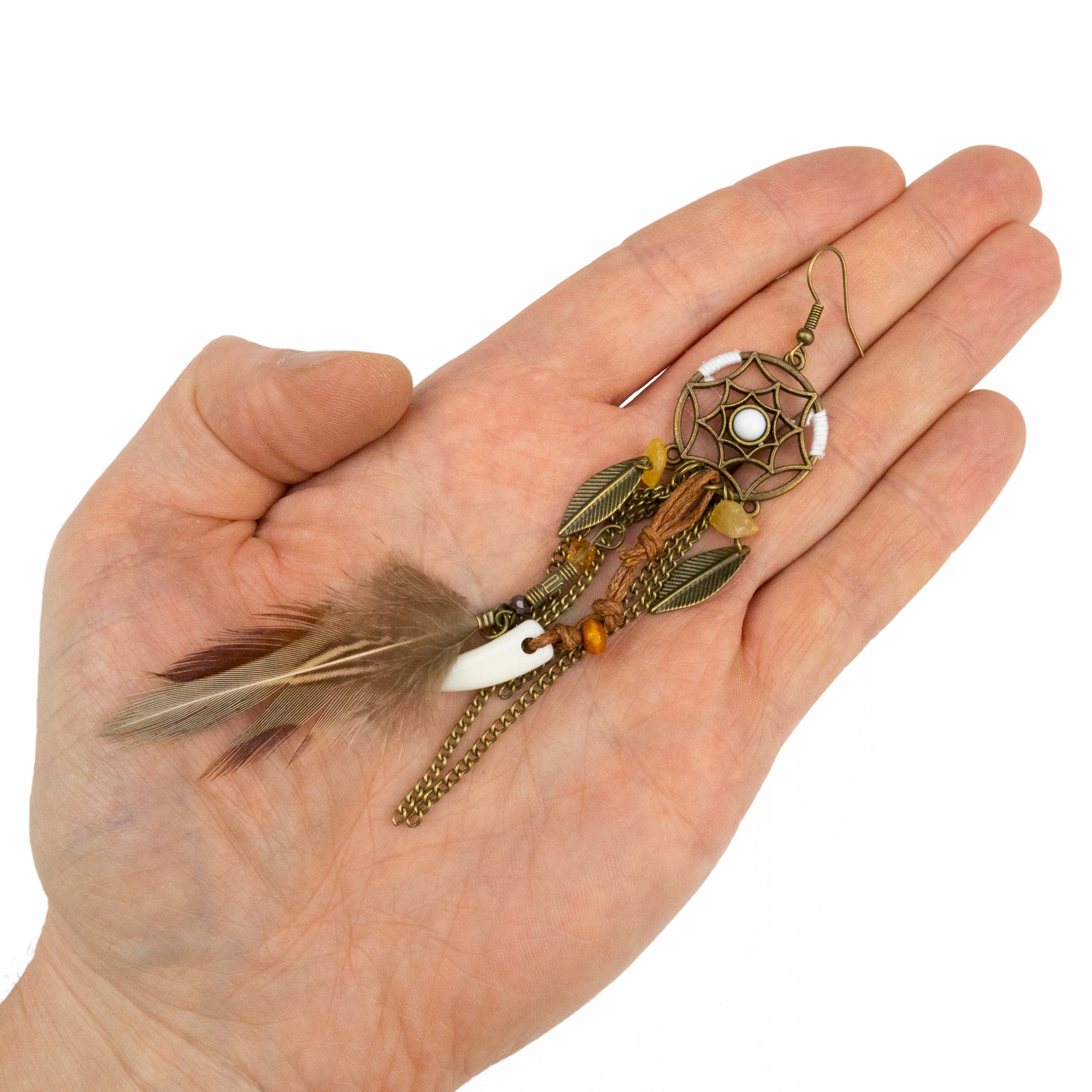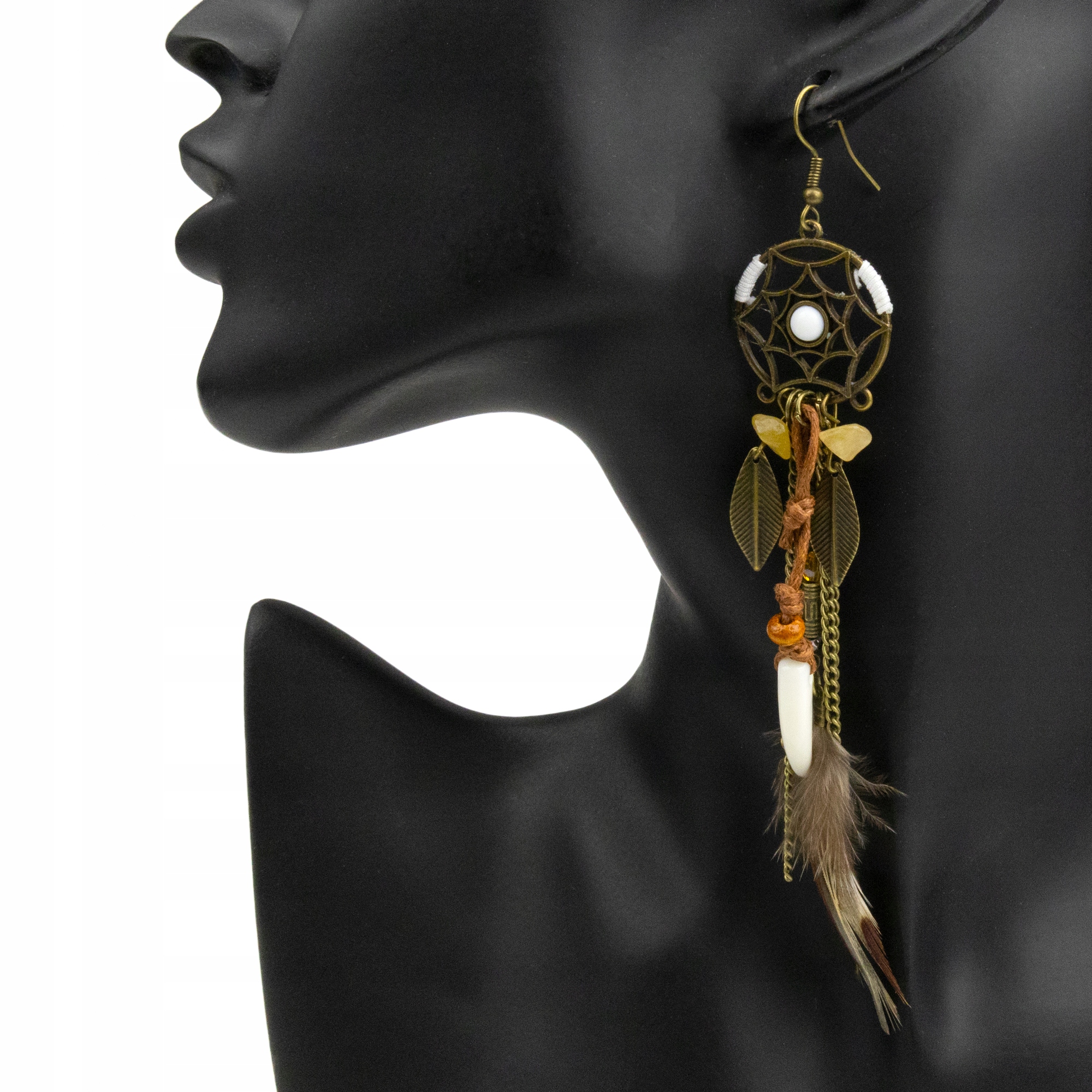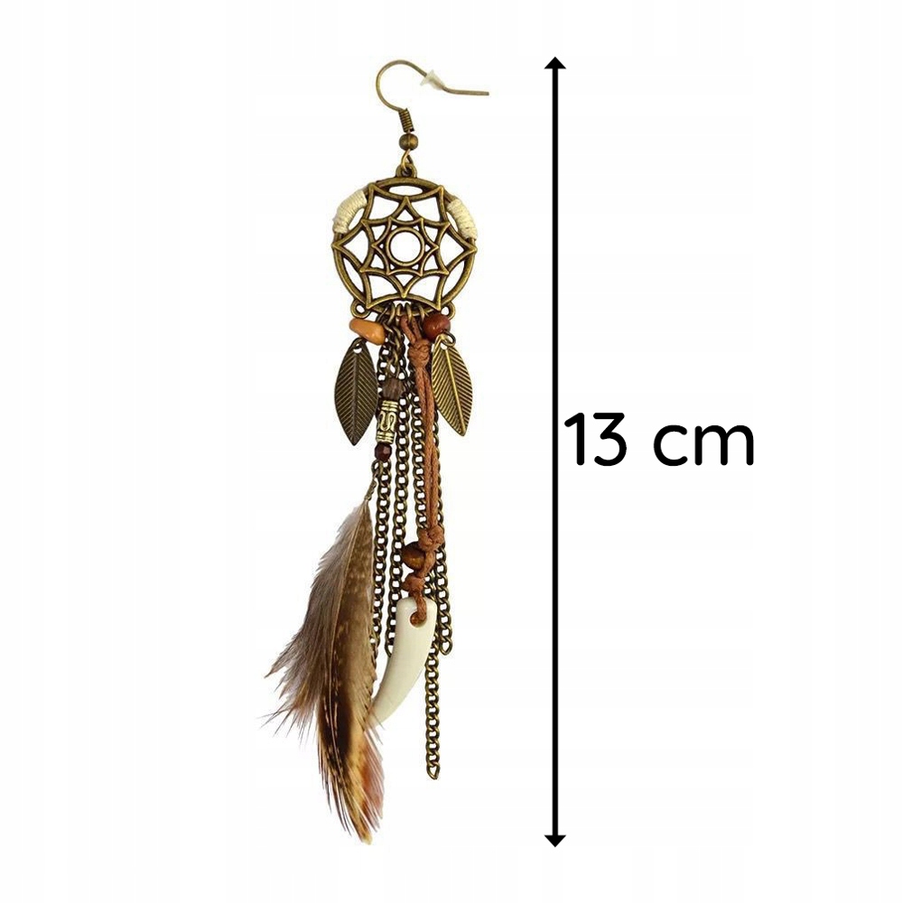 Urocze indiańskie kolczyki z listkami, piórkami, rzemykami i łańcuszkami