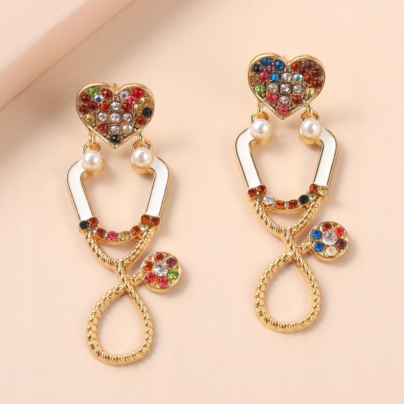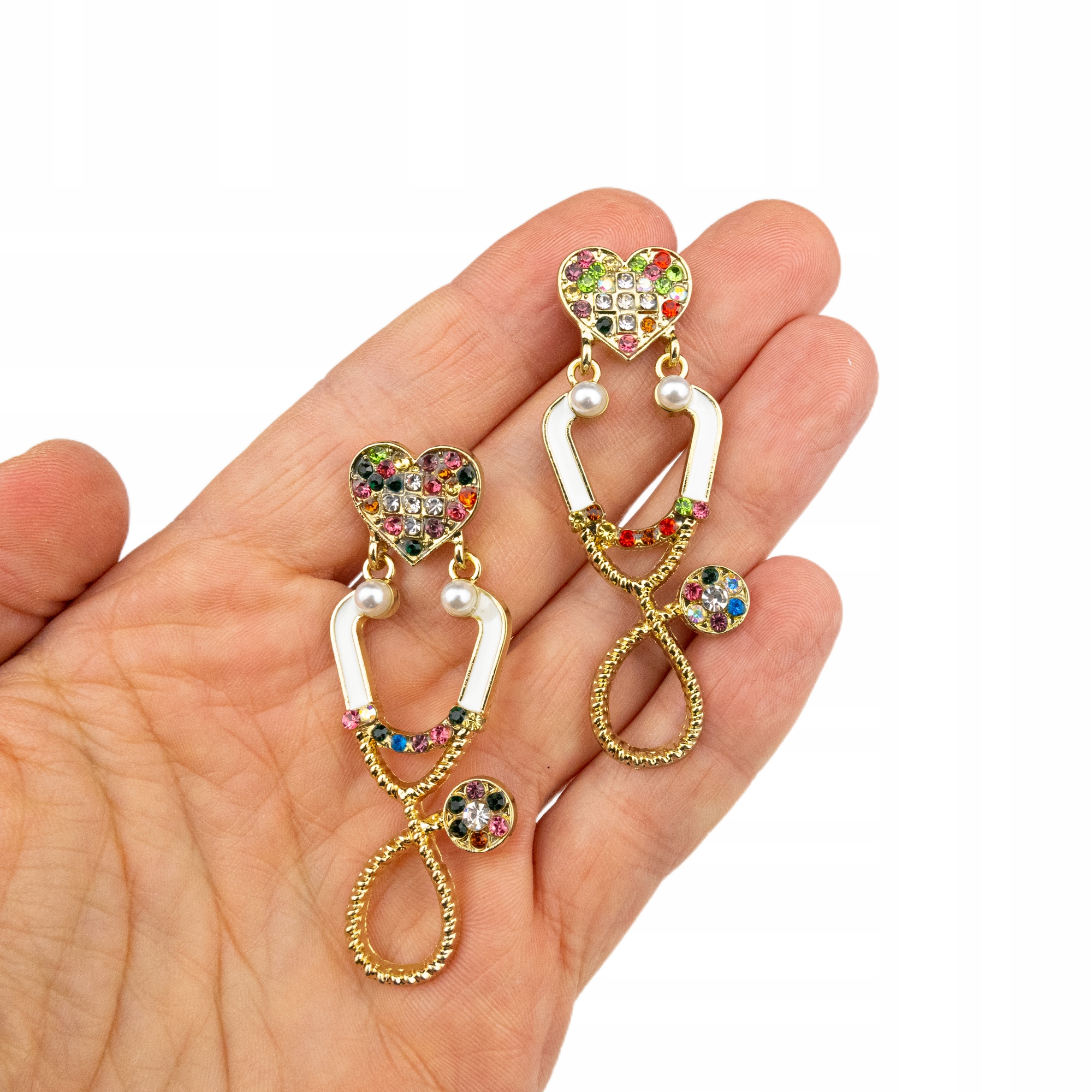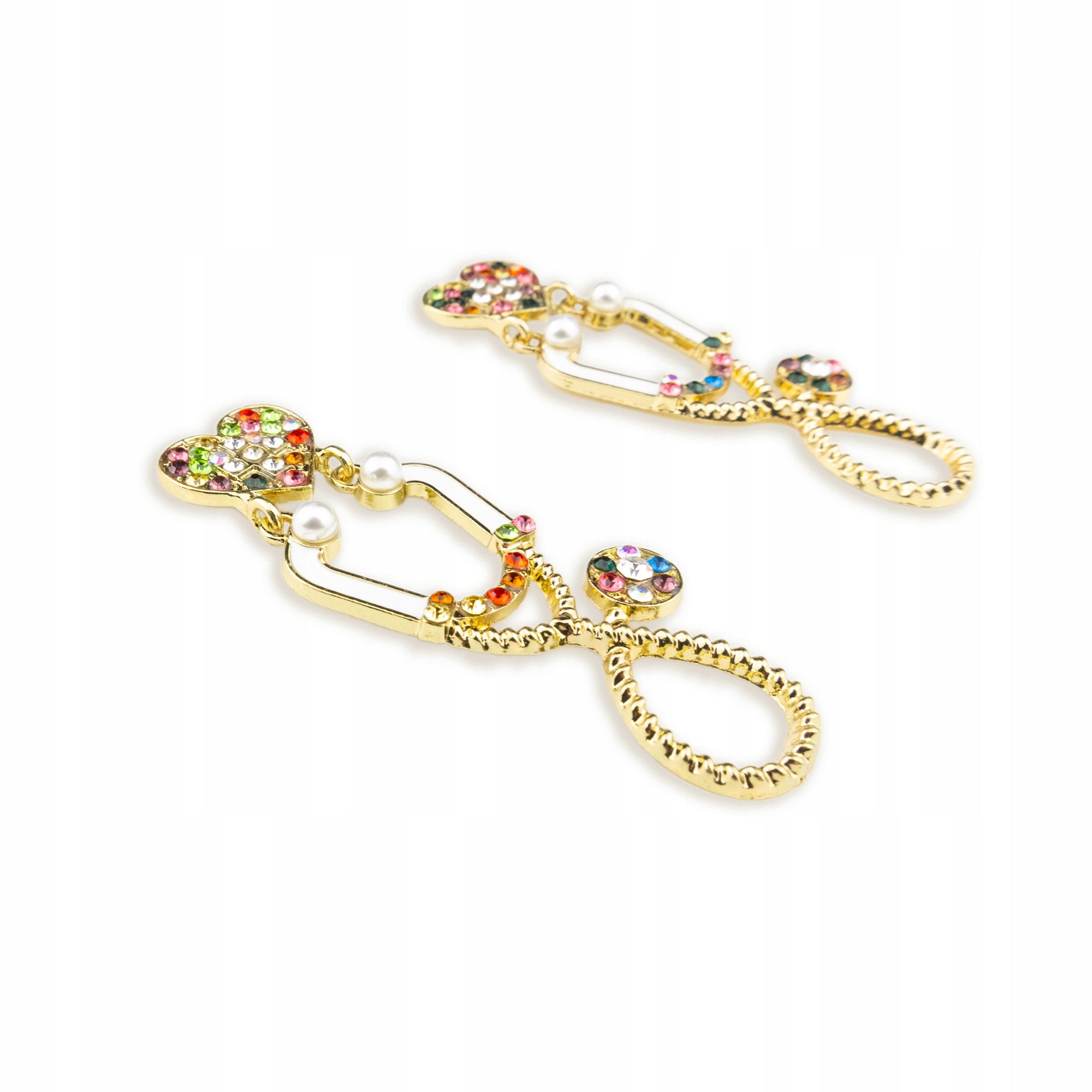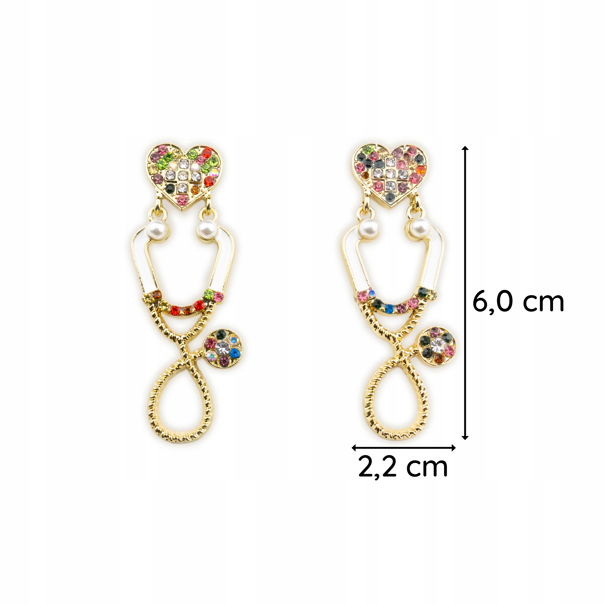 Kolczyki w kształcie stetoskopu z serduszkiem, kolorowymi cyrkoniami i koralikami