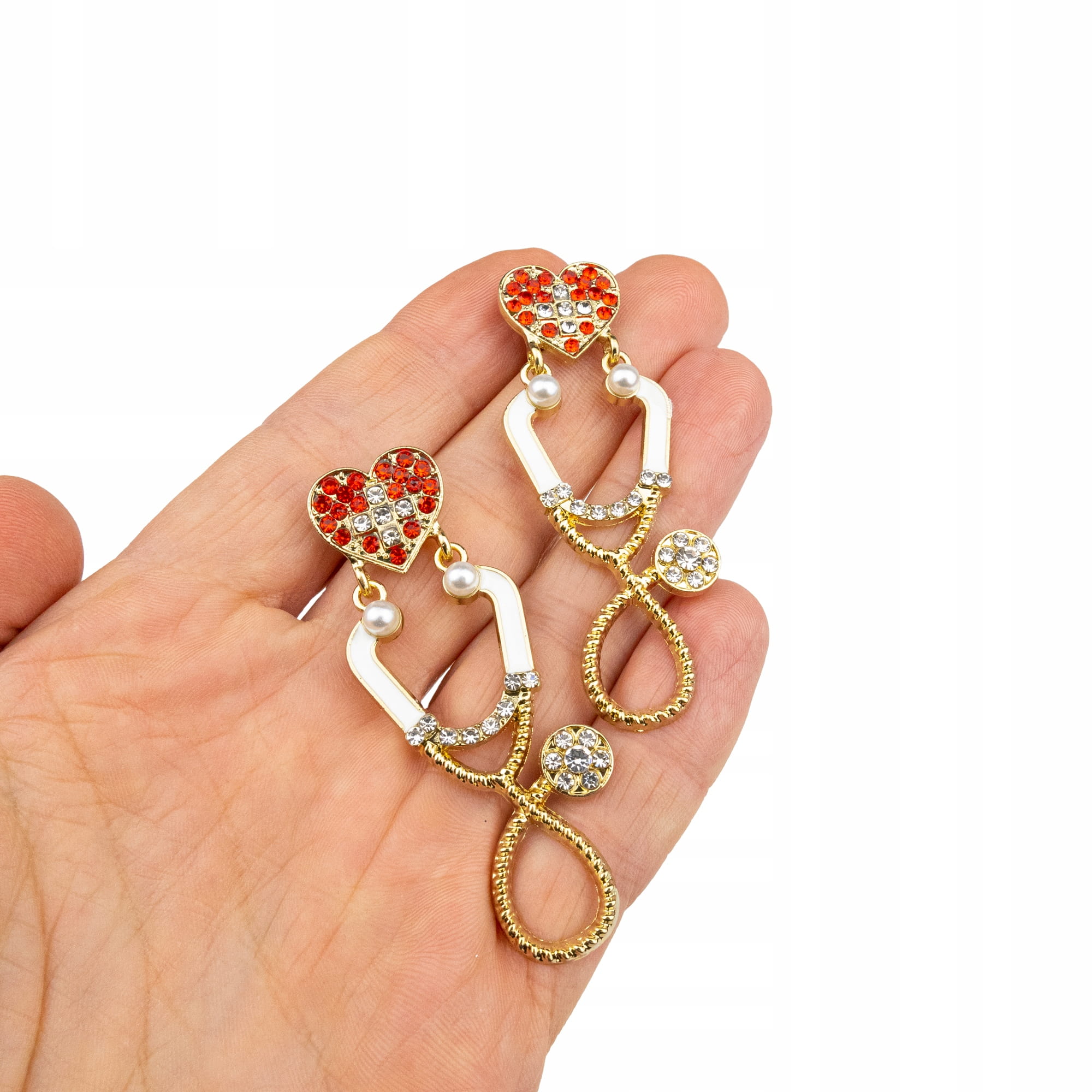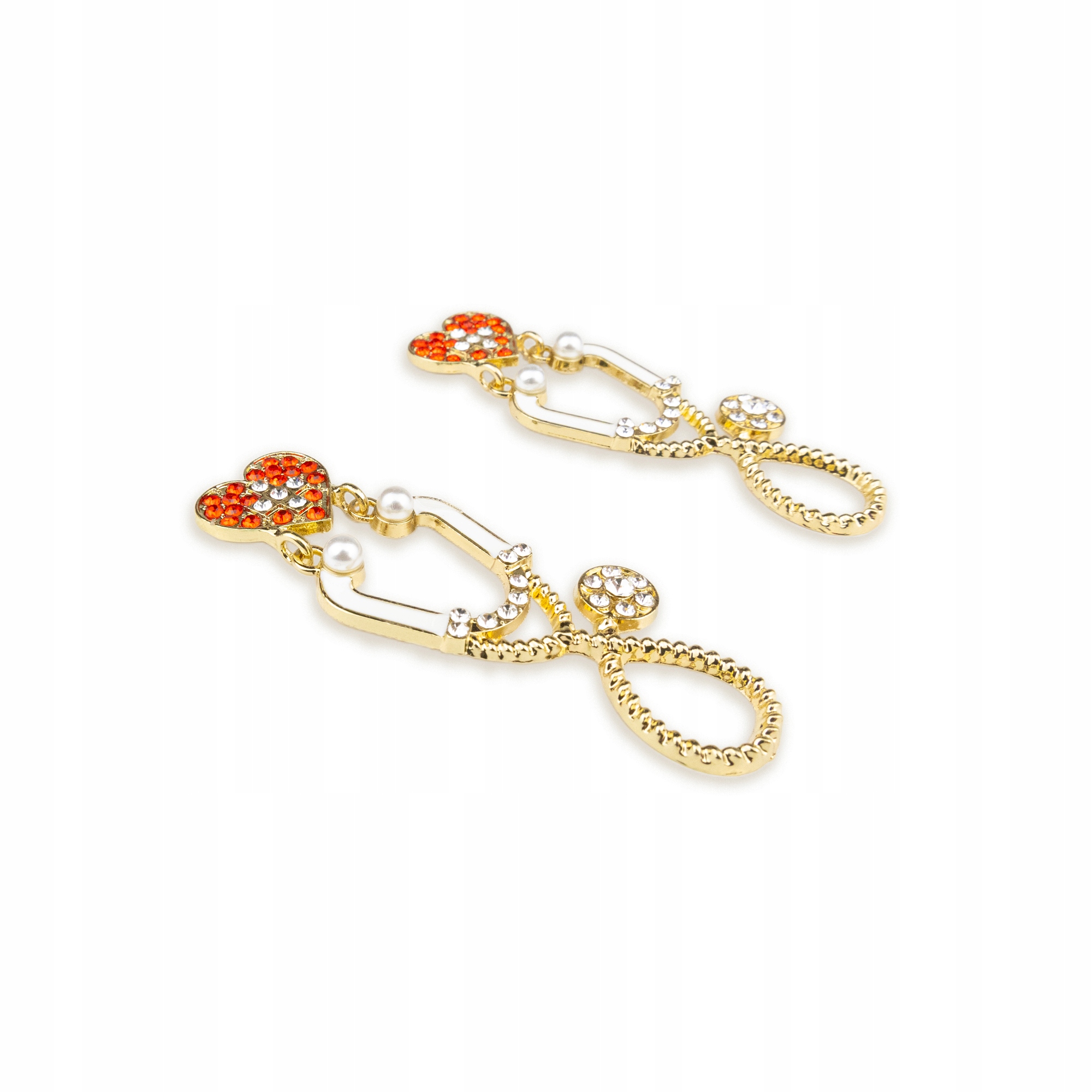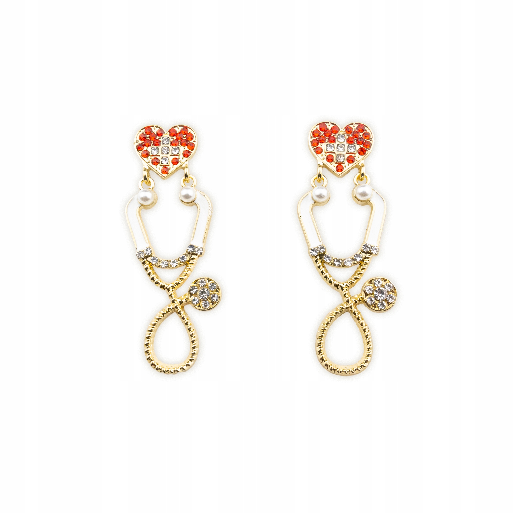Kolczyki w kształcie stetoskopu z serduszkiem, biało-czerwonymi cyrkoniami i koralikami