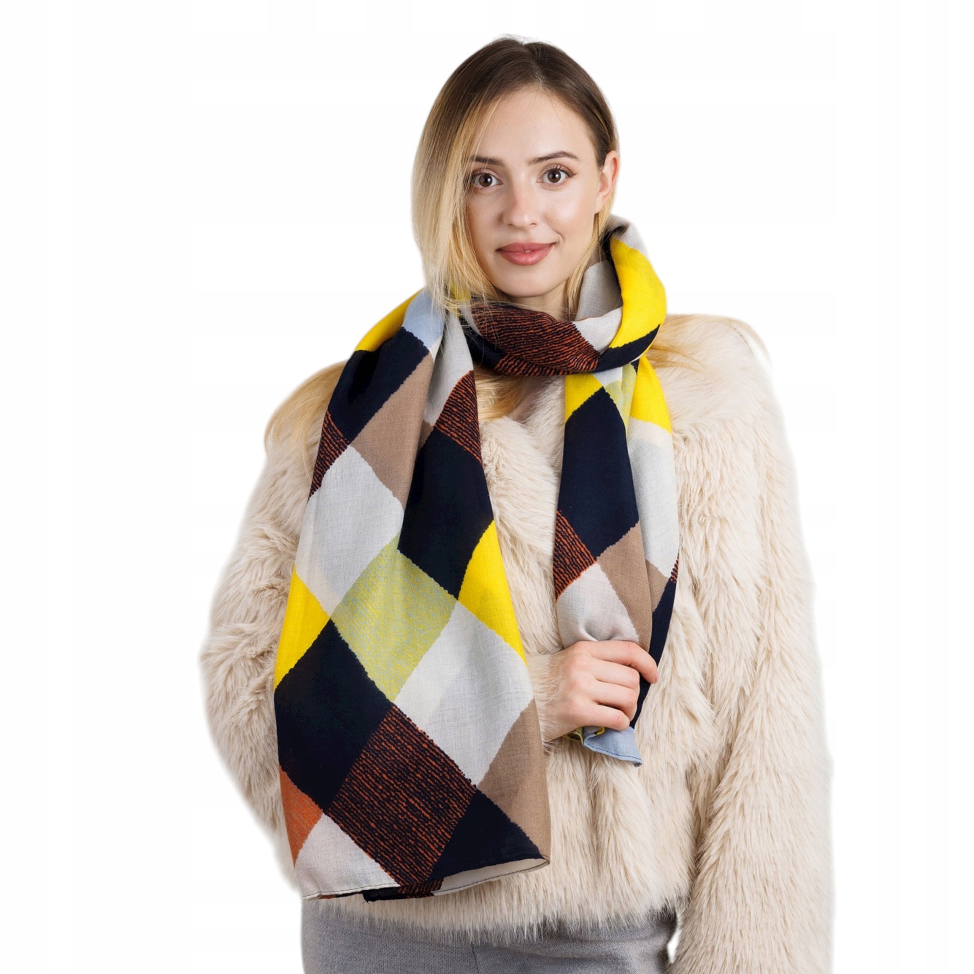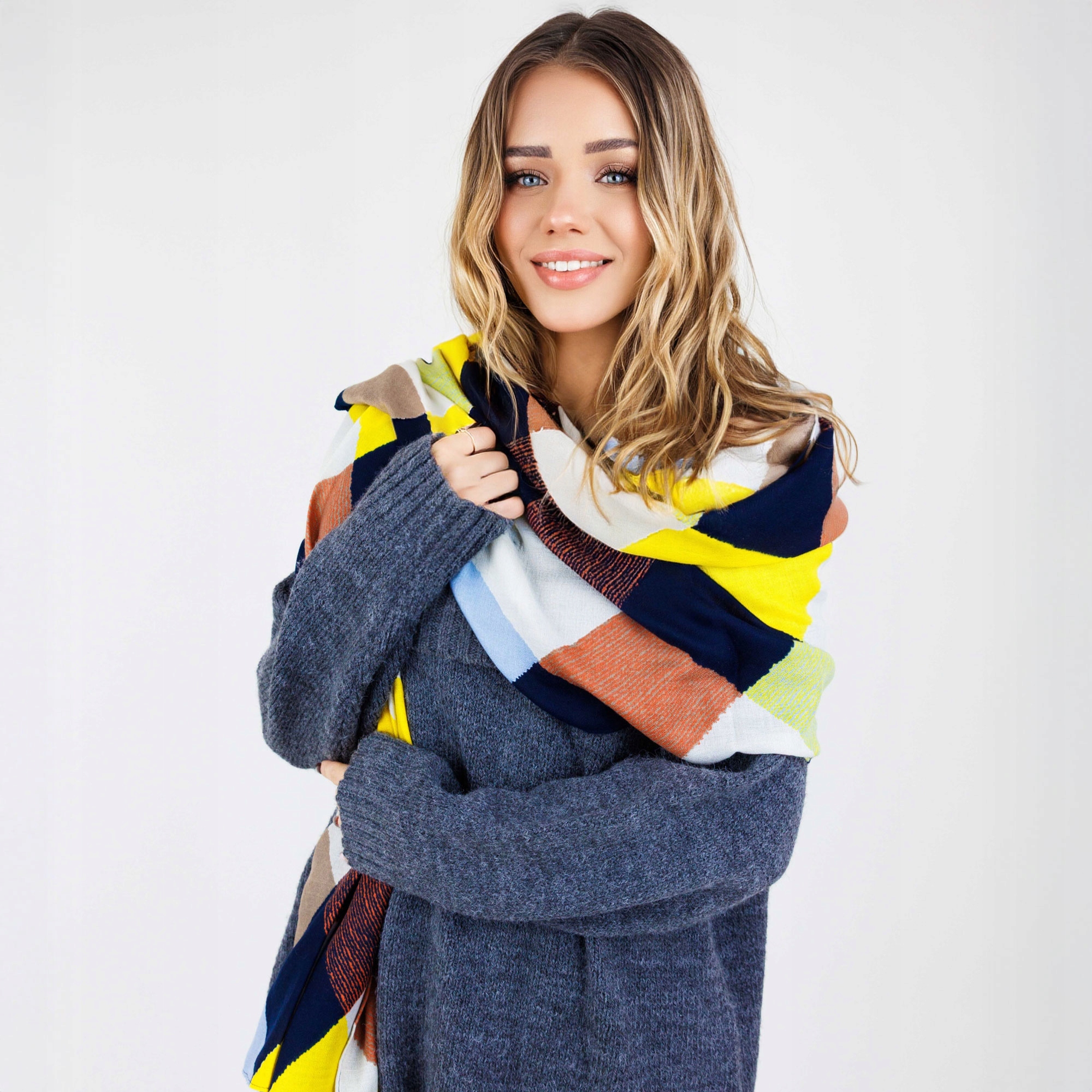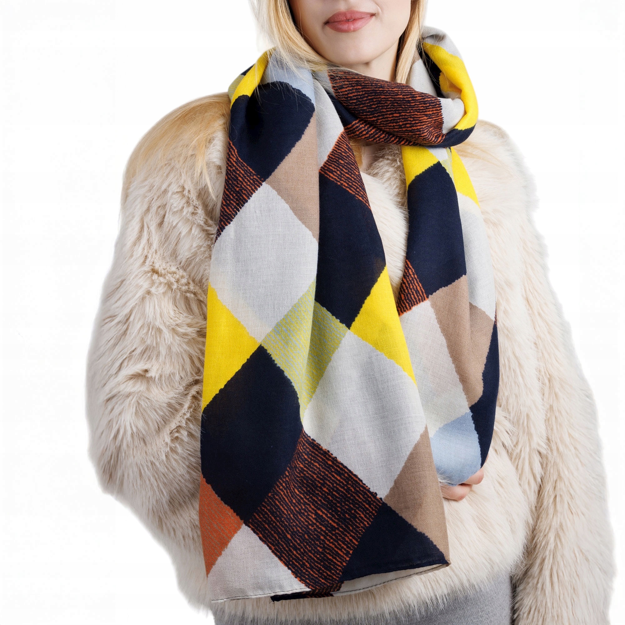 Kolorowy szalik damski z wiskozy – nowoczesny geometryczny wzór