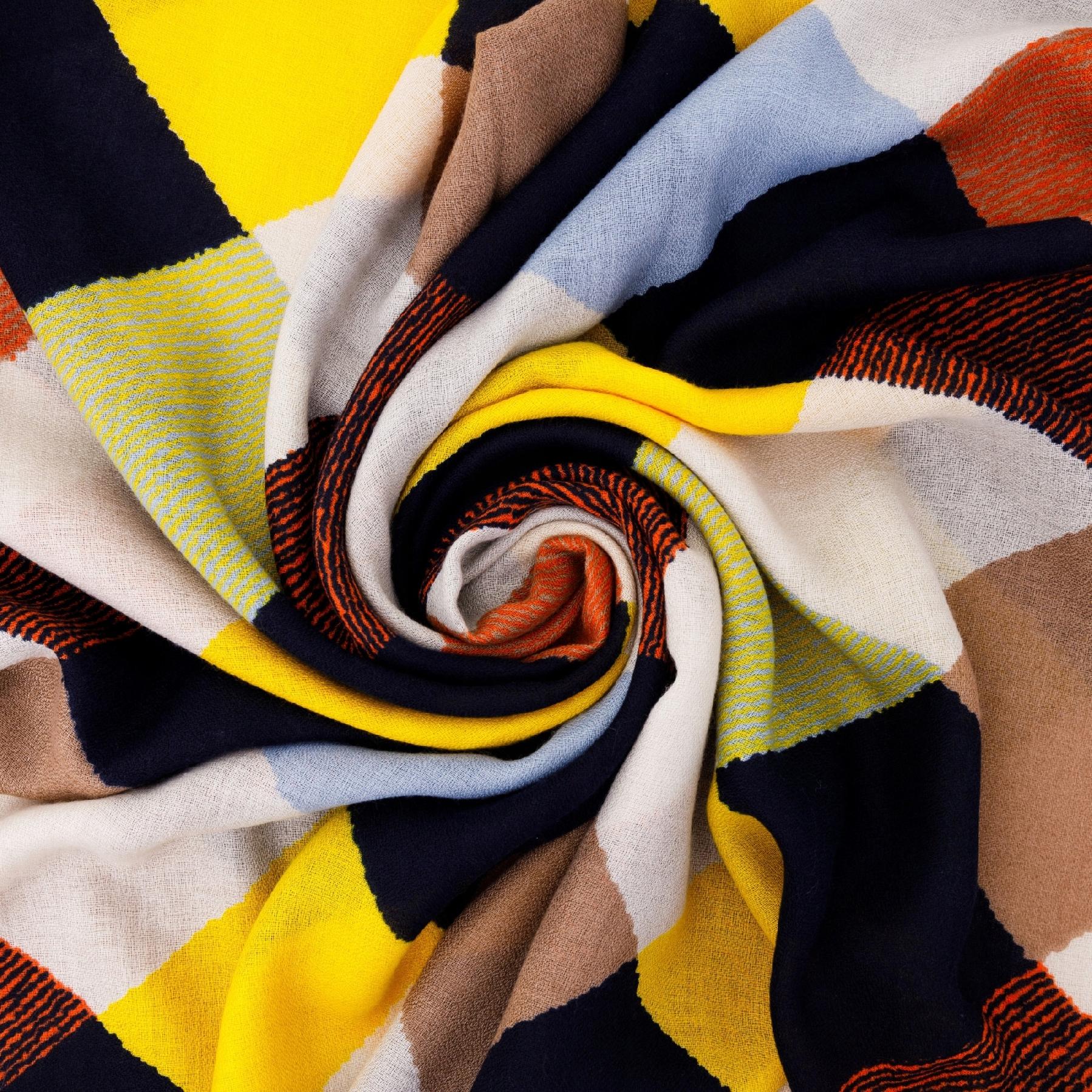 Stylowy i lekki szalik wykonany w całości z 100% wiskozy. Materiał jest przyjemny w dotyku, naturalny, przewiewny i bardzo komfortowy w noszeniu. Szal zdobi wyrazisty, geometryczny wzór w modnych kolorach: żółtym, granatowym, beżowym, błękitnym i pomarańczowym, co nadaje mu nowoczesnego i energetycznego charakteru.