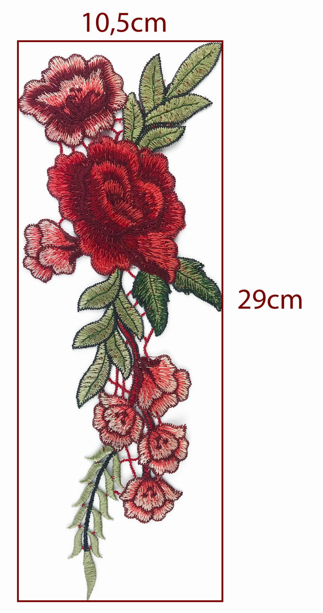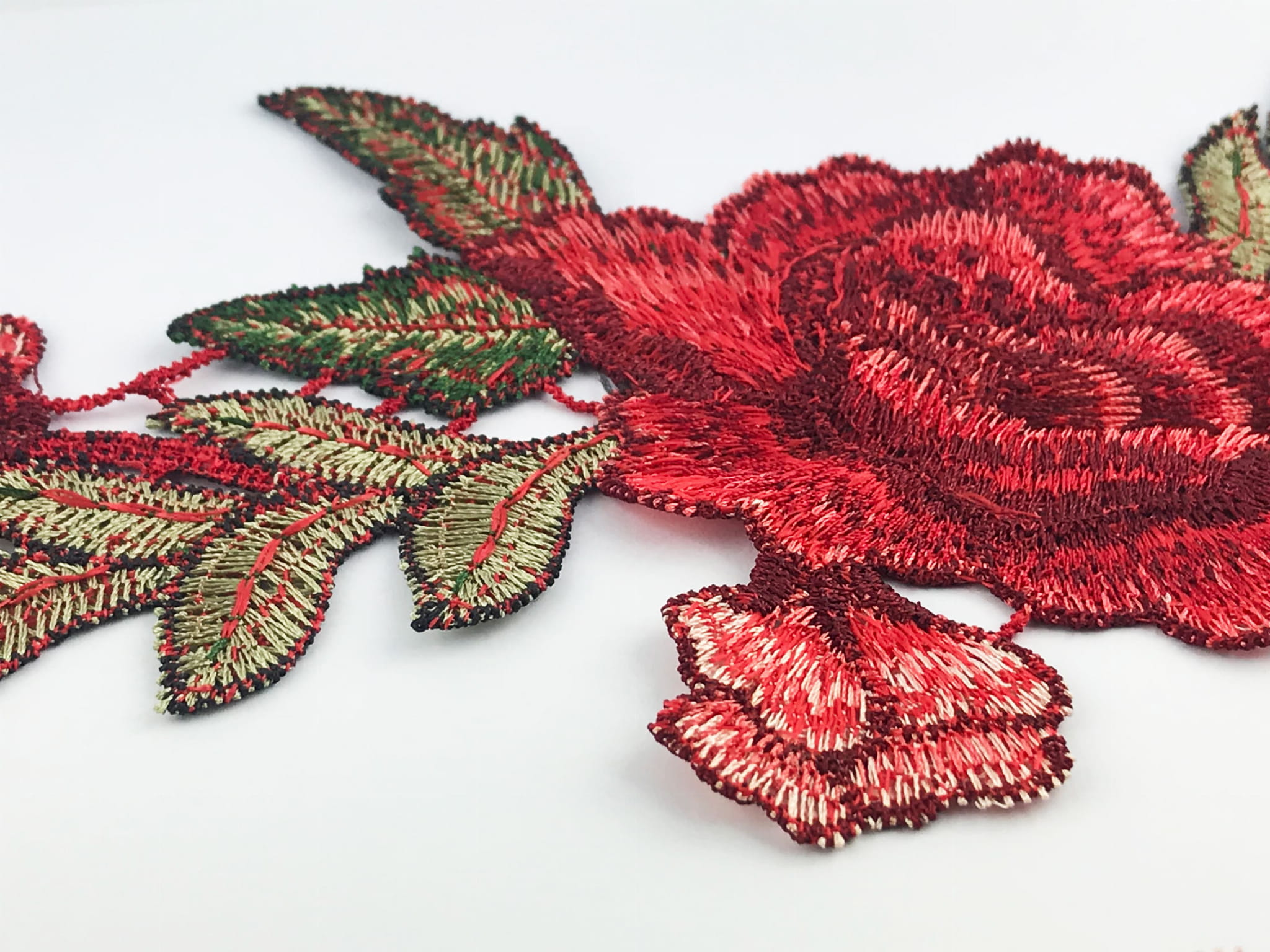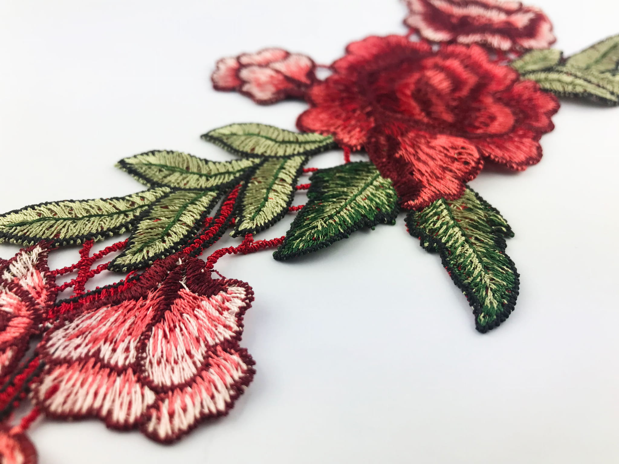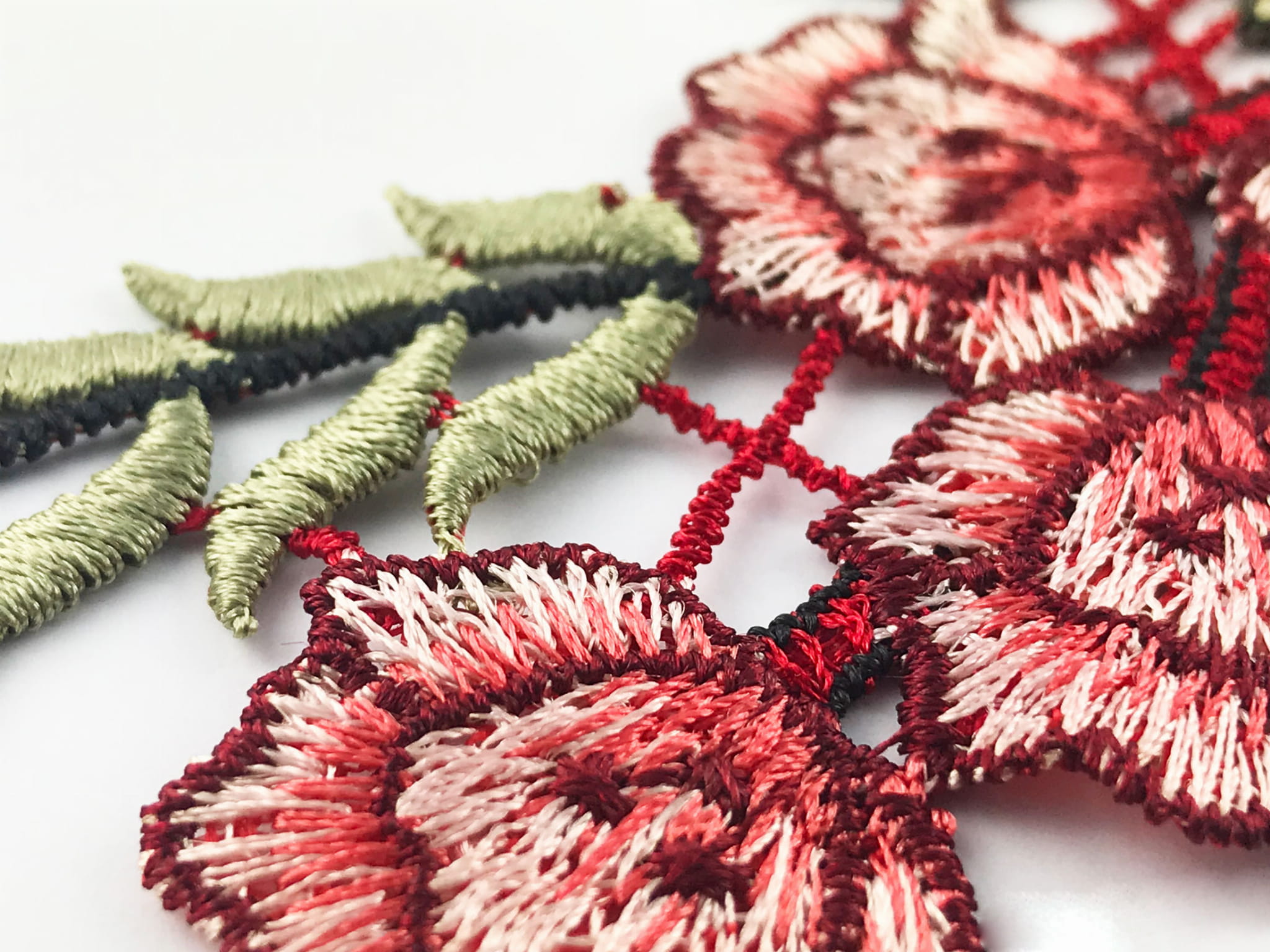 Żywe kolory cieniowanego zielonego i czerwonego haftu.