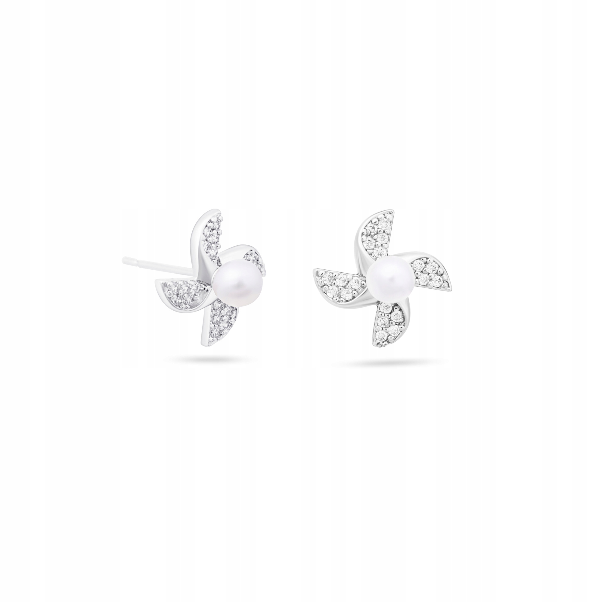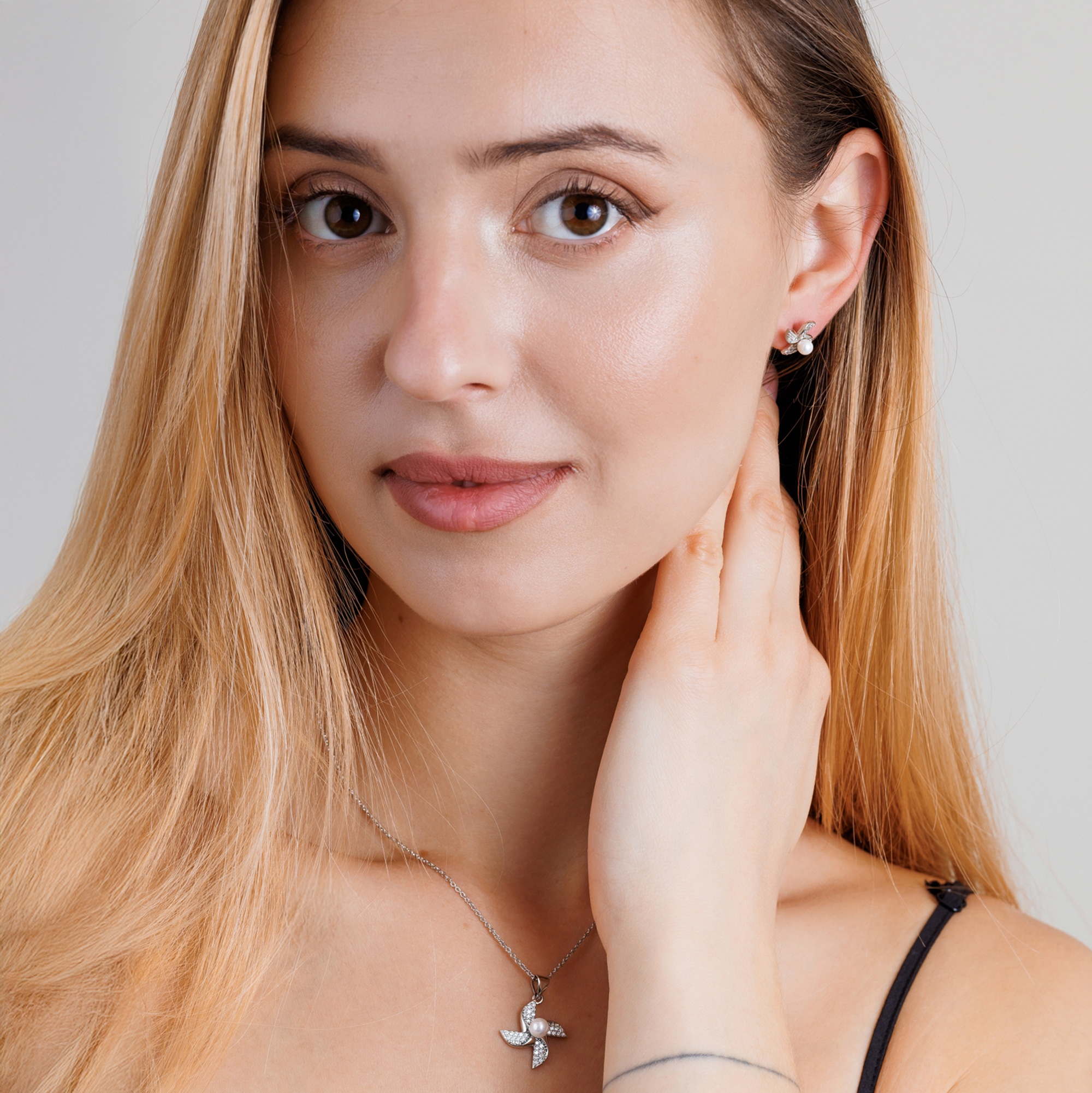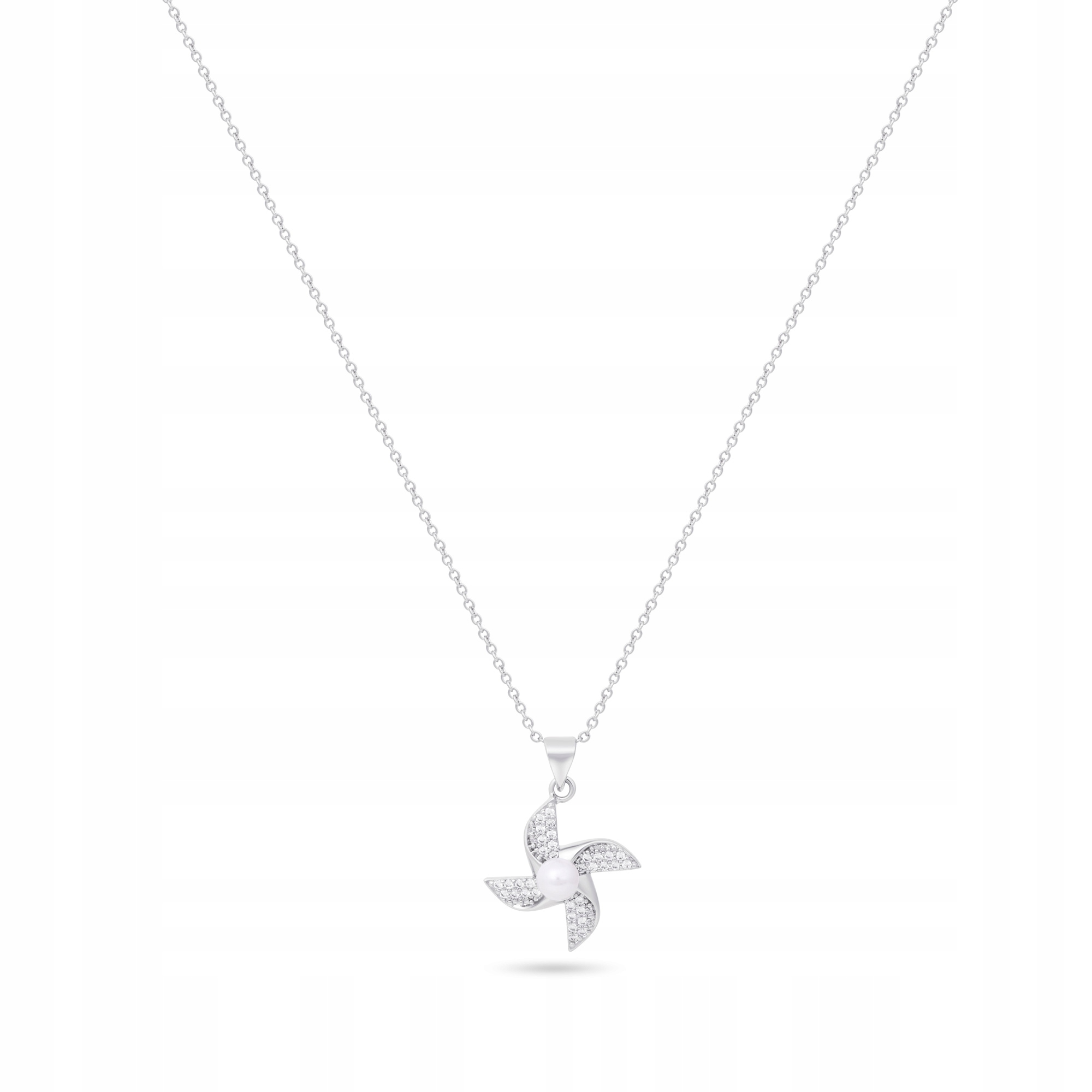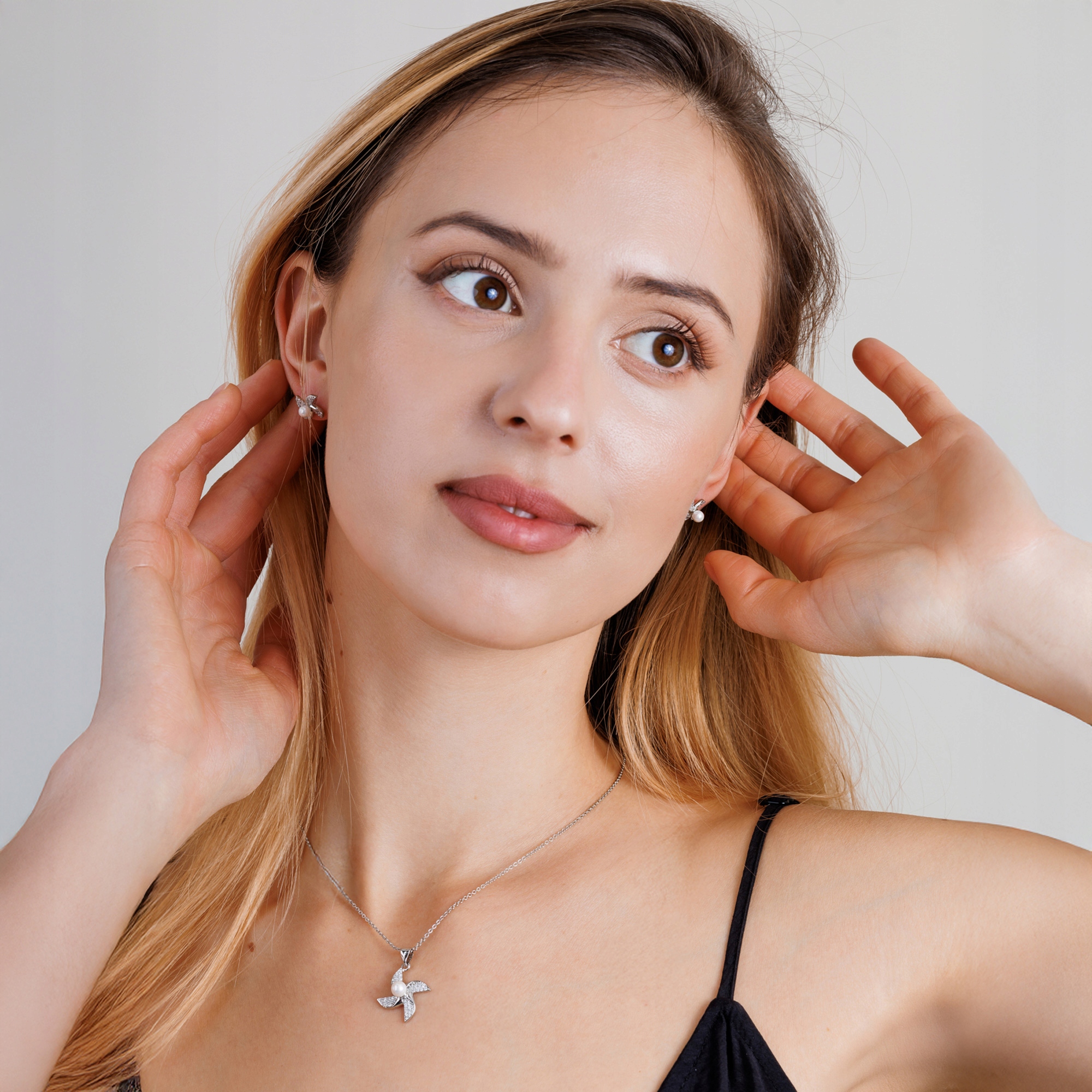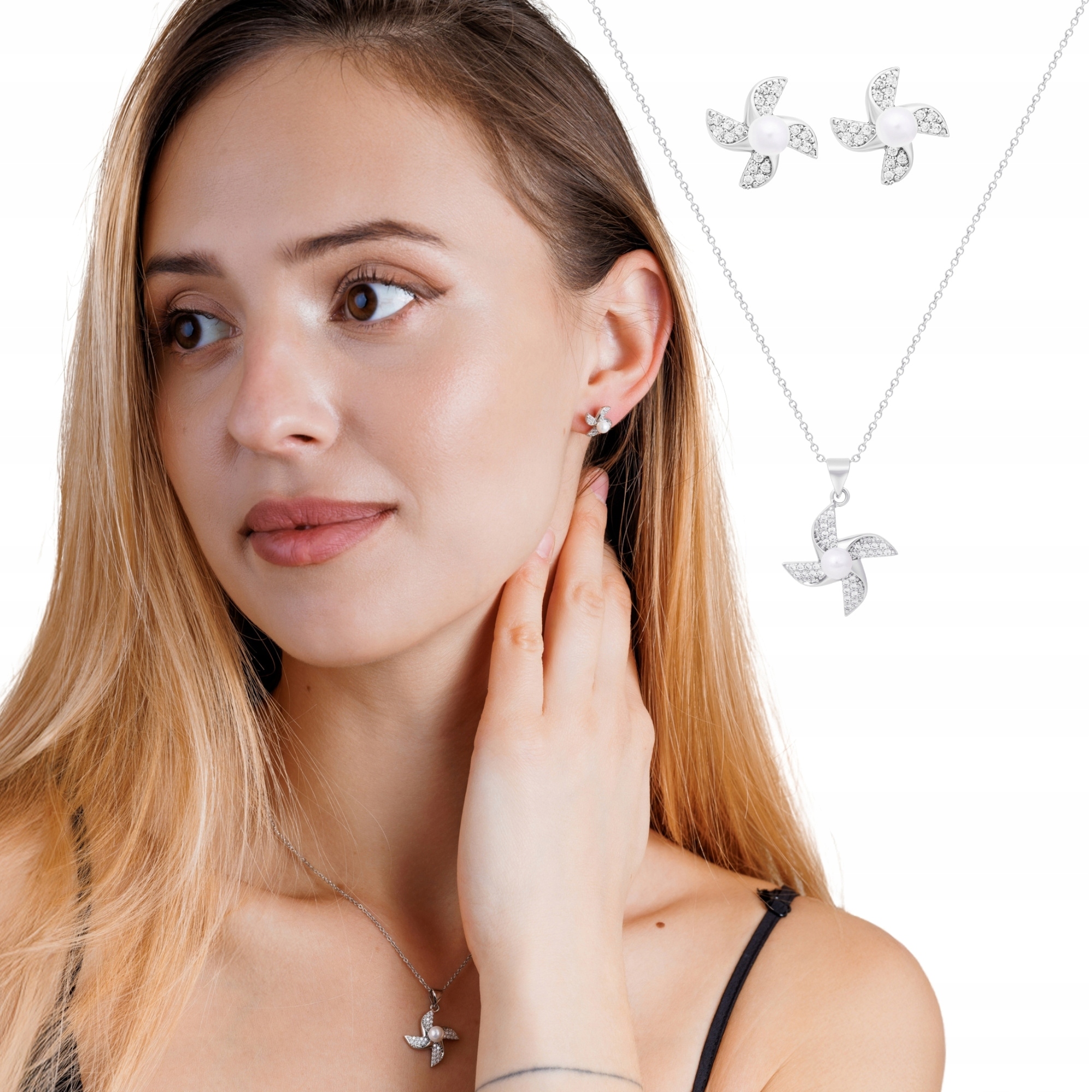 Komplet biżuterii kwiat wiatraczek – srebrny naszyjnik i kolczyki z perłą | Zestaw damski