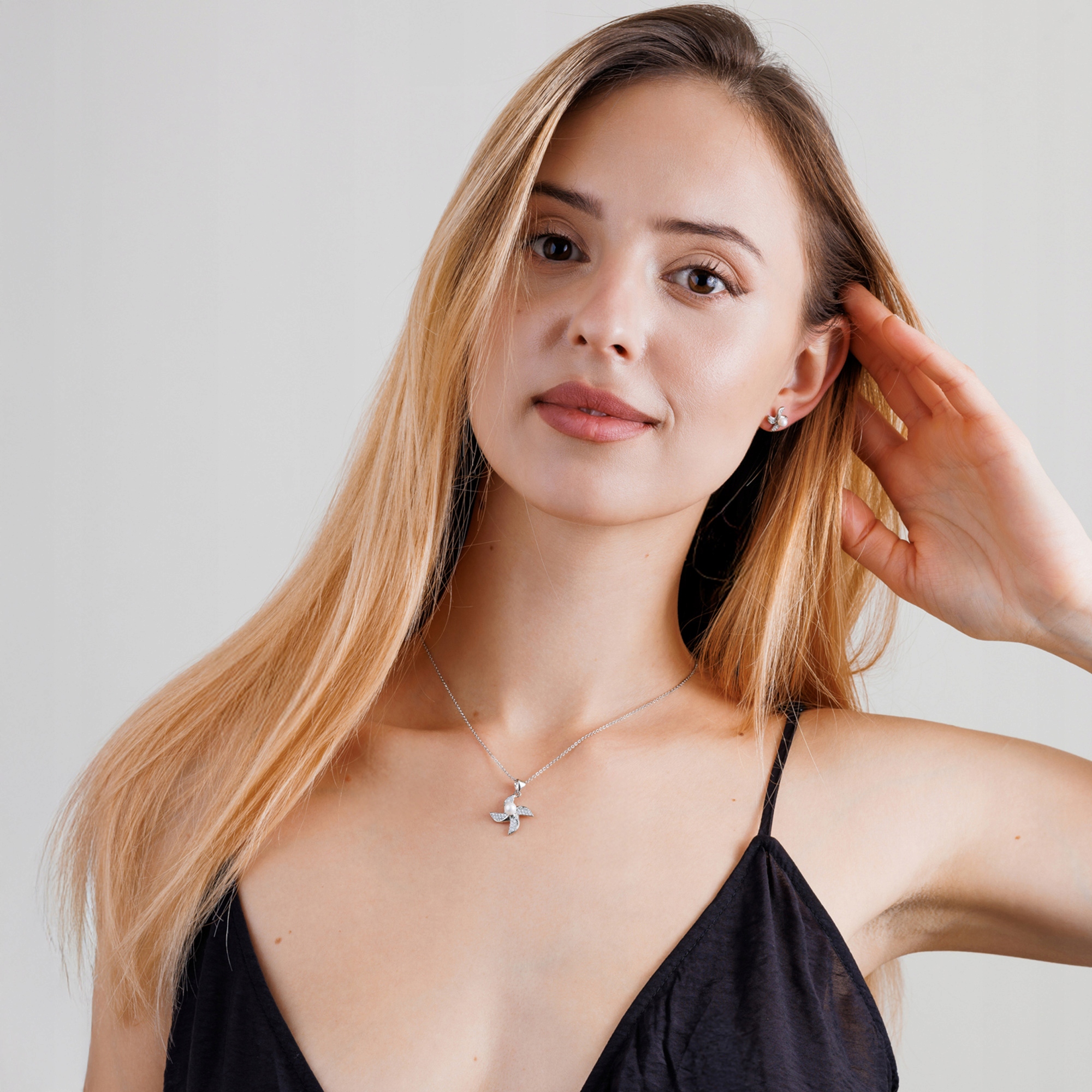 Delikatny i nowoczesny komplet biżuterii inspirowany motywem kwiatowego wiatraczka. Subtelna forma połączona z eleganckim blaskiem sprawia, że zestaw doskonale uzupełni zarówno codzienne stylizacje, jak i bardziej wyjątkowe okazje.