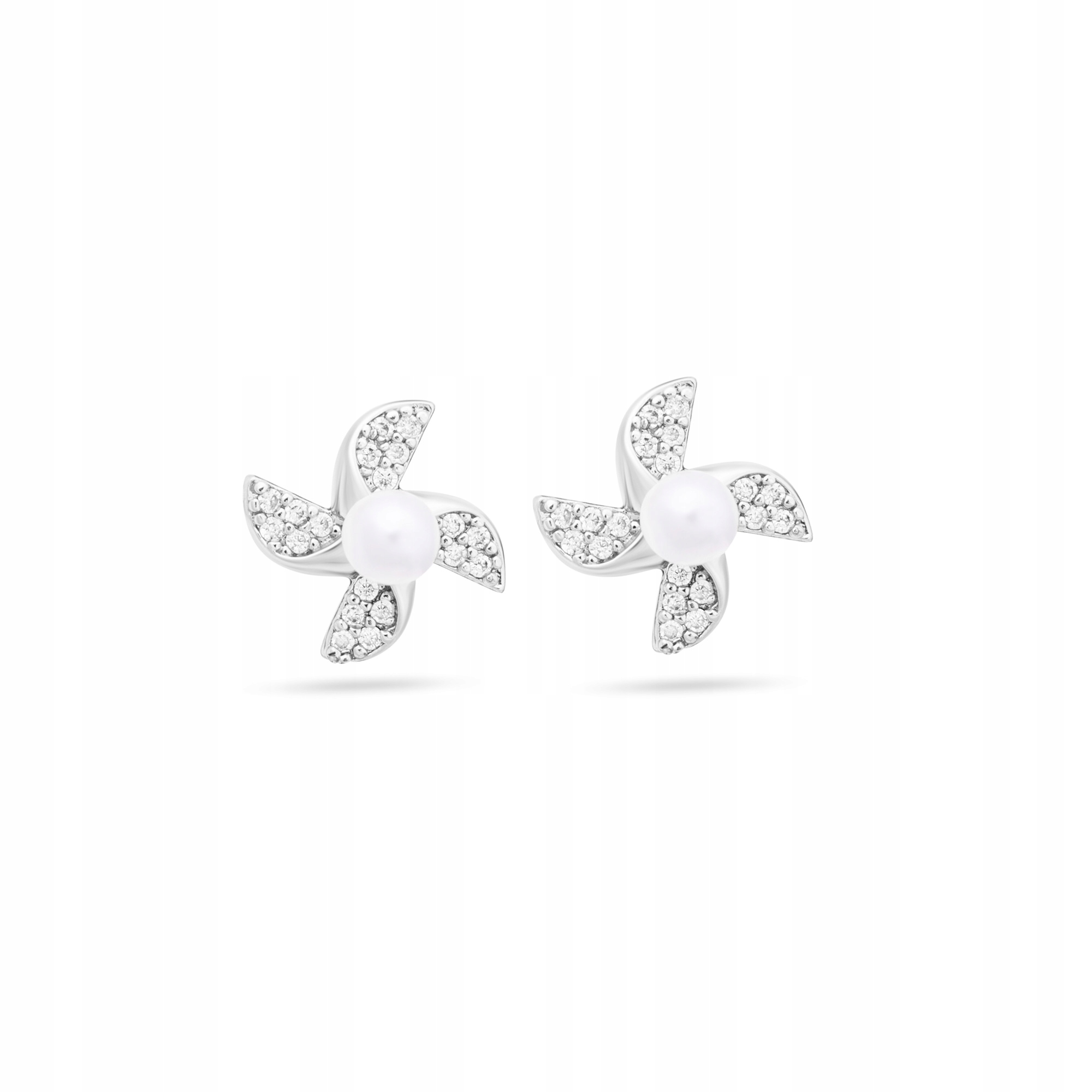 Komplet składa się z naszyjnika oraz kolczyków sztyftów. Centralnym elementem jest biały, perłowy kamień, otoczony dekoracyjnymi ramionami wysadzanymi drobnymi, lśniącymi cyrkoniami. Srebrny kolor nadaje biżuterii lekkości i ponadczasowej elegancji.